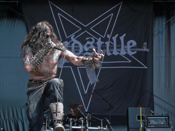 Wo lächerliche Stahlhelmträger über's Festival hüpfen, da kann auch Endstille nicht weit sein. Und siehe da, in prallster Mittagssonne kam die Band auch schließlich aus dem Backstage gekrochen, um genretypisch verschmiert und vernietet das eigene Programm durchzuziehen. Neben älteren Liedern gab's angeblich auch "Hate Me...God?" vom frisch erschienenen Album "Verführer" zu hören. Viel Unterschied machte das für mich allerdings nicht: Zwar rutschte die Hand des Gitarristen eifrig über das Griffbrett - am Ton änderte das aber kaum etwas. Auch der Rest des Publikums reagierte eher verhalten; ein einsamer Crowdsurfer schwebte kurzzeitig durch die Luft und plumpste irgendwo weit vorm Ziel zu Boden. Er könnte genausogut eine Allegorie auf das Konzert gewesen sein.