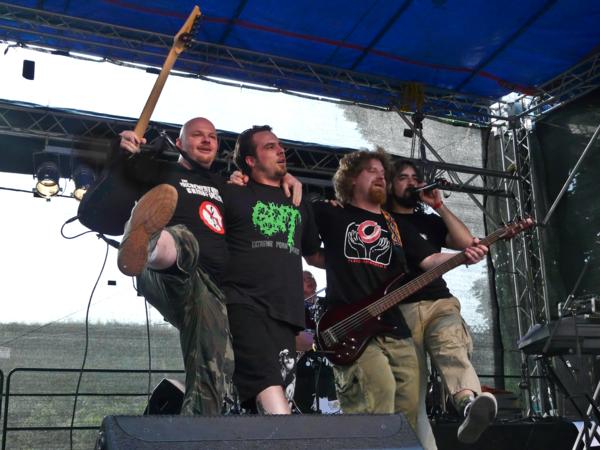 Die Sonne war längst zurückgekehrt, doch die Excrementory Grindfuckers ließen noch auf sich warten. "Haltet eure Muschis feucht, wir sind gleich da!" Nach schier endlosem Soundcheck waren sie das dann auch. "Back in Anal Territory" - und das mit aller Gewalt! Vom ersten Moment an konnte man sich vor fliegenden Wasserflaschen und dem dicken, wütenden Moshpit vor der Bühne kaum retten, und die Grindfuckers machten das mit ihren feixend vorgetragenen Schlager-Grind-Persiflagen nicht besser: Neben obligatorischen Feierliedern wie "Ein bisschen Grind muss sein", "Du hörst kein Grind" oder "Vater Morgana" gab's auch etwas "Band-Bashing", indem man die etwas trägen Zuschauer auf den oberen Burgrängen als "Endstille-Fans" abstempelte und sie mit Buh-Rufen und ausgestreckten "up-yours"-Fingern bedachte. Wem dann nach 16 Liedern und dem abschließenden "Final Grinddown" noch ein paar Zähne im Kiefer geblieben waren, dem gaben die Grindfuckers mit der Zugabe "Staatsgrind Nr. 1" endgültig den Rest. Feist!