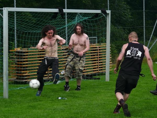 Wir melden uns live vom Tor neben der Stage, wo Alestorm gerade den Umbau vor Equilibrium nutzt, um Varg beim Fußball das Fell über die Ohren zu ziehen. Besonders Torwart Christopher brilliert mit einer Glanzparade nach der anderen, während der Rest der Band sein übriges tut, um das Leder ins gegnerische Netz zu dreschen. Am Ende gewinnen die Wölfe der See - nach meiner Zählung - mit 3:1. Sollte das mit der Piraterie also eines Tages nicht mehr lukrativ genug sein - eine Bewerbung um Aufnahme in die schottische Nationalmannschaft wäre den Versuch sicher wert.