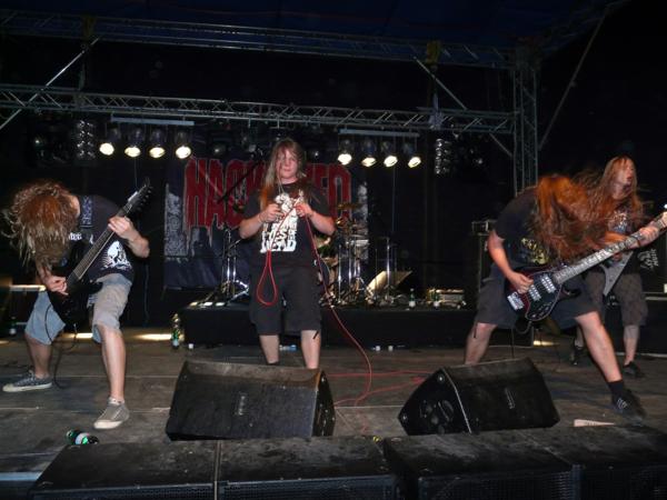 Die noch sehr jungen Death Metaller von Hackneyed ließen einen ordentlichen Mix aus ihren beiden Alben hören. Von ihrem inzwischen erschienenen Album "Burn After Reaping" gab es laute Hörproben z.B.: "March of the Worms", "Finger on the Trigger" und "Weed Flavoured Meat", die bei den Fans verdammt gut ankamen und zu wildem Mattenfliegen führten. Aber auch vom Vorgänger "Death Prevails" gab es einiges zu hören: "Symphony of Death" und "Neon Sun" riefen den einen oder anderen kleineren Moshpit hervor. Die Arbeit mit dem Publikum war astrein, nur kamen Ansagen wie "Das nächste Lied werden die meisten von unserer Myspace-Seite kennen" nur undeutlich an, da Sänger Philipp die Zähne dabei nicht auseinander bekam.