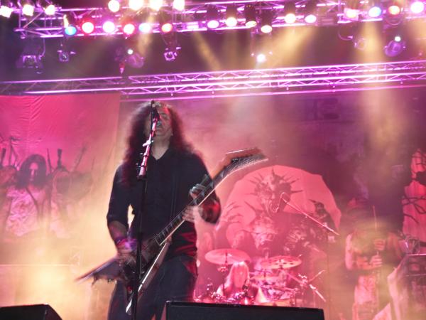 Endlich! Kreator standen auf der Bühne! Die Songauswahl war super, da aus allen Alben etwas herausgenommen wurde und die dazugehörigen Videos, soweit vorhanden, auf einer riesigen Leinwand hinter der Band gezeigt wurden. Los ging's mit "Hordes of Chaos", gefolgt von "Phobia", wozu die Band bei jeder Gelegenheit Pommesgabeln bis in die letzte Reihe erntete. Zu "Enemy of God" und "Pleasure to Kill" gab's nochmal einen richtig schönen Moshpit, bei dem sich die Fans auch noch die letzten Reserven aus dem Leib tobten. Danach verschwanden die vier erstmal von der Bühne um theatralisch wieder zurückzukehren und mit "Violent Revolution" die totale Vernichtung der erschöpften Meute einzuläuten. Bei "Extreme Aggression" gab es passender Weise die extreme Rückkopplung und den dazugehörigen extremen Moshpit. Eigentlich war die Band nun fertig, aber sie ließen sich doch noch zu einer Zugabe "hinreißen". Mit "Flag of Hate" und "Tormentor" verabschiedeten sich die Jungs und ließen auf der Leinwand nochmal die 80er Jahre aufleben, indem sie Ausschnitte aus der Bandgeschichte zeigten.