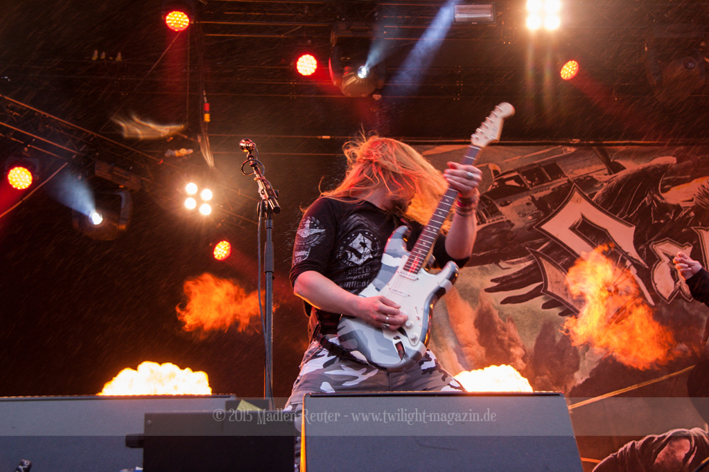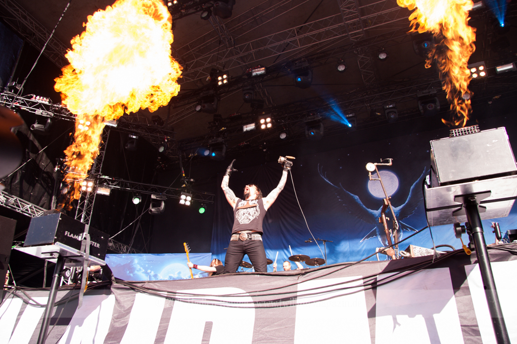 Zeit für den Headliner dieses Tages. Diese Ehre wurde den Schweden von SABATON zuteil. Bei dieser Show sollte der neue Panzer, der den wundervollen Namen „Walther“ trägt, seine Bühnenpremiere feiern. Der Andrang vor der Bühne war gewaltig, und die Luft knisterte vor Spannung. Wie man es nicht anders kennt, bot die Band eine energiegeladene Show sondergleichen. Vor allem Basser Pär und Sänger Joákim, flogen regelrecht über die Bühne. Da sich im Repertoire der Band wohl ein Song zur Geschichte jeden Landes befindet, gestaltete sich die Setlist dementsprechend. Aus diesem Grund fand „Talvisota“ großen Anklang bei den Finnen. Auch forderten sie „Gott Mit Uns“ in Schwedisch zu hören. Diesem Wunsch kam die Band mit großer Freude nach. Neben guter Musik boten die Fünf auch ein breites Sortiment an Feuerwerk und Flammenwerfern. So wurde dem Publikum gleich doppelt eingeheizt. Trotz anfänglicher Probleme mit dem Mikrofon wandelte der Auftritt sich zu einem würdigen Tagesabschluss.