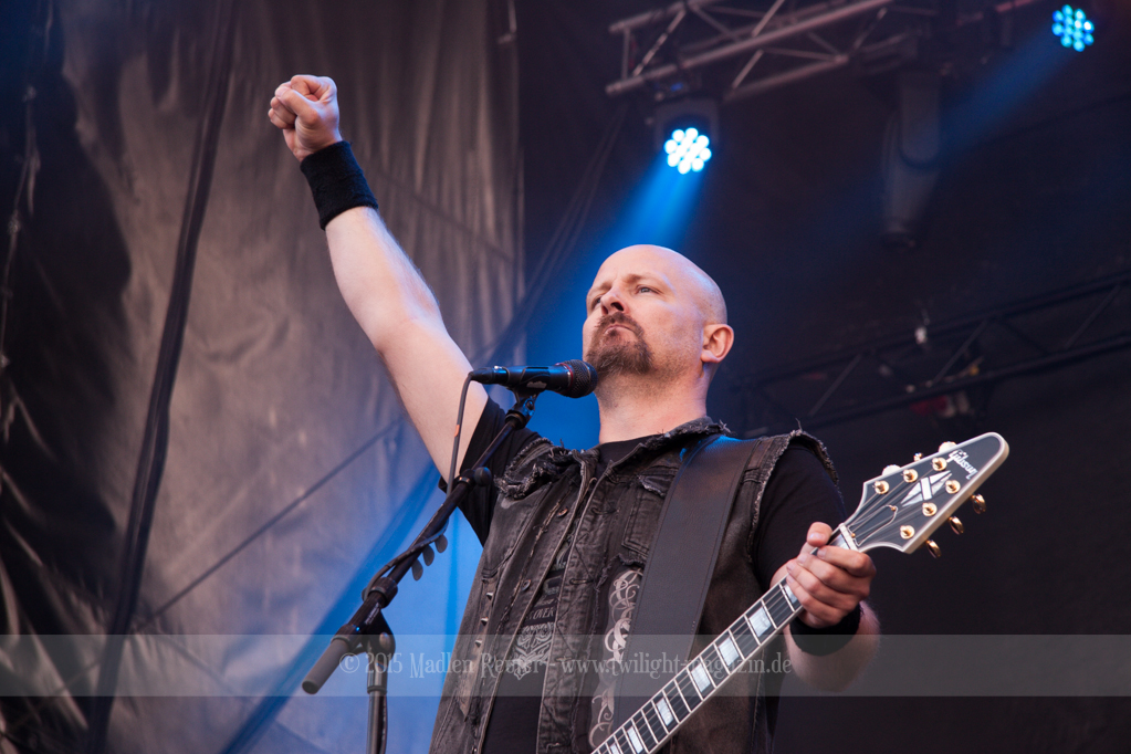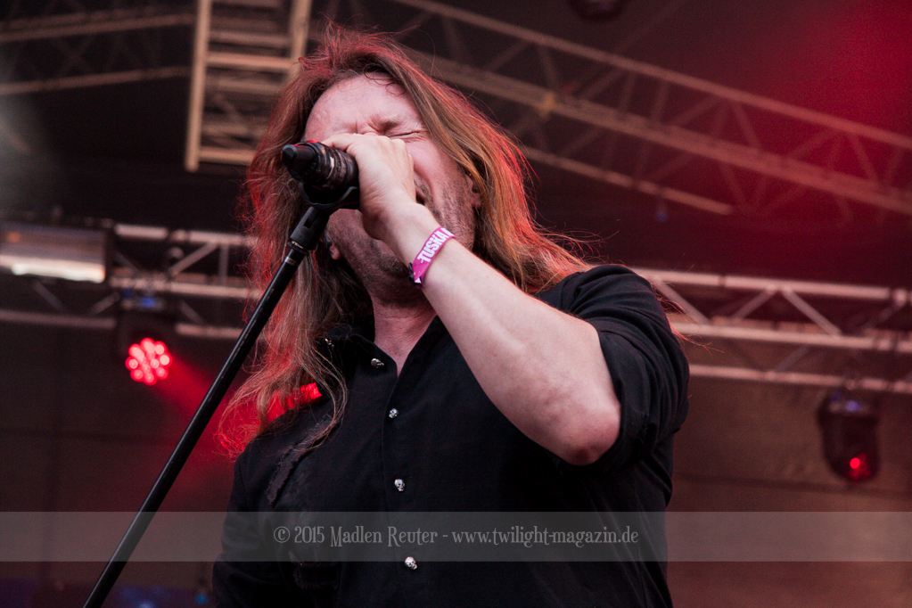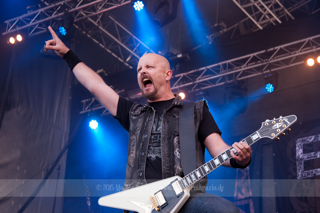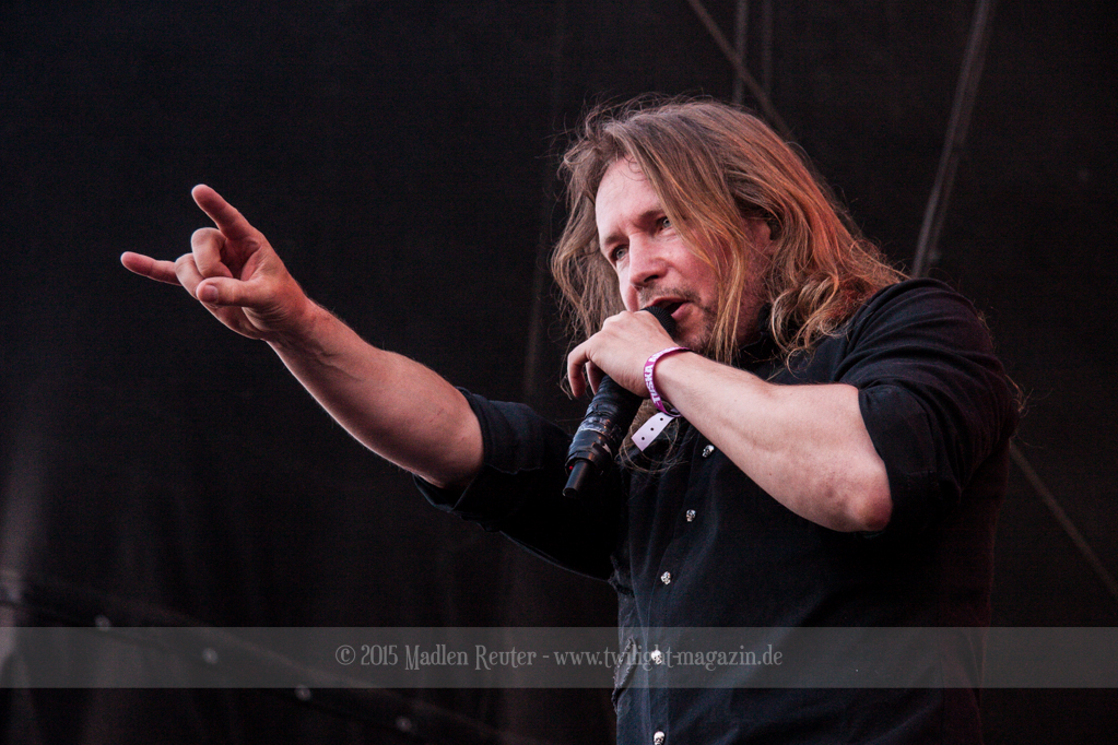 Dieser Tag startet, für mich, mit EINHERJER. Trotz fehlendem Bassisten hatte die Band ordentlich Druck. Für meinen Geschmack sogar etwas zu viel, denn aus den Boxen kam ein einziger Brei. So direkt vor der Bühne fand ich das sehr anstrengend, wobei es aus einiger Entfernung dann ganz anständig klang. Die dreckige Reibeisenstimme des Sängers sticht jedoch zu allen Zeiten sehr hervor. Auch stellt er deutlich zu Schau, dass man nicht unbedingt lange Haare braucht, um entsprechend abzugehen.