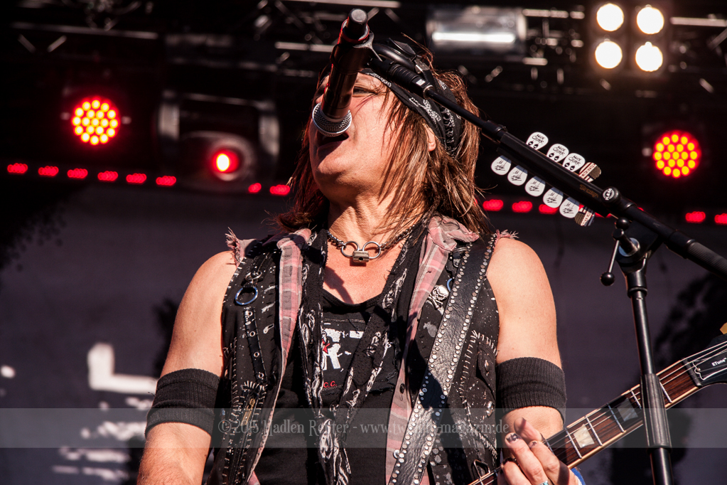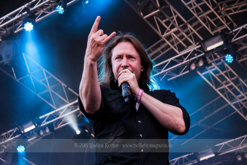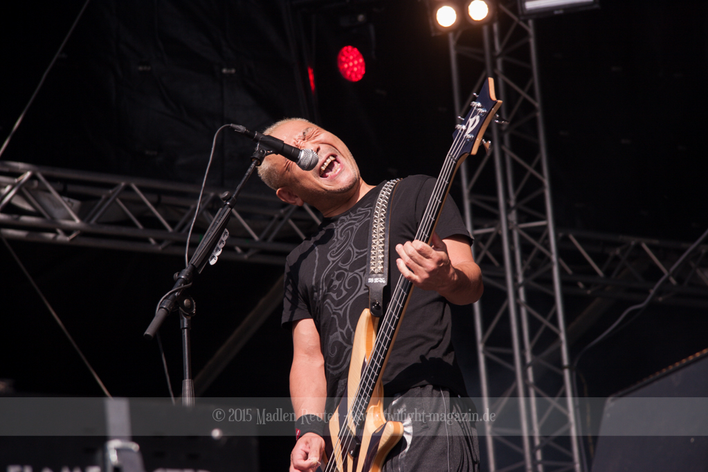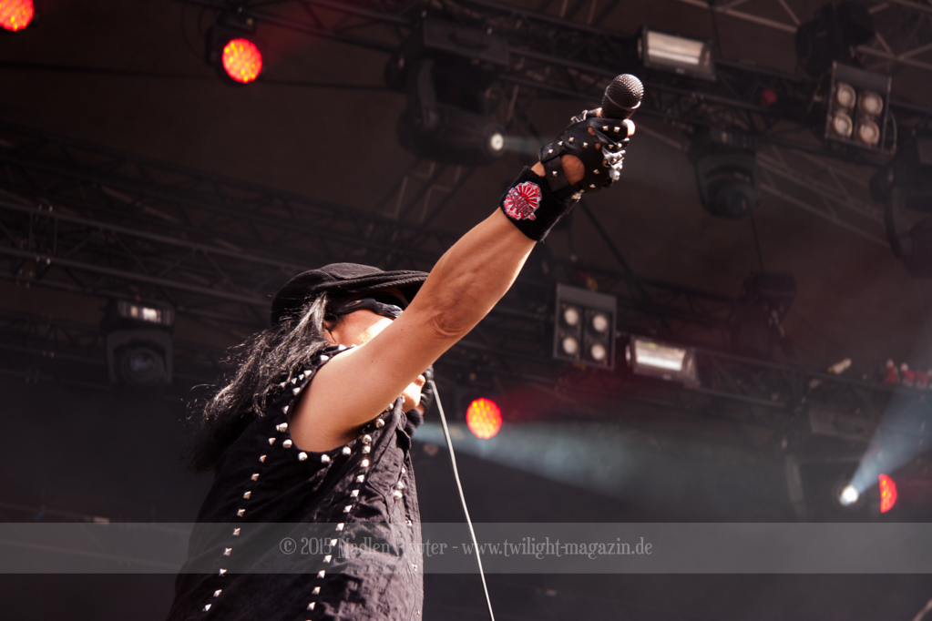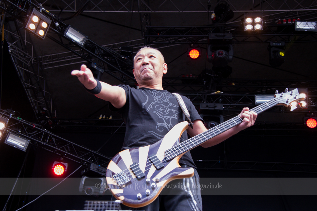 Den, aus dem Land der aufgehenden Sonne stammenden, Herren von LOUDNESS wurde als nächstes die Bühne überlassen. Unschwer zu Überhören war, dass die Band sich auf Hardrock aus den 80ern spezialisiert hatte. Einen gewissen Touch AC/DC und ACCEPT ließ sich nicht von leugnen. Vor allem der Gitarrist durfte, mit zahlreichen, Technisch höchst anspruchsvollen Solos, sein Können unter Beweis stellen. Irgendwie hatte ich das Gefühl, dass sie denselben Song einfach immer wieder gespielt haben.