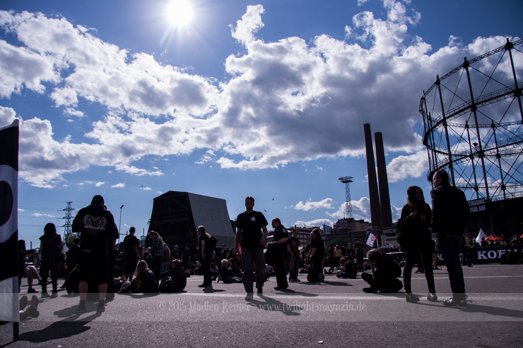 Bereits der erste Festivaltag war gefüllt von großartigen Bands. Diese Tatsache, zusammen mit dem vielversprechenden Wetter, ließen mich, voller Verzückung, zum Festivalgelände schweben. Bereits vor Öffnung der Tore war der Andrang groß, denn EMP Finnland lockte mit süßen Preisen für die ersten Personen auf dem Gelände.