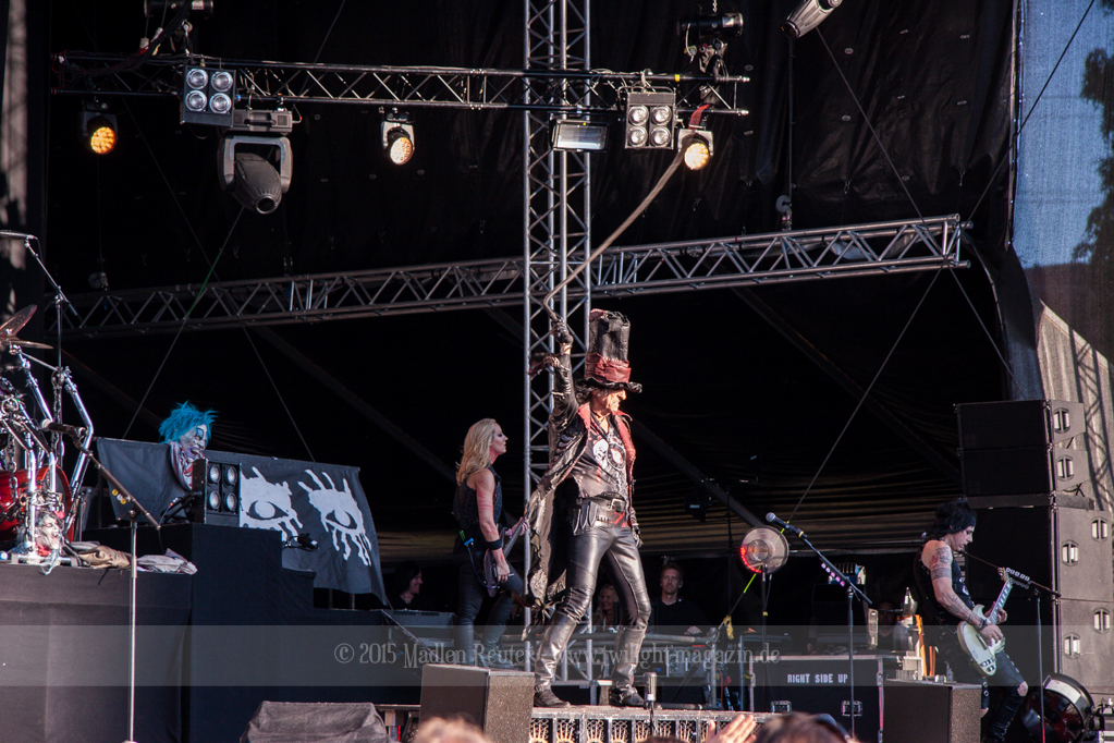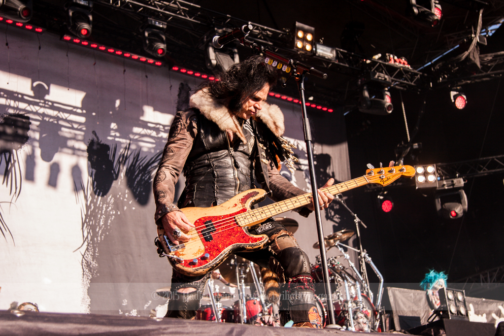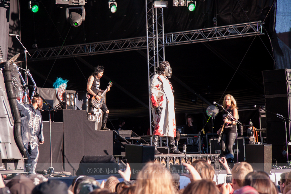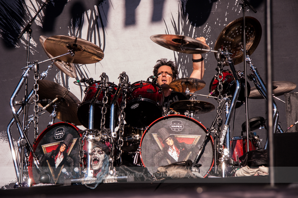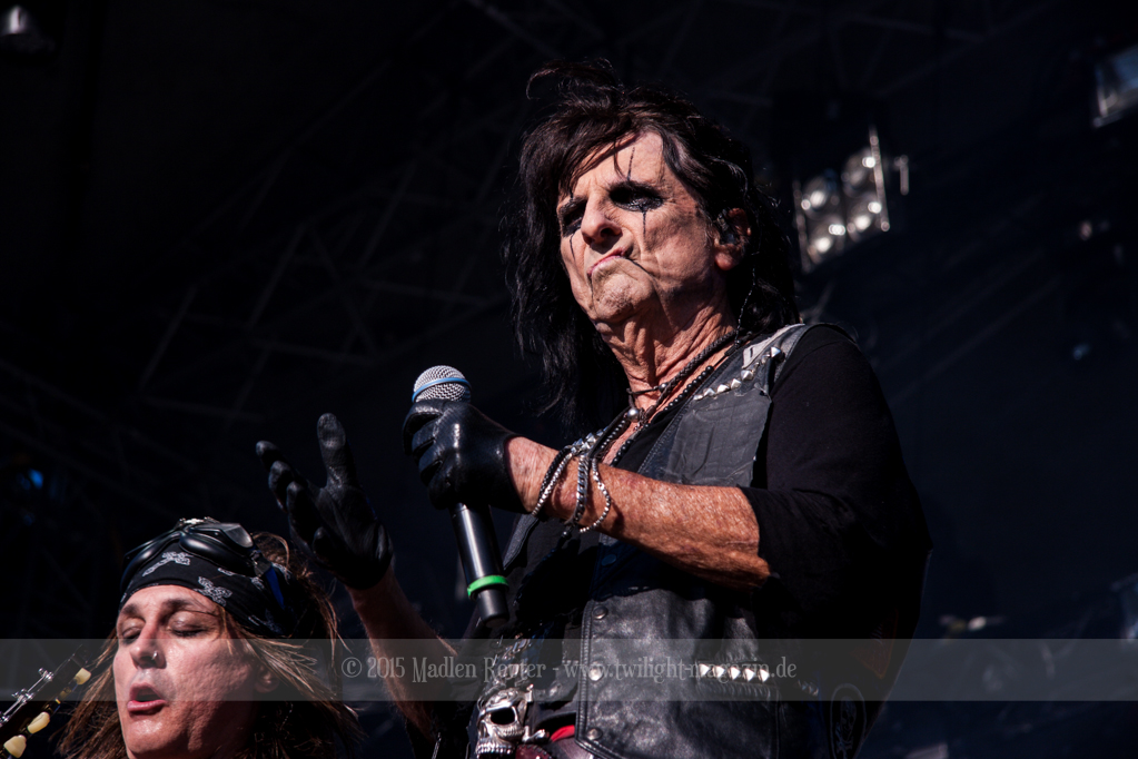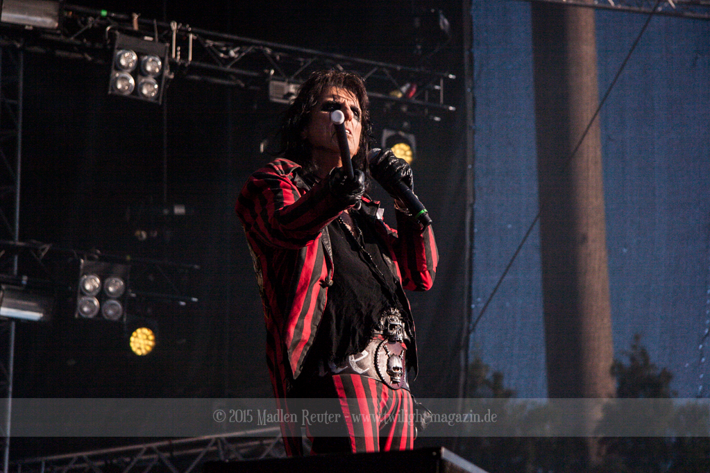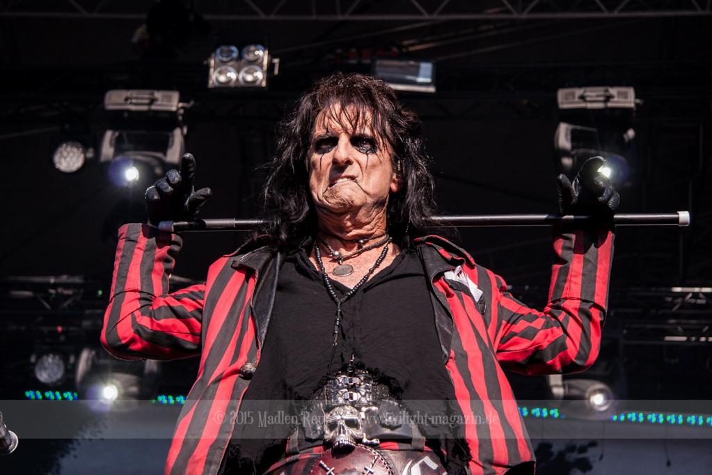 Zum krönenden Abschluss sollte dann noch ALICE COOPER über die Bühne herrschen. Es ist wirklich unglaublich, über welch imposante, fast sogar einschüchternde, Bühnenpräsenz dieser Mann verfügt. Mit seinen Blicken muss er sich keinen Applaus erbitten, man lässt ihm diesen auch ohne Aufforderung zukommen. Insgesamt wusste die gesamte Band wie sie sich in Pose werfen musste. Kaum ohne Bewegung erschien mir als zufällig. Bei diesem straffen Ablauf wäre dies aber auch kaum möglich gewesen. Die meisten Songs wurden von einer Showeinlage begleitet, die einen exakten Ablauf gefordert hatte. So wurde Alice zum Tode durch die Guillotine verurteilt, nach dessen Vollstreckung er allerdings wieder auferstanden ist. Auch Frankensteins Monster wurde in die Show mit einbezogen, der durch ein grausames Experiment zum Leben erweckt wurde. Bei diesem Auftritt wurde dem Zuschauer wirklich eine Menge geboten, und das war definitiv sein Geld wert. Leider muss ich aber auch gestehen, dass die musikalische Darbietung mich nicht allzu umgehauen hatte. Die Songs waren zwar alle sehr gut dargeboten, aber leider kam kaum richtig Stimmung auf. Im Allgemeinen war es eher ein „Wow, die Show ist ja der absolute Knaller“-Gefühl.