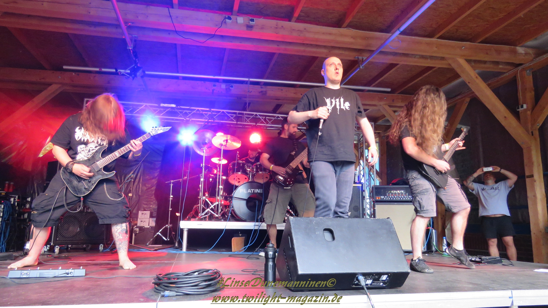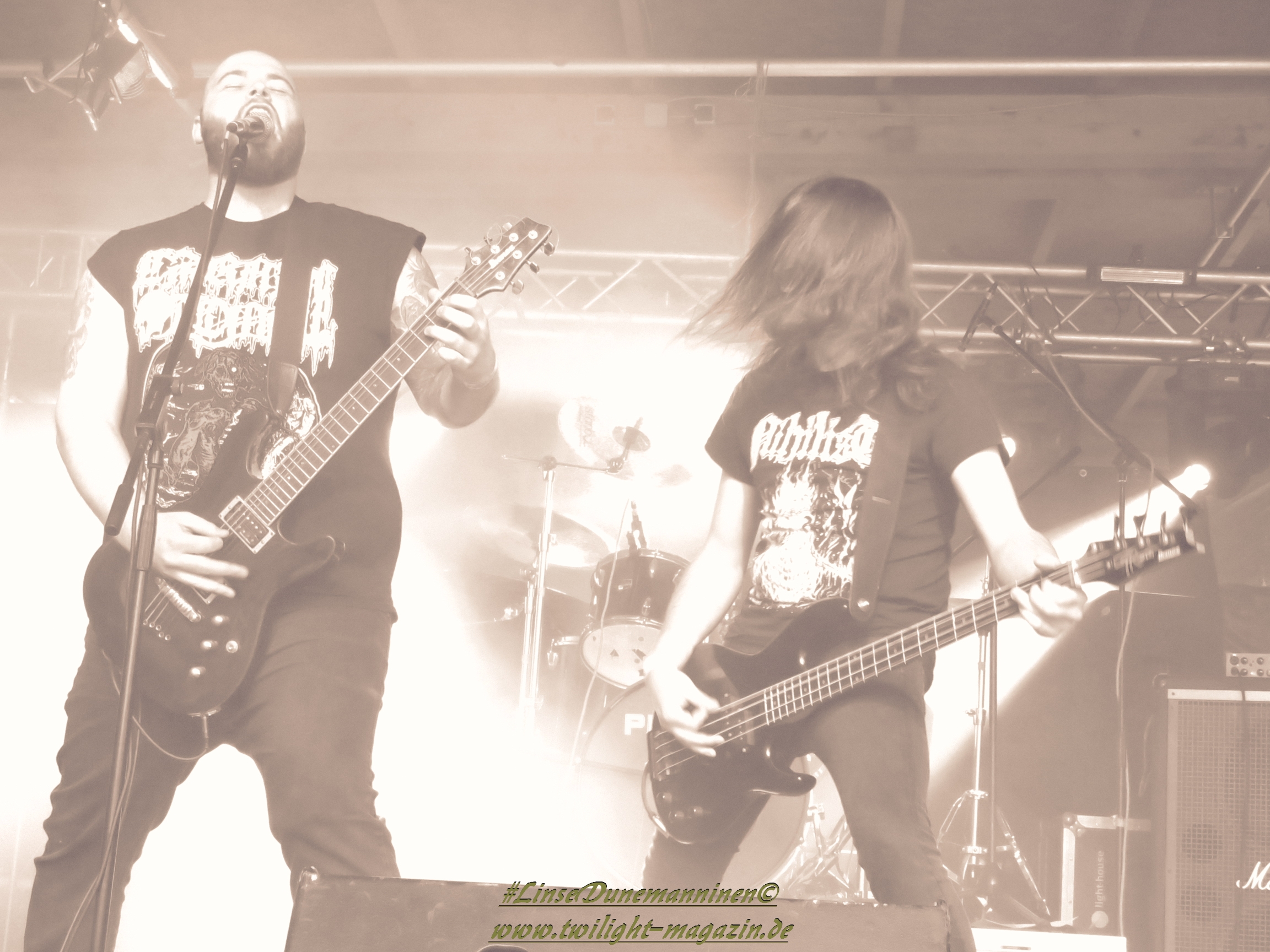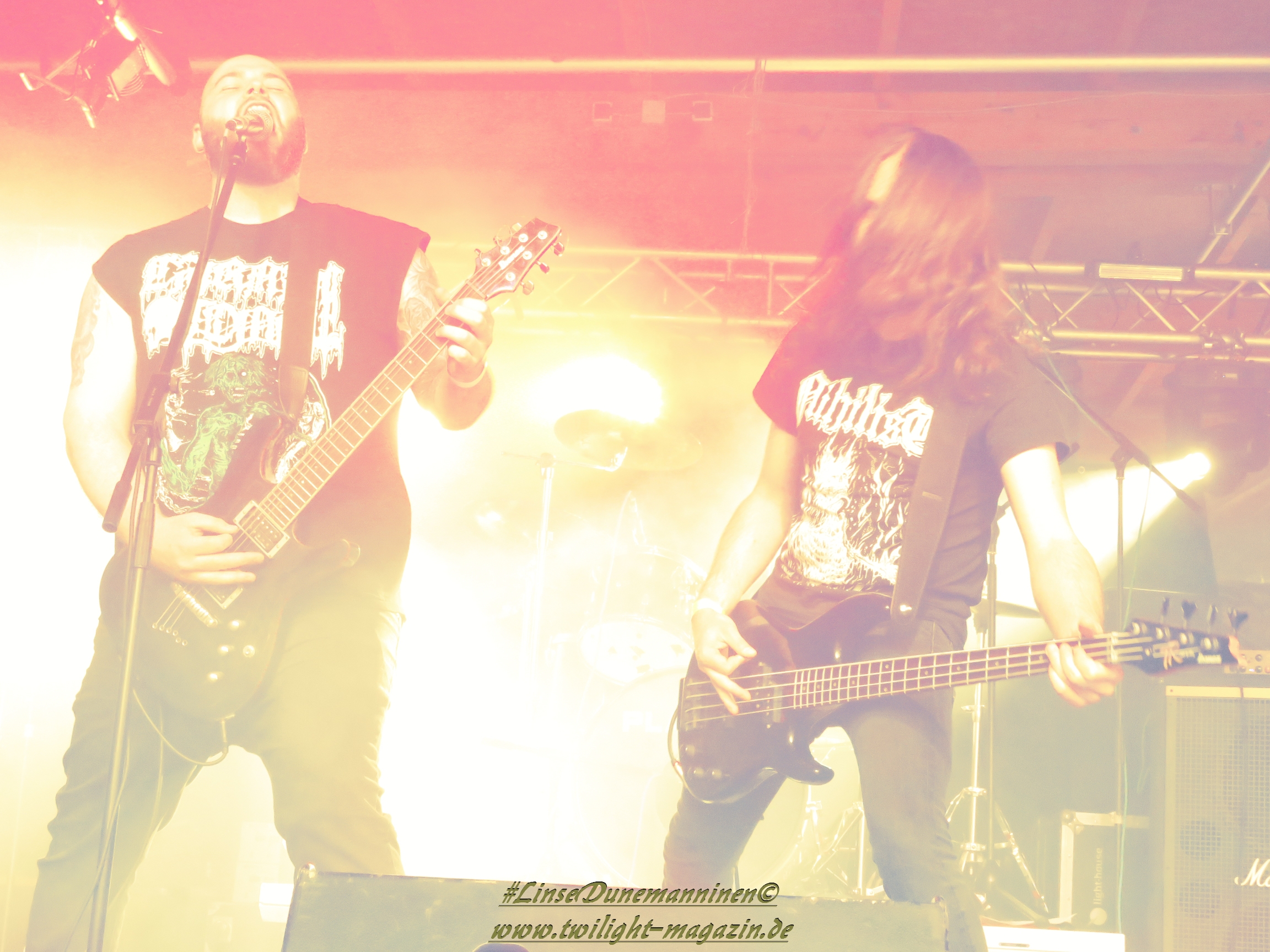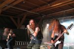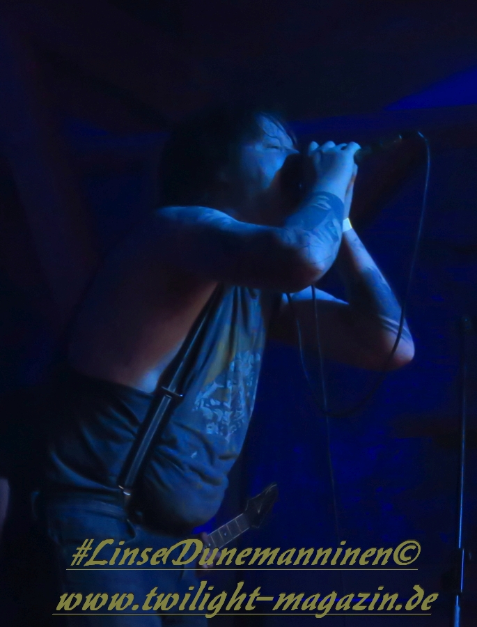 Für die Lokalmatadoren ATOMWINTER folgt anschließend ein Heimspiel, dass im Fußball einem zu verwandelnden Elfer ohne Torwart gleich kommen würde. Und das Quartett nimmt es ebenso sportlich und verwandelt das Geschenk wahrlich souverän. Allen voran Sänger Holzschneider, für den der Begriff Rampensau erfunden worden zu sein scheint, ein Typus Mensch, dem man sowohl abends im Dunkeln allein auf der Straße nicht wirklich begegnen möchte, auf den man jedoch in der ungemütlichsten Situation zählen kann. Darüber hinaus ist er mit einem außergewöhnlichen wie variablem Organ gesegnet, mit dem er großartig umzugehen weiß und mit dem er dem vermeintlich simplen aber äußerst effektiven Todesstahl ein äußerst saures Sahnehäubchen verpasst. Die Meute vor der Bühne huldigt dem Quartett und sorgt für einen amtlichen Moshpit. Keine Ahnung, wieso ich diese Band bisher nicht wirklich auf dem Radar hatte. Es gibt nicht wenige Bands, die aus relativ bescheidenen Mitteln soviel heraus holen. Wenn man einen "Asphyx-Gedächtnispreis" ausloben würde, dann wären Atomwinter jedenfalls ein ganz heißer Anwärter darauf. Die anstehenden Auftritte auf dem Protzen und dem Party.San Open Air sind, wenn nicht sogar überfällig, dann mehr als verdient.