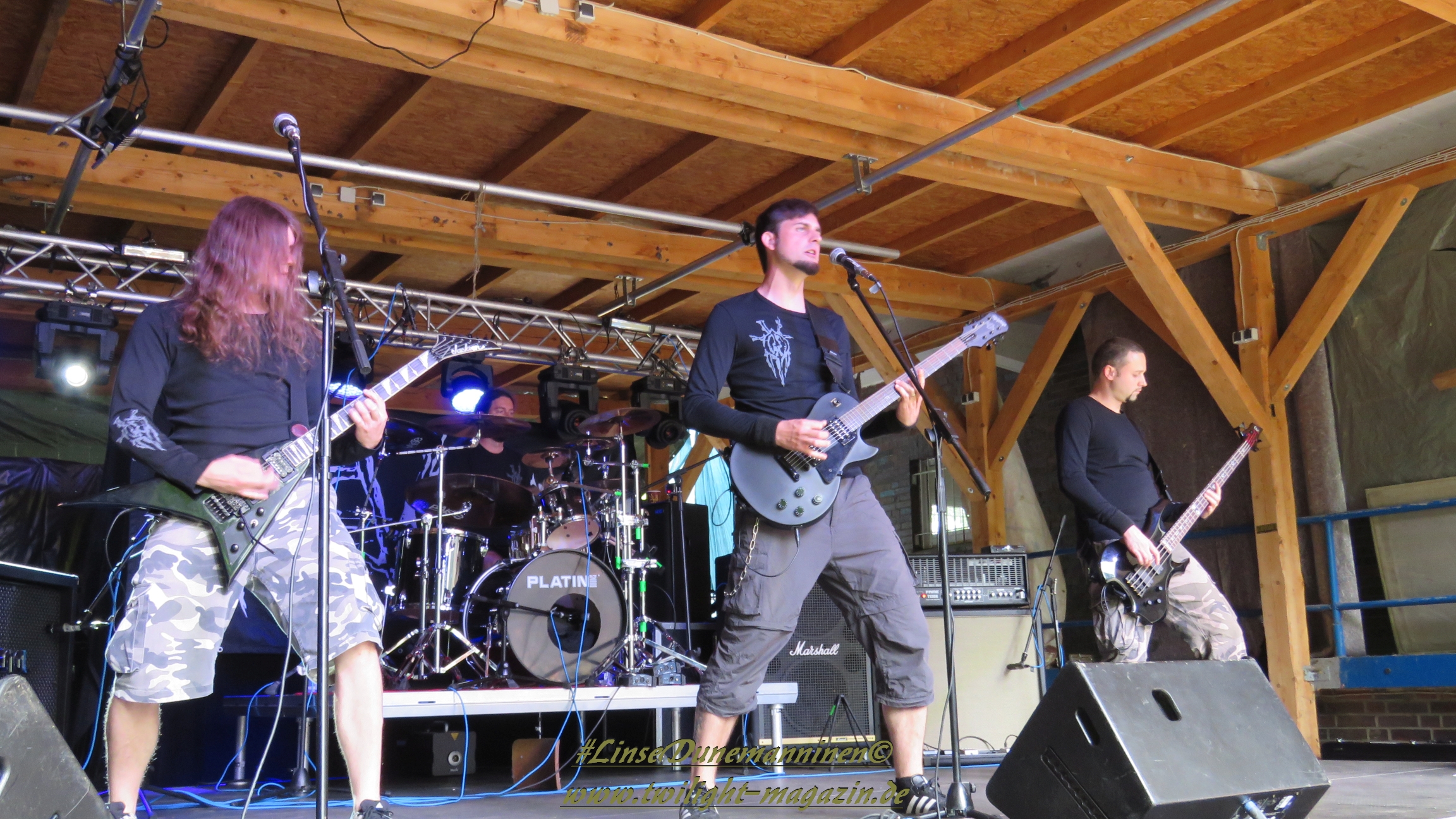 Danach ist es Zeit für das Finale. Nach einer kurzen Verzögerung aufgrund von technischer Probleme richtet ein abgekämpftes aber überaus zufrieden und glücklich dreinblickendes Orga-Team Dank an Bands, Crew und an die sehr zahlreich erschienenen Gäste, ehe IMPERIUM DEKADENZ dem Underground Remains Open Air 2017 mit viel schwarzmetallischer Atmosphäre den Todesstoß versetzen dürfen. Das Quintett aus dem Schwarzwald und Franken weiß die Gunst der hereingebrochenen Dunkelheit perfekt zu nutzen und lässt alle Anwesenden in ihren düsteren Kompositionen schwelgen, wobei die Performance äußerst stark ist. Und so klingt das Festival in einer lauen Frühsommer-Nacht würdig aus. Erwähnt werden muss an dieser Stelle auch die Tontechnik-Mannschaft, die dem Publikum bei jeder Band einen guten bis sehr guten Sound gebastelt hat, was bei Veranstaltungen dieser Art, unabhängig von der Größe, leider nicht immer Standard ist.