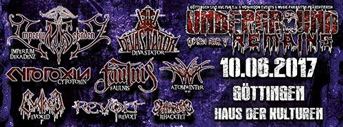 Nach dem UNDERGROUND REMAINS OPEN AIR ist vor dem PROTZEN OPEN AIR. Und wer keine Tickets mehr für das bereits seit langem ausverkaufte metallische Familientreffen in Brandenburg bekommen hat, der kann sich am kommenden Donnerstag, den 22.06. im Göttinger Freihafen mit FACEBREAKER und REVEL IN FLESH trösten. Los geht´s ab 19 Uhr für schlappe 10 Euro.