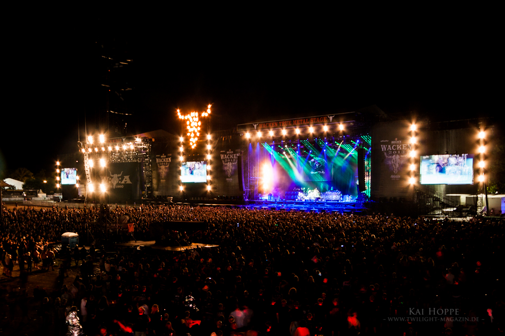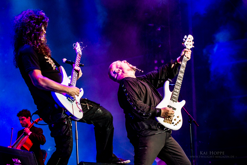 Ein harter Samstag neigt sich dem Ende. Um 0:30 Uhr gab es zum Ausklang Rage und das Lingua Mortis Orchester. Peavey und seine Mannen haben sich zum wiederholten Male nicht gescheut, eine volle Orchester-Show aufzufahren. Das Lingua Mortis-Thema hat sich ja seit 1996 bei Rage zu einem Dauerbrenner entwickelt. 2008 gab es die Orchestershow bereits auf dem WOA zu sehen. Auch kürzlich konnten sich die Fans einen Vorgeschmack beim „70000tons of Metal“ holen. Die Arrangements mögen Geschmackssache sein und der eine oder andere Fan hätte Rage lieber als reines Trio gesehen, dennoch war es wieder eine super Inszinierung. Der Platz vor der Bühne war jedenfalls rappelvoll. Mit dem Ex-Metallium-Sänger Henning Basse und den beiden klassisch ausgebildeten Mädels, die zur Stammbesetzung gehören, hatte Peavey die perfekte stimmliche Unterstützung. Mit „Cleansed by fire“ ging es los. Die Stimmen kamen aber erst beim zweiten Song, dem Hit “Cradle to the grave” so richtig zur Geltung. „Scapegoat“, „Empty Hollow“, „Lament“ (hier tauschte Saitenhexer Victor Smolski mal eben die Gitarre gegen das Cello), „Witches´ Judge” und „Straight to hell” waren die Songs des Abends, verteilt auf eine Stunde Spielzeit. Ein gut gelaunter Peavey, ein perfektes Zusammenspiel von Band und Orchester und ein super Sound machten diese Show zu einem würdigen Festival-Abschluss auf der Black Stage. Und es hat einmal mehr gezeigt, dass Klassik und Metal ganz dicht bei einander liegen und viele Fans nicht nur auf die ganz harten Töne stehen.
