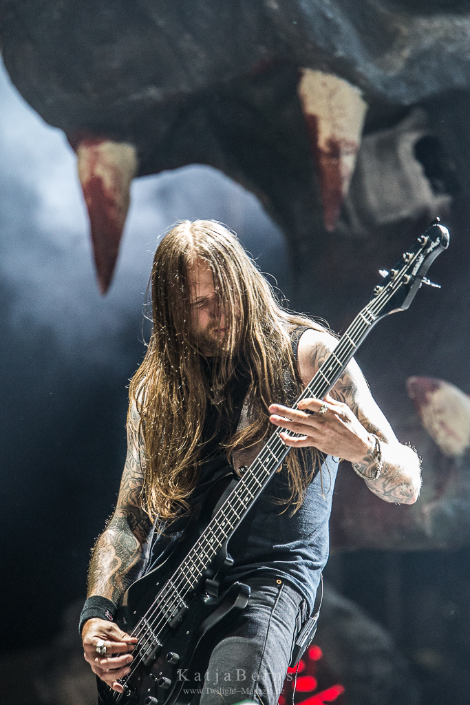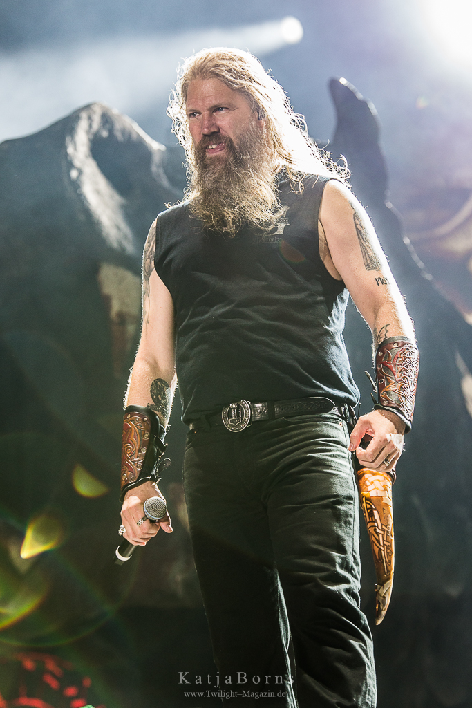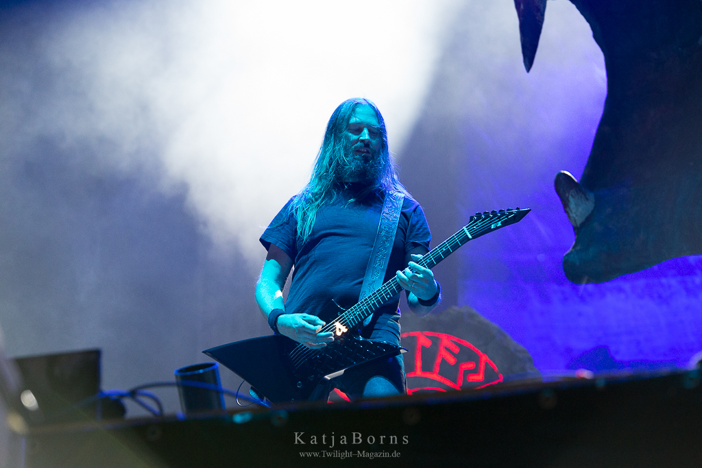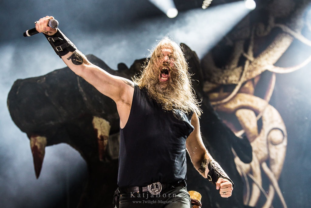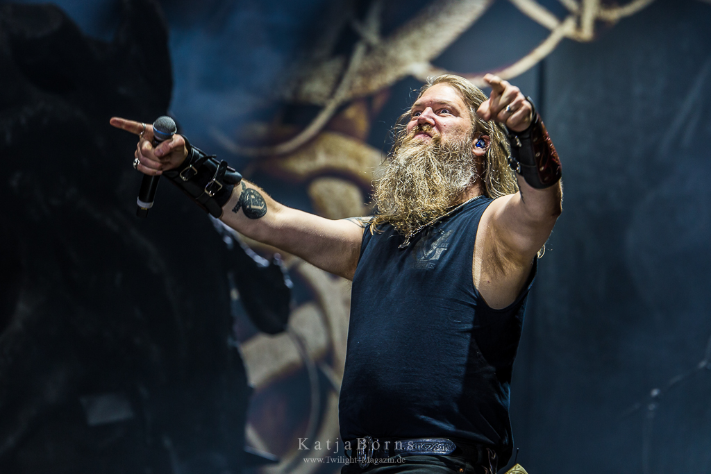 Die Verlängerung und das Elfmeterschießen waren vermutlich eine arge Geduldsprobe für den Headliner, der mit seinem Auftritt auf das Ende des Fußballspiels warten musst. Durch das Ergebnis war allerdings beste Stimmung auf dem Platz, als sich aus viel Rauch und bunten Lichtern zwei Drachenköpfe erhoben und das Erscheinen der nordischen Berserker ankündigte. AMON AMARTH eröffnete auch gleich mit einem Klassiker und das bekannte Riff aus „The Pursuit of Vikings“ erlaubte es uns zahlreich anwesenden Zuschauern sofort wieder vom Fußball- in den Metal-Mod