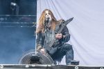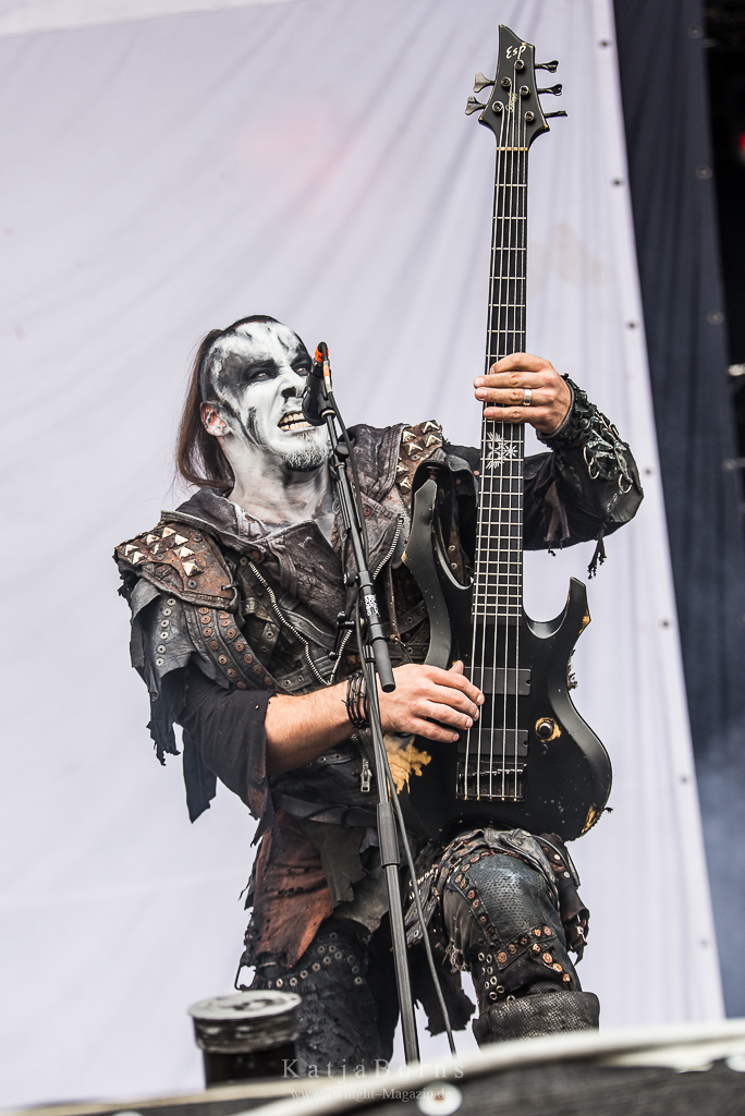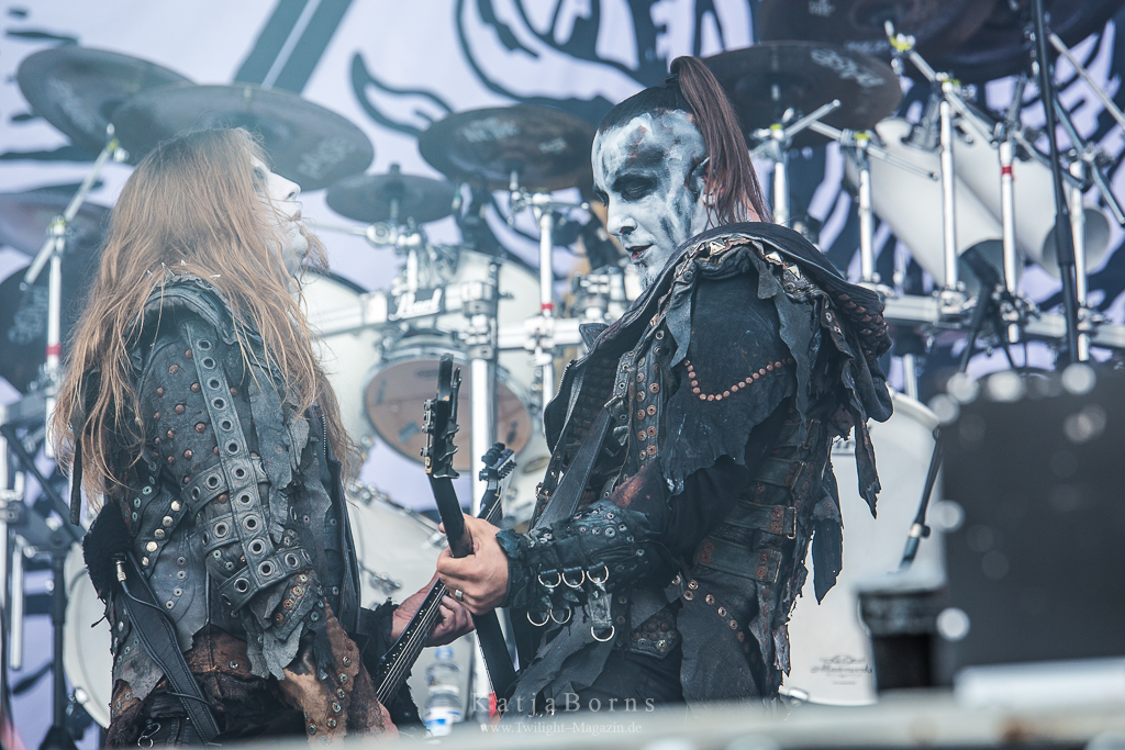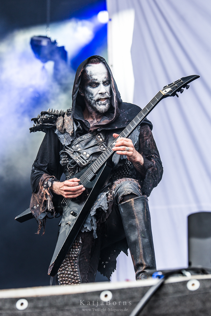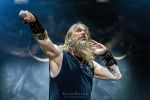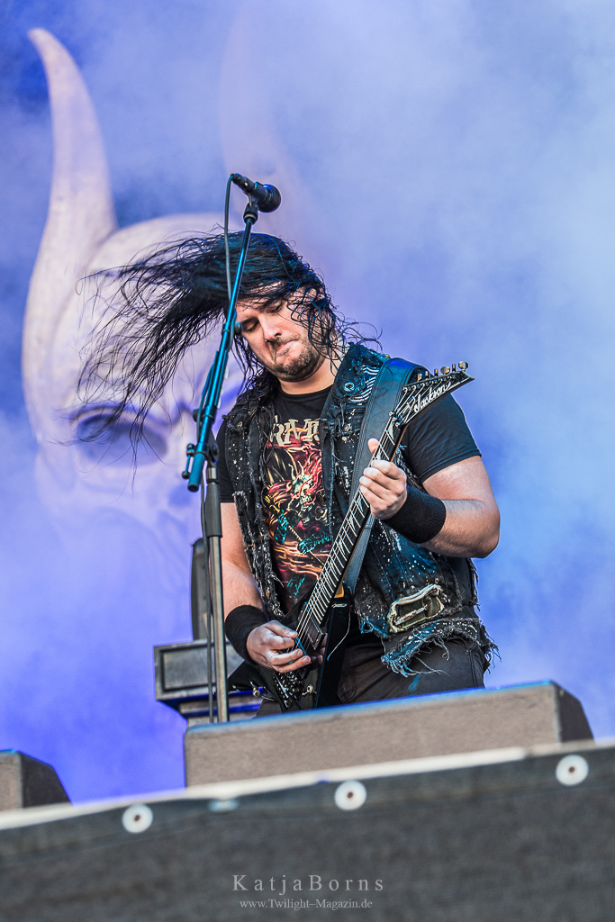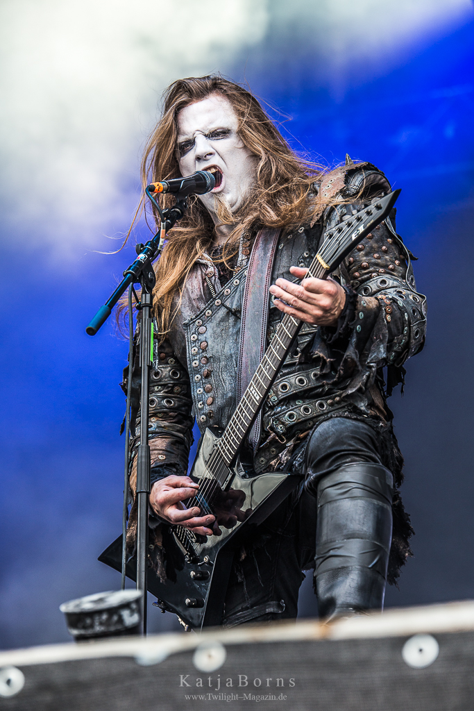 Die Verlängerung und das Elfmeterschießen waren vermutlich eine arge Geduldsprobe für den Headliner, der mit seinem Auftritt auf das Ende des Fußballspiels warten musst. Durch das Ergebnis war allerdings beste Stimmung auf dem Platz, als sich aus viel Rauch und bunten Lichtern zwei Drachenköpfe erhoben und das Erscheinen der nordischen Berserker ankündigte. AMON AMARTH eröffnete auch gleich mit einem Klassiker und das bekannte Riff aus „The Pursuit of Vikings“ erlaubte es uns zahlreich anwesenden Zuschauern sofort wieder vom Fußball- in den Metal-Mod