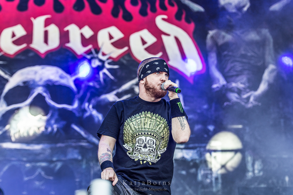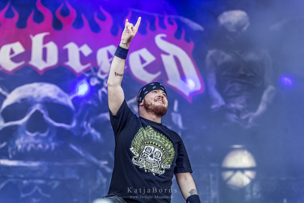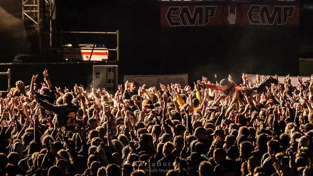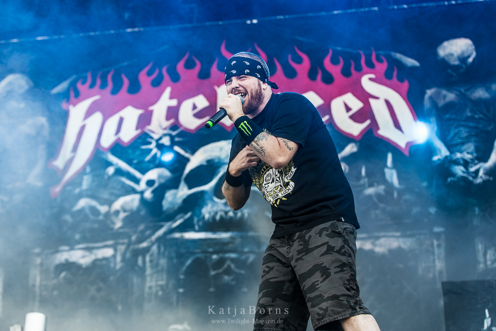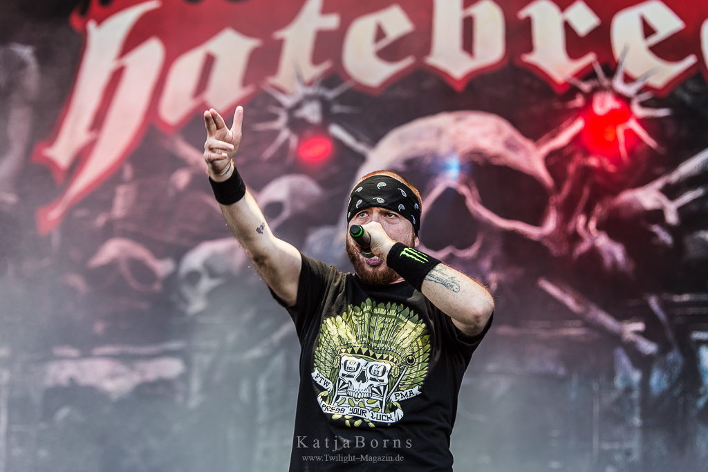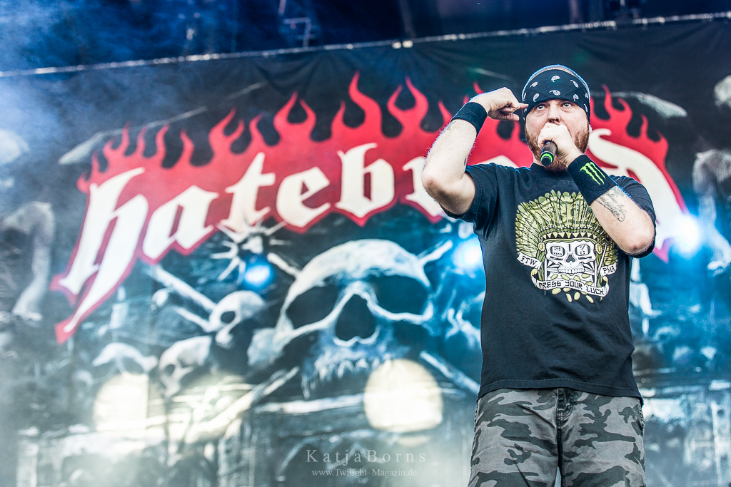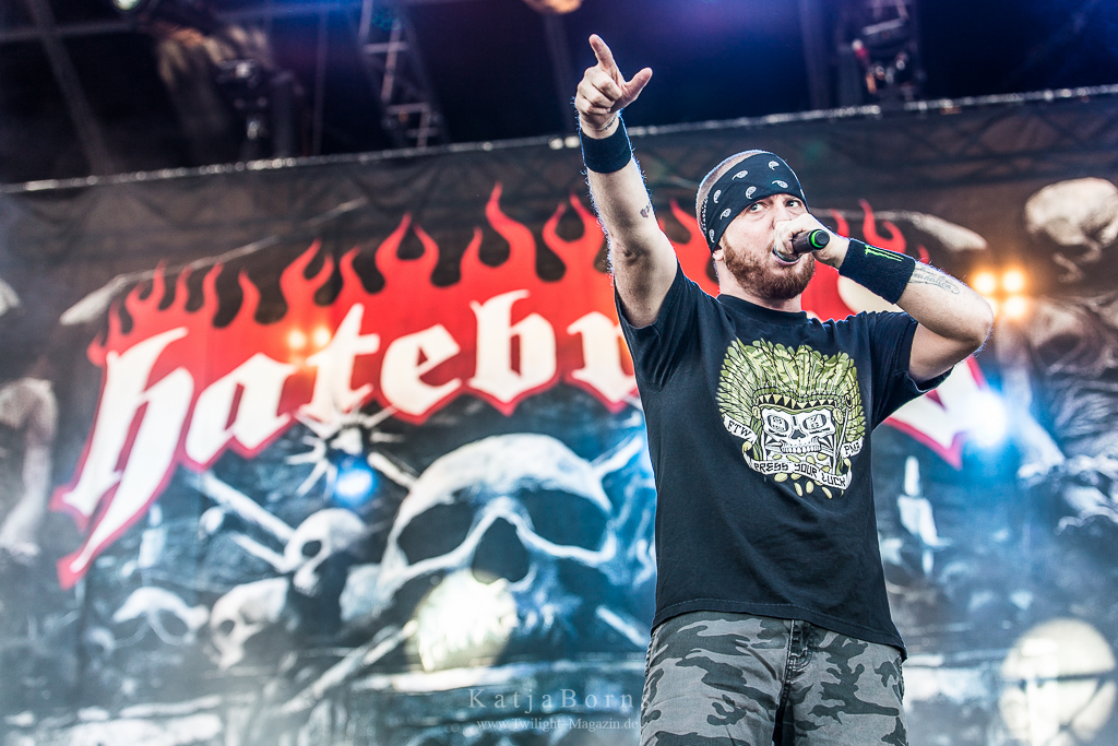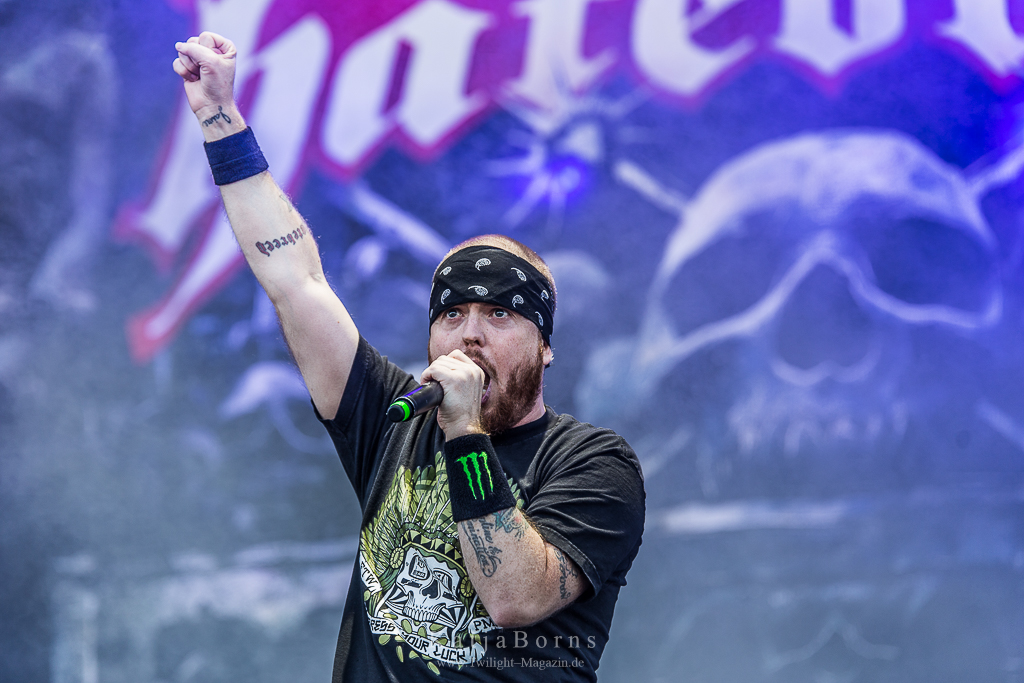 Der Samstag begann zunächst mit einer Sturmwarnung und nach den bisherigen Desastern bei Rock am Ring sowie beim Hurricane und beim Southside Festival gab es schon einige böse Vorahnungen. Trotz der vielen Agnostiker scheint der Wettergott aber Heavy Metal eben doch zu lieben und so blieb es bei einigen Schauern und einer recht steifen Brise am Nachmittag. Kein einziger Auftritt musste abgesagt werden. Zum späten Nachmittag gab es dann bestes Festivalwetter bei etwas über 20°C und so konnte Zoltan mit seiner Band EKTOMORF in Bestform über die Bühne hüpfen während die Menge trockenen Fußes im Pit kreiselte. Anschließend feierte BEHEMOTH mit uns eine satanische Messe und spätestens jetzt hätte der massive Einsatz der Flammenwerfer wohl jede aufkommende Regenwolke sofort verdunsten lassen. Noch etwas benebelt vom Weihrauch blieb keine Zeit sich Sorgen um das eigene Seelenheil zu machen, schon brüllte Jamey Jasta uns zurück ins das hier und jetzt. HATEBREED trafen wie das Geschoss aus einer Pumpgun den Nerv des Publikums.