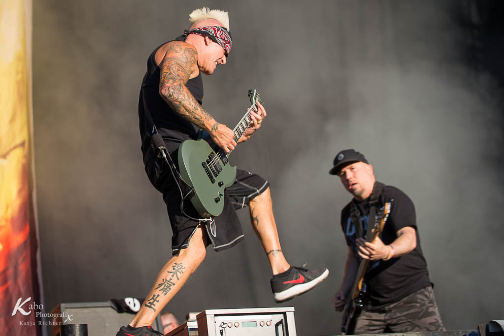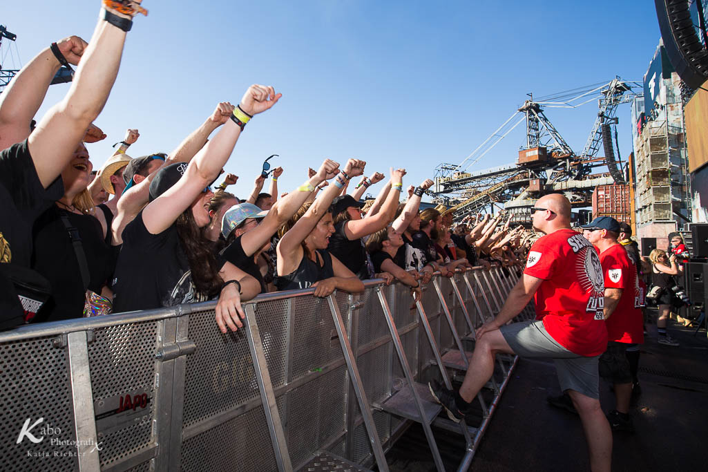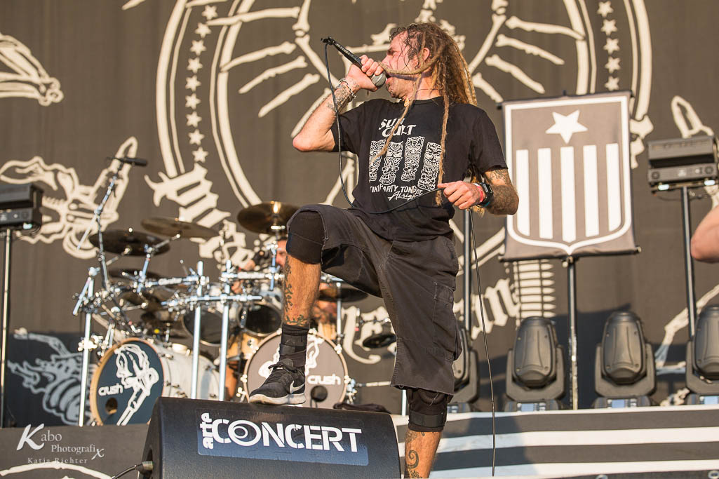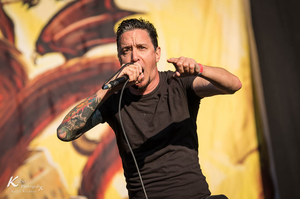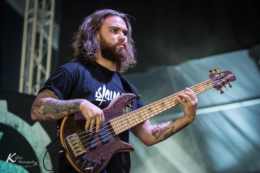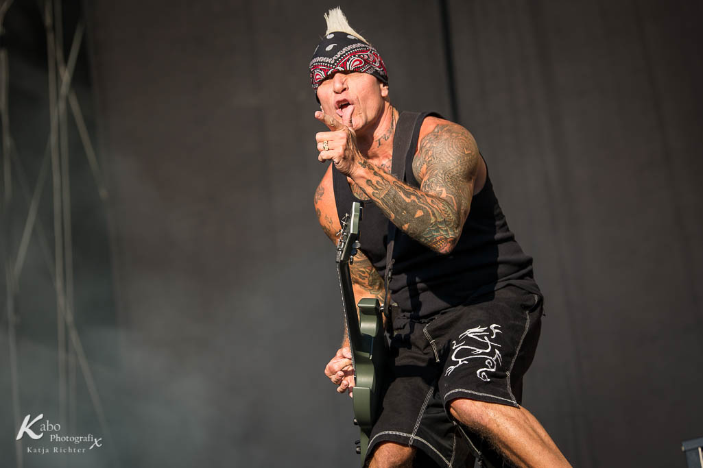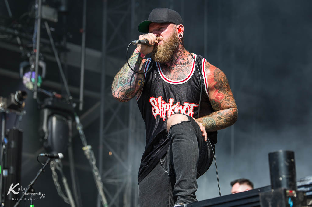 Samstag – Geweckt von der großen hellen Scheibe, die viel zu früh und viel zu stark am Himmel stand, musste der Kreislauf nun erstmal langsam hochfahren und sich an das Wochenende gewöhnen – man sind wir alt geworden! Für CROWBAR haben wir uns dann doch irgendwann zum Festivalgelände geschleppt und mit Kirk in der Hitze gelitten. Die Hauptbühne ist für die Truppe aus Louisiana definitiv angemessen, nur leider fand sich das Publikum hier nur spärlich zusammen. Dennoch gelang es den Amis spielend leicht, die anwesenden, vor Hitze brütenden Gehirne, in ein sludgiges Doom-Parallel-Universum zu kicken. Zu den schweren Riffs und Rhythmen will schließlich mitgebangt werden und Songs wie “All I had I gave” oder “Planets Collide” laden auch wunderbar zum Mitgröhlen ein. Weiter ging es mit INFECTED RAIN auf der Seebühne und JINJER im Hardbowl – beide stark und irgendwie passend auf ihren Bühnen. Jinjer Fronfrau Tatiana Shmaylyuk nahm in ihrem schrill goldenen Outfit und ihrer unfassbaren Energie sogleich die Bühne in Besitz und sollte sie für den Rest des Auftritts auch nicht wieder hergeben. Passender hätte “Dying in heat is a rehearsel for being in hell” an diesem Tag nicht sein können!