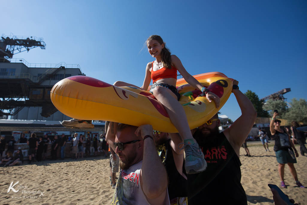 Für das leibliche Wohl sorgten wieder verschiedene Anbieter auf der Getränke- und Fressmeile. Kulinarisch kam so gut wie jeder auf seine Kosten, ob vegan oder deftig Fleisch, und natürlich war auch in diesem Jahr wieder die allseits beliebte Erdbeerbowle am Start. Die kurzen Laufwege auf dem Festivalgelände an sich und die logistisch gut aufgestellten Bühnen waren ebenfalls ein Genuss. Vor allem die Strandbühne, welche man bequem vom Wasser aus betrachten konnte, bot Sommer-Festival-Stimmung vom Feinsten. Die Stimmung auf dem Campingplatz war auch in diesem Jahr wieder gewohnt durchgeknallt und durchgehend laut, mit Musik aus allen Genres und Sphären und Partywilligen aus den verschiedensten Ländern - für dieses gediegen abgedrehte Publikum lieben wir das Full Force!