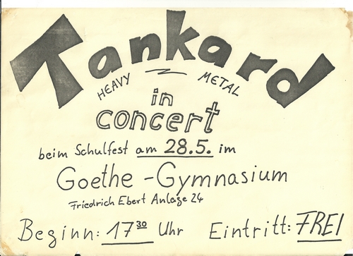 Früher oder später überkommt wohl jeden Musikfan die grandiose Idee eine Band zu gründen, um schließlich ein Leben als Rockstar in Saus und Braus zu führen. Bei TANKARD scheint es sich eher um so eine Art „Selbsthilfegruppe“ gehandelt zu haben. „Die Band wurde ja von Axel und Frank gegründet und wir waren Anfang der 80er auf unserem Gymnasium so ziemlich die Einzigen, die sich für die NWoBHM begeistert haben. Axel hat dann Gitarrenunterricht genommen und der zweite Gitarrist wurde Bernhard, der ebenfalls in unsere Klasse ging. Der war aber nur einige Monate dabei, dann wurde es ihm leider seitens seiner Eltern verboten sich mit solchen Subjekten abzugeben.“