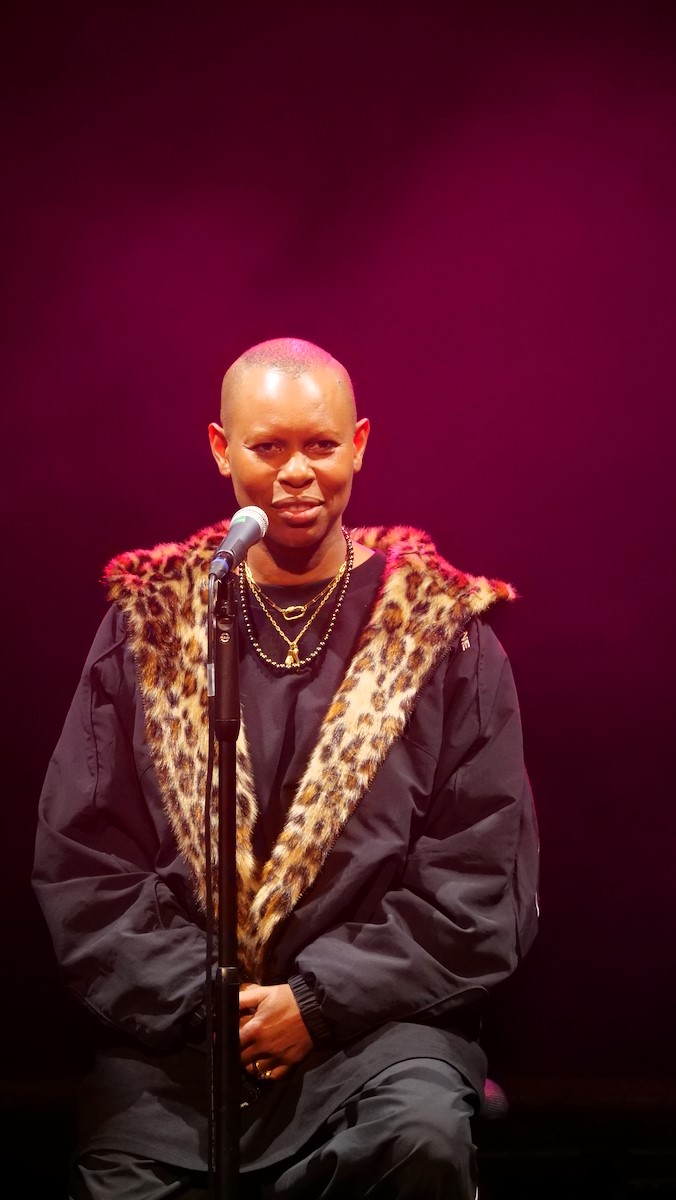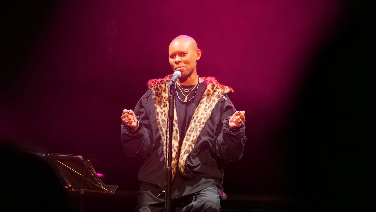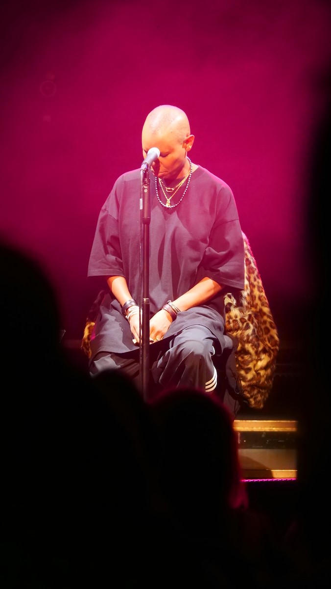 Skin und Ace waren die Haupterzähler zwischen den einzelnen Liedern. Ganz plakatisch geht es bei vielen Liedern der Band um beschissene Beziehungen zu Menschen, oftmals biographisch motiviert (Hedonism, Weak). Weak geht zurück auf eine Beziehung der Teenagerin (16 Jahre alt) Skin mit ihrem damaligen Freud (zehn Jahre älter als sie), der ihr im Auto sitzend sogar zwei mal ins Gesicht schlug. Vom neuesten Album war Lost And Found auf der Setlist. Ace sprach insbesondere davon, dass das neue Album etwas außerhalb der eigenen Komfortzone der Band entstanden ist. Er als Gitarrist hat über 30 Gitarren und auch viele Verstärker und Pedale. Und der Produzent drückte ihm eine Gitarre mit rostigen Saiten und lediglich einen Verstärker in die Hand und los ging's. Auch wurde manch Take genutzt, von dem die Bandmitglieder dachten, naja, es ist noch Probe. In dem hier sehr reduzierten Arrangement hatte der Song einen ganz anderen Charakter, klang aber stark. Die große Weltpolitik nahm Skin auf, als sie mit einigem inneren Kopfschütteln erwähnte, dass der aktuelle US Präsident weißen Südafrikanern Aysl in den USA anbietet. Skunk Anansie haben eine enge Verbindung zu Südafrika. 1997 seien sie die erste Band gewesen mit Mitgliedern unterschiedlicher Abstammung, die jemals in Südafrika ein Konzert gaben. 1998 waren sie eingeladen anlässlich Nelson Mandelas 80 jährigem Geburtstag für diesen zu spielen. Das Angebot des US Präsidenten ist kurios, weil die geringe weiße Bevölkerung eh privelegiert ist was Einkommen und Möglichkeiten angeht im Vergleich zur schwarzen. Nach Lost And Found bot die Band dem Publikum an, zu entscheiden, welchen der Songs Weak, Follow Me Down and Secretly sie als nächstes hören wollten. Es war Weak. Die anderen spielten sie auch. Secretly war dann die Zugabe.