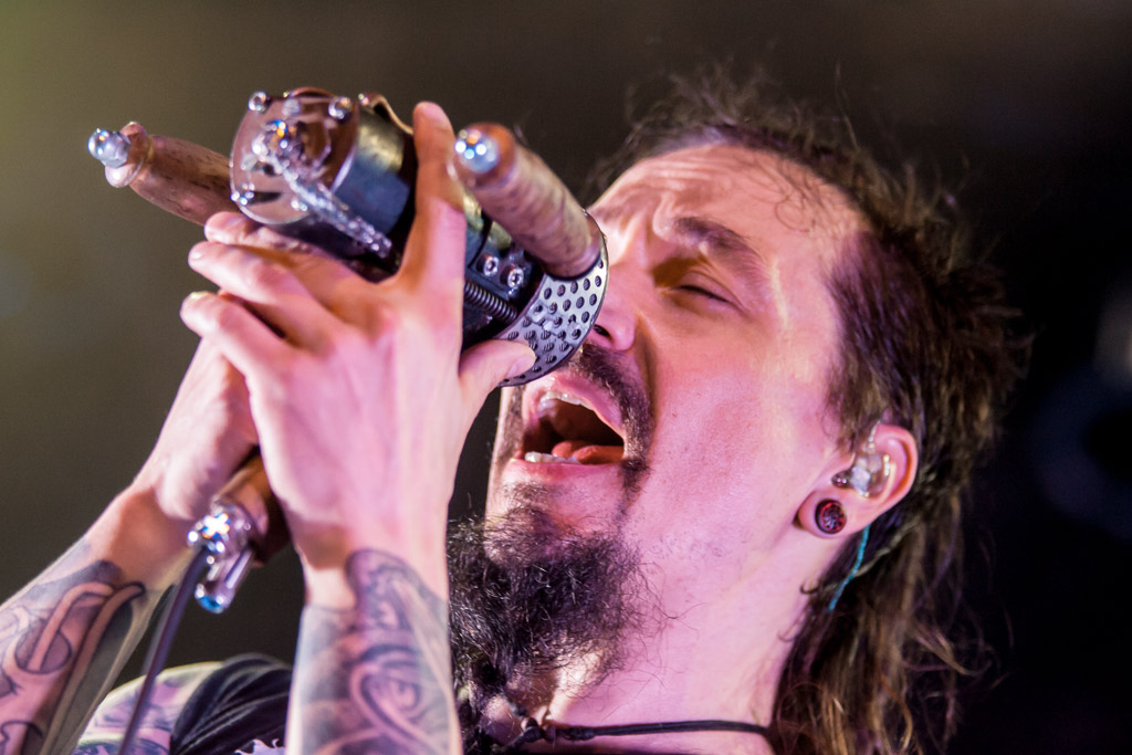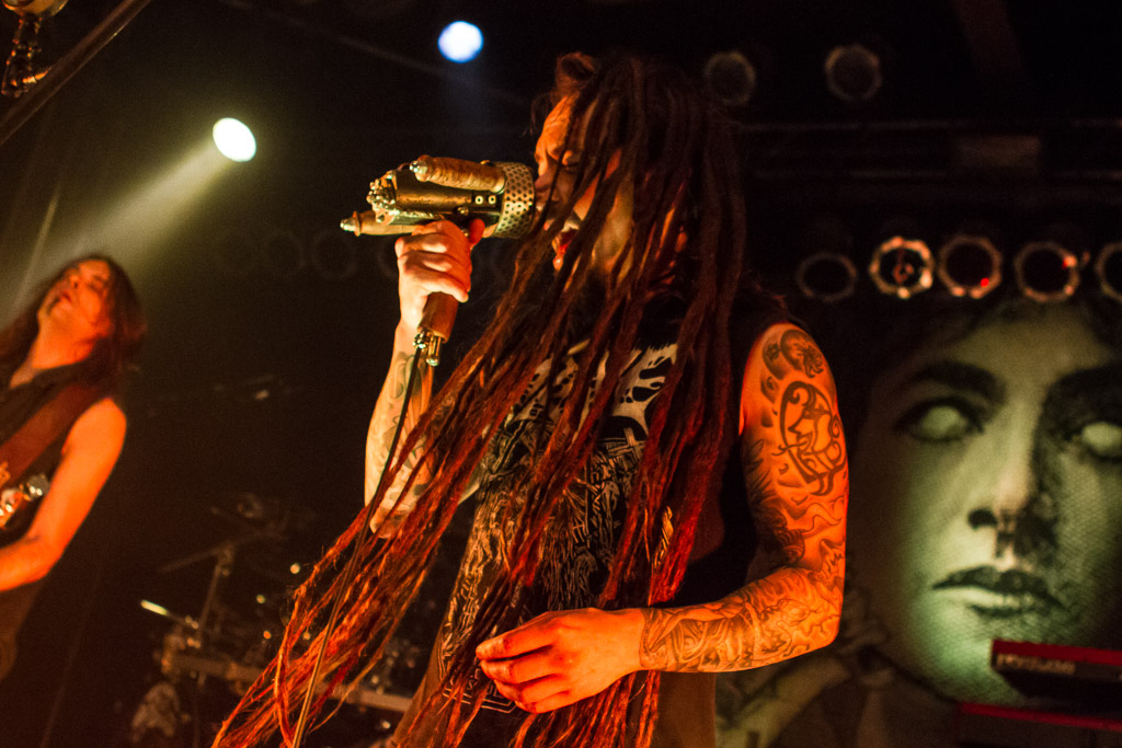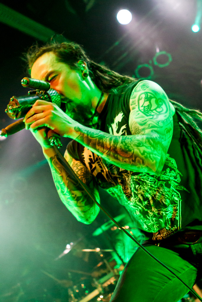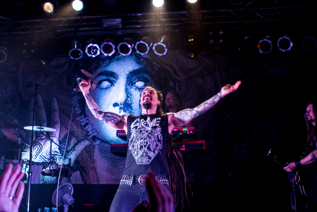 ...und ein dankbares, vor allem aber hungriges AMORPHIS-Publikum perfekt angeheizt hat. Nach kurzer Umbaupause werden die Finnen um den Freund der futuristisch-archaischen Mikrofone frenetisch empfangen. Mit „Shades Of Gray" steigt man ein und ab dem folgenden „Narrow Path" steht ein rappelvolles Musikzentrum bereits auf dem Kopf. Was soll man zu Amorphis noch groß sagen. Glücklicherweise – und das beweist die heutige Show eindrucksvoll – befinden sich die Herren immer (noch) auf dem Zenit ihres Schaffens. Abnutzungserscheinungen? Fehlanzeige! Kaum eine andere Band schafft es so harmonisch, innerhalb eines Sets zwischen beinharten Death Metal, Progressive Rock/Metal, Gothic Metal, Folk und Doom Metal zu wechseln. Der Fokus liegt zwar deutlich auf dem aktuellen Album, von dem mir leider einmal mehr „Enchanted By The Moon" fehlt, trotzdem geizen Amorphis nicht mit Hits und der einen oder anderen Überraschung: „Into Hiding" inklusive voll ausgespieltem „Tales From The Thousand Lakes"-Intro und „Sign From The North Side" vom „Karelian Isthmus"-Debut gehören freilich dazu. Noch mehr zur Sache geht's beim „Vulgar Necrolatry"-Cover der „Privilige Of Evil"-EP, bei dem Tomi klarstellen kann, wieso er heute im Grave-Shirt aufgelaufen ist. Mit „Skyforger", dem zu erwartenden „Black Winter Day" und „House Of Sleep" als Zugabenblock schickt man schließlich eine Fanschar heimwärts, die ihre Idole eigentlich gar nimmer von der Bühne entlassen möchte. Geadelt von den Klängen der Elekelaiset-Interpretation von „House Of Sleep" geht ein rundum gelungener Abend zu Ende. Schön war´s und wenn es am Schönsten ist, dann soll man ja bekanntlich gehen.