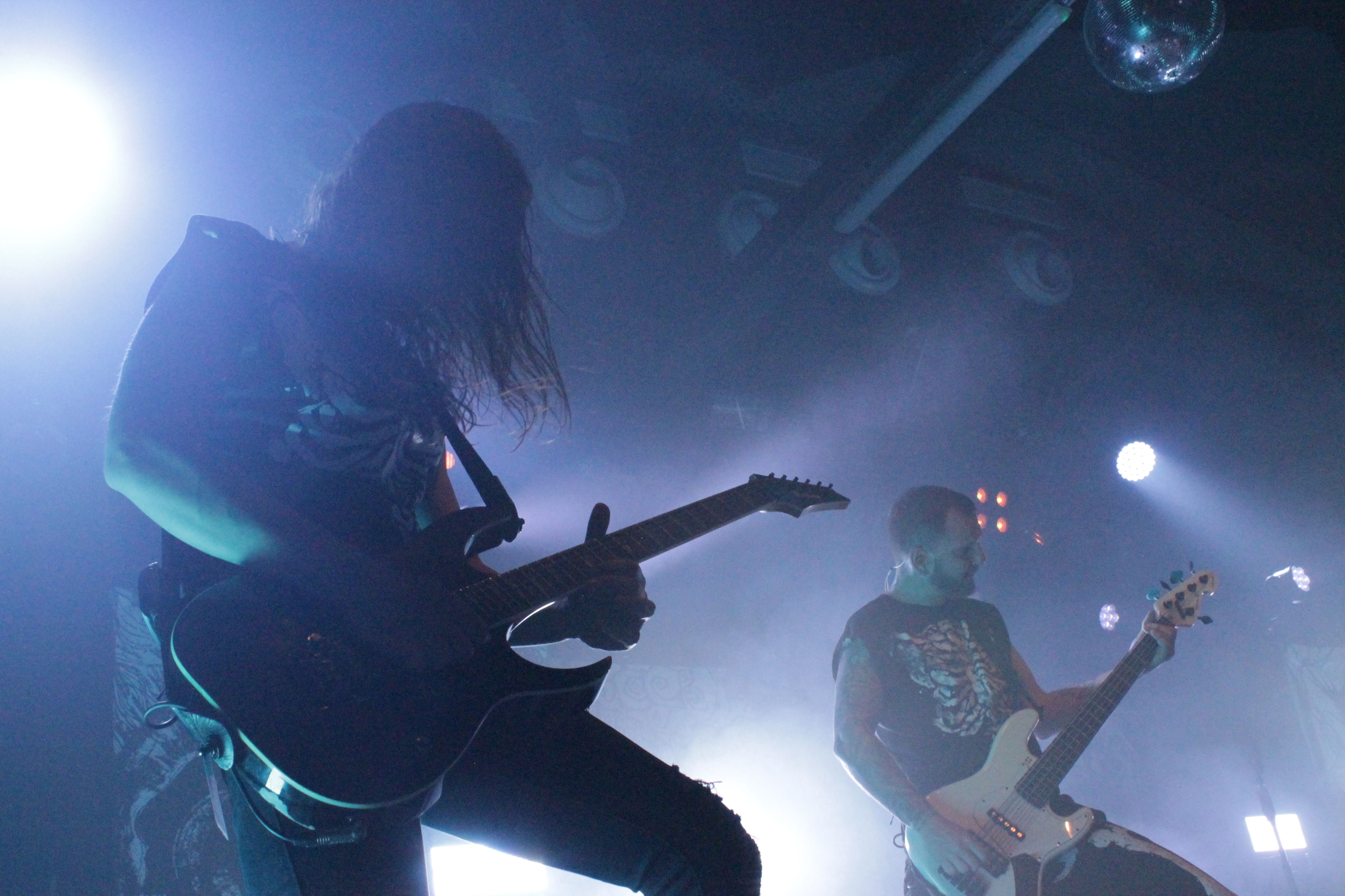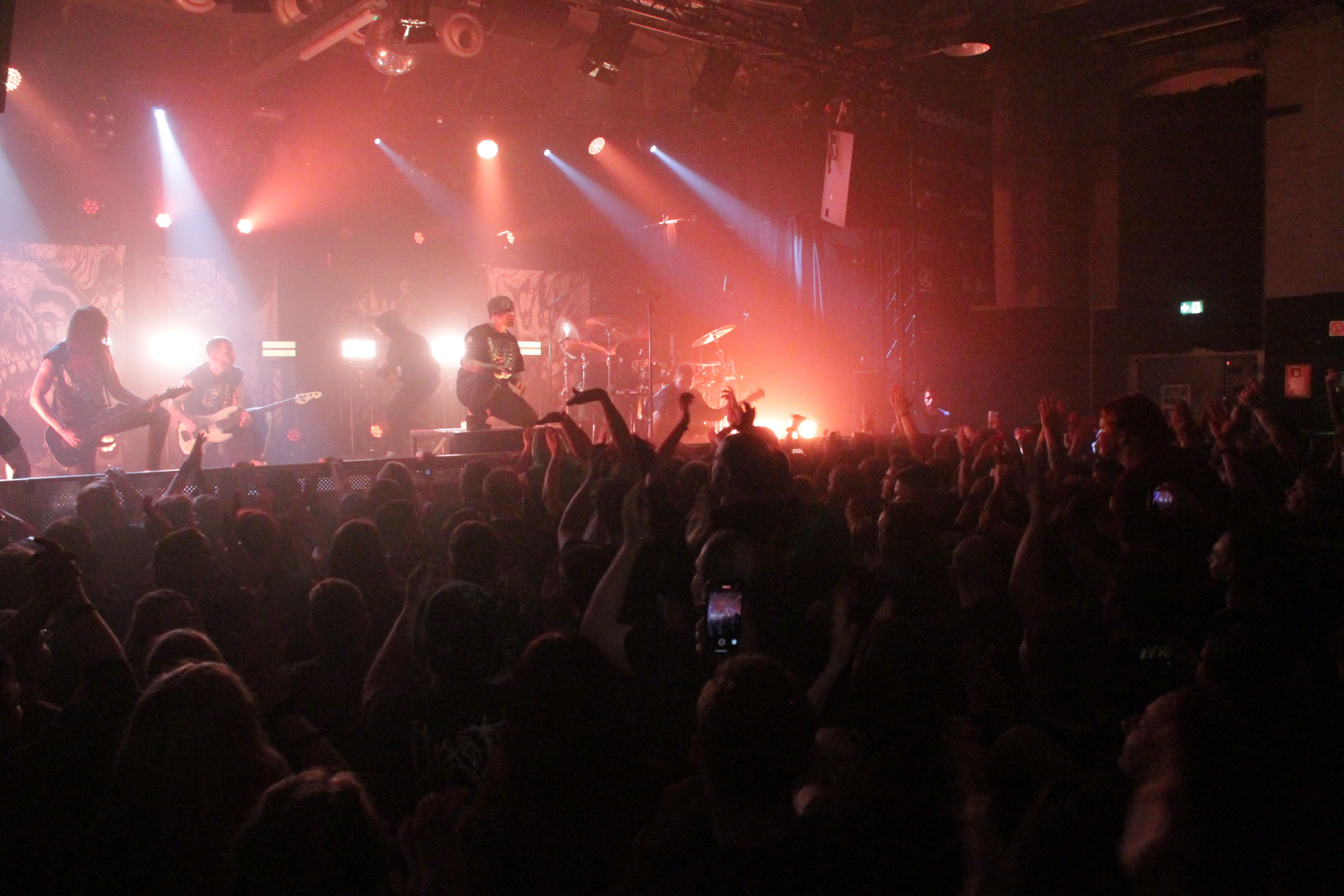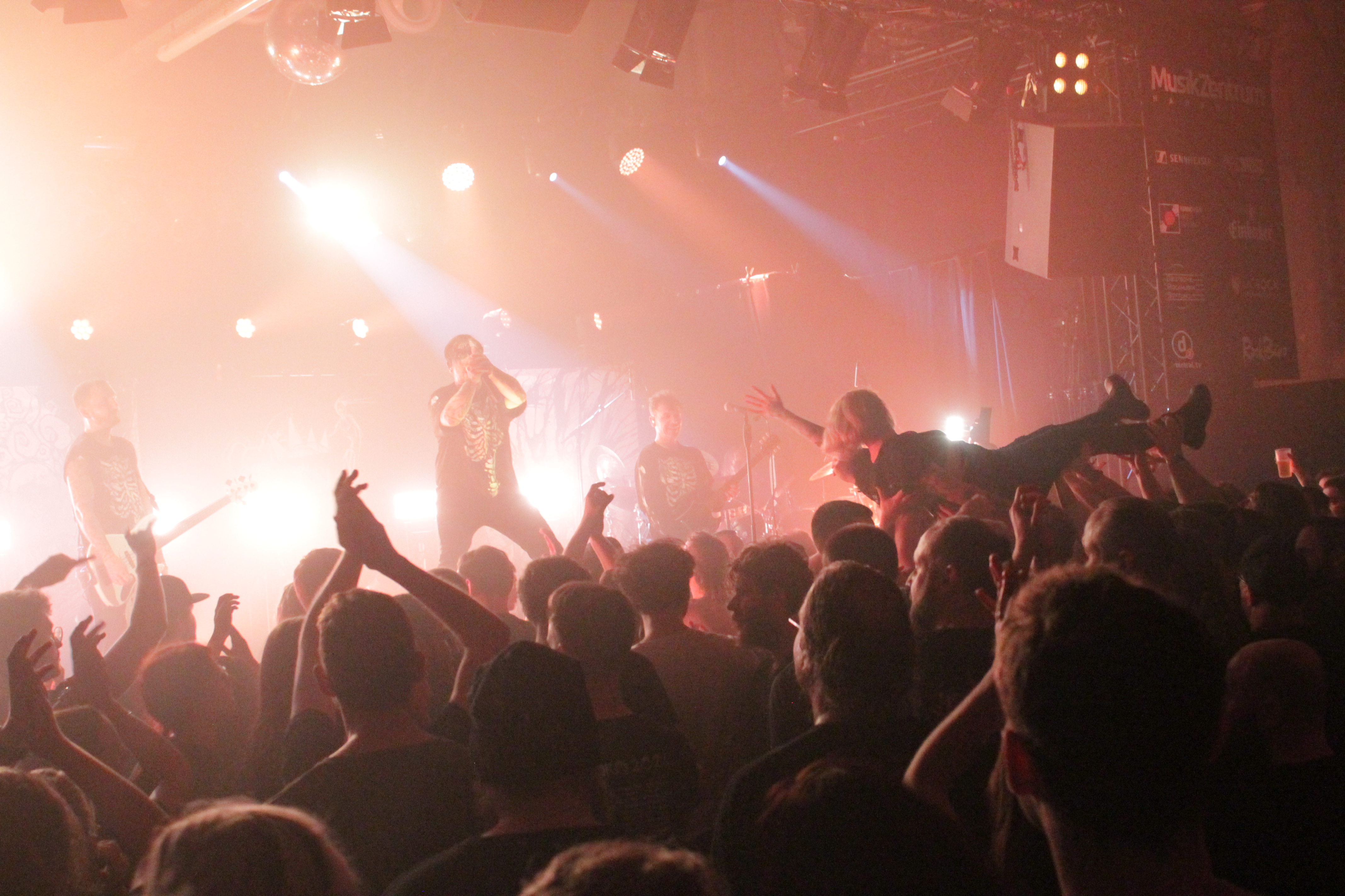 Dann war es endlich so weit. Zu den melodischen Klängen von "Everybody" von den selbst in Metalkreisen nicht ganz unbekannten BACKSTREET BOYS betraten CALLEJON die Bühne, und zwar mit "Willkommen in Metropolis" als Opener - damit hatte ich nicht gerechnet! Es folgte der ordentliche Banger "Palmen aus Plastik" vom Rap-Cover-Album "Hartgeld im Club". Mit "Blitzkreuz" begaben wir uns noch weiter in die Vergangenheit, was für einen Callejon-Nostalgiker wie mich natürlich genau die richtige Richtung der Zeitlinie darstellte. Es dauerte bis zum vierten Song, bis Callejon mit "Mary Shally" den ersten Song ihres aktuellen Albums "Eternia" spielten. Direkt danach ging es zurück in die Vergangenheit mit "Dunkelherz" vom 2015er Album "Wir sind Angst". Offensichtlich steckt eben jenes dunkle Herz in den meisten Fans, denn der Moshpit bebte während jeder Strophe, nur um beim Refrain in einen lautstarken Chor umzuwandeln. Doch zurück in die Metropole, denn mit "Gottficker" spielten CALLEJON nicht nur einen der stärksten Songs des vorherigen Albums, sondern sorgten auch für noch mehr Schweiß, der von der Decke tropfte. Damit niemand zum Luftholen kam, wurde direkt mit der dritten Version von "Porn from Spain" weitergepowert. Es bereitete definitiv viel Freude, einen ganzen Raum "Ole, ole, ganz Deutschland hasst die AFD" rufen zu hören. Zum Runterkommen folgte "Utopia" vom eher ambivalent aufgenommenen Album "Fandigo", wobei der ganze Raum überraschend textsicher war - klasse! "Die Krähe mit dem Schädelbauch" folgte, und langsam fragte ich mich, ob es nicht doch eher die Metropolis-Tour war (was mich nicht im Geringsten gestört hätte, obwohl ich "Eternia" auch wirklich gut finde!). Mit dem Ärzte-Cover "Schrei nach Liebe" wurde das ganze Publikum erneut in Wallung gebracht, und das mit einer Message, die leider an Aktualität nicht verliert. Mit der anschließenden Ballade "Kind im Nebel" durften sich alle zwar etwas beruhigen, aber keiner konnte Luft holen, da alle leidenschaftlich mitsangen - ein Gänsehautmoment! Aus dem Nebel ging es in "de(r)n Wald", einem weiteren Song von "Metropolis". Anscheinend liegen hinter dem Wald wieder die Minen, denn unsere musikalische Erzählung ging mit "Unter Tage" weiter. Doch Callejon wären nicht Callejon, wenn sie sich nicht mit einem Knall verabschieden würden. In diesem Fall sogar mit zwei: Erst "Was du Liebe nennst", bei dem im Pit noch einmal richtig die Post abging, und anschließend "Porn from Spain 2", was dazu führte, dass unzählige schwitzende Fans auf dem Rückweg mit einem breiten Grinsen umdrehten, um noch einmal richtig abzufeiern.