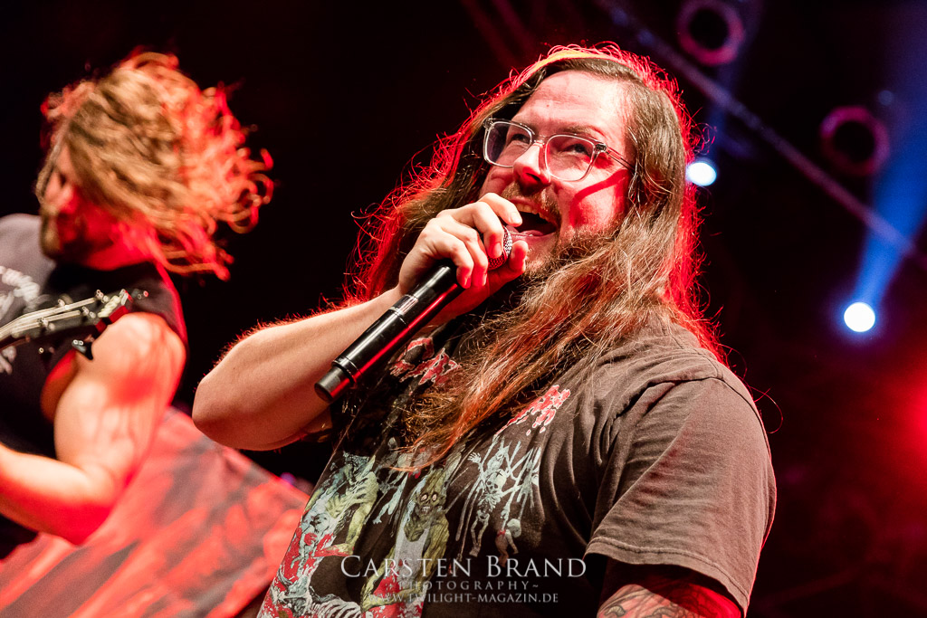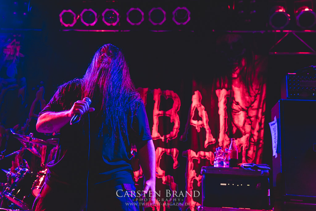 Dann wird es dunkel und Zeit für den Headlinerdes Abends. Spielten die Vorband unter sehr guten Lichtverhältnissen, bleibt die Bühne bei CANNIBAL CORPSE stilecht recht düster. Ein wenig rote Schummerbeleuchtung unterstützt von ein paar blauen Spitzlichtern müssen ausreichen. Die Herren um Mastermind Fisher knüppeln mit neuem Material nach vorne. "Code of the slashers" eröffnet den Corpse-Reigen an diesem Abend. Dieser, für Corpse´sche Verhätlnisse fast schon ruhige Track, bildet den idealen Einstieg. Das Publikum ist von Sekunde 1 an dabei und zelebriert den Auftritt. Die Todeswalze gewinnt an Fahrt und führt mit "Only one will die" die Neuvorstellung des aktuellen Silberlings "Red before Black" fort. Musikalisch braucht man hier auf wenig Neuland zu hoffen. Aber das tut auch keiner. CANNIBAL CORPSE liefern genau das ab, wofür sie seit Jahren stehen: kompromisslosen Death Metal auf den Punkt gebracht. Die neuen Stücke passen hervorragend ins Schema und zeigen die Vielfältigkeit der Band. Es wirkt zu keiner Zeit so, als hätte man sich irgendwie neu erfinden müssen. "Scourge of Iron" bildet die Brücke zu älterem material. Die Corpser kehren für kurze Zeit zum Midtempo zurück. Allerdings ist diese Verschnaufpause nur als Anlauf zu werten. Mit gewohnte Dampframmen Manier geht es in den zweiten Teil der Setlist, gespickt mit Highlights aus der Discografie. Von "Pounded into dust" über "Devoured by vermin" bis zu "Stripped, raped and strangled" fehlt keiner meiner persönlichen Highlight der Band. Die Todesmaschiene CANNIBAL CORPSE marschier tunaufhörlich durch das Musikzentrum. Klassischer Weise wird die Setlist vom allseits bekannten Hammer Smashed Face abgeschlossen und das Publikum in die Nacht entlassen. Zusammenfassend haben CANNIBAL CORPSE einmal mehr bewiesen, dass sie eine unheimliche Live Macht darstellen und zu Recht an der Spitze der Death Metal Szene stehen. Eine klare Empfehlung an alle, die noch ausstehenden Tourdaten wahrzunehmen!