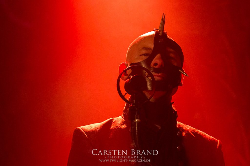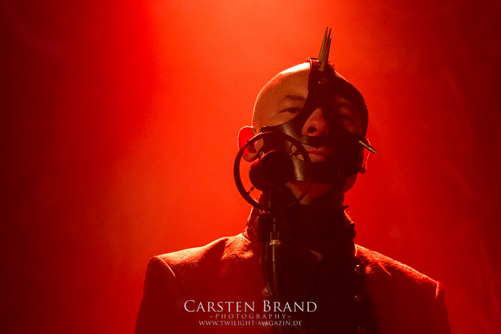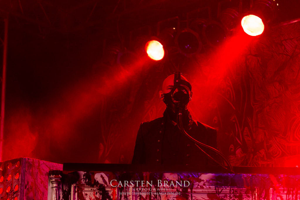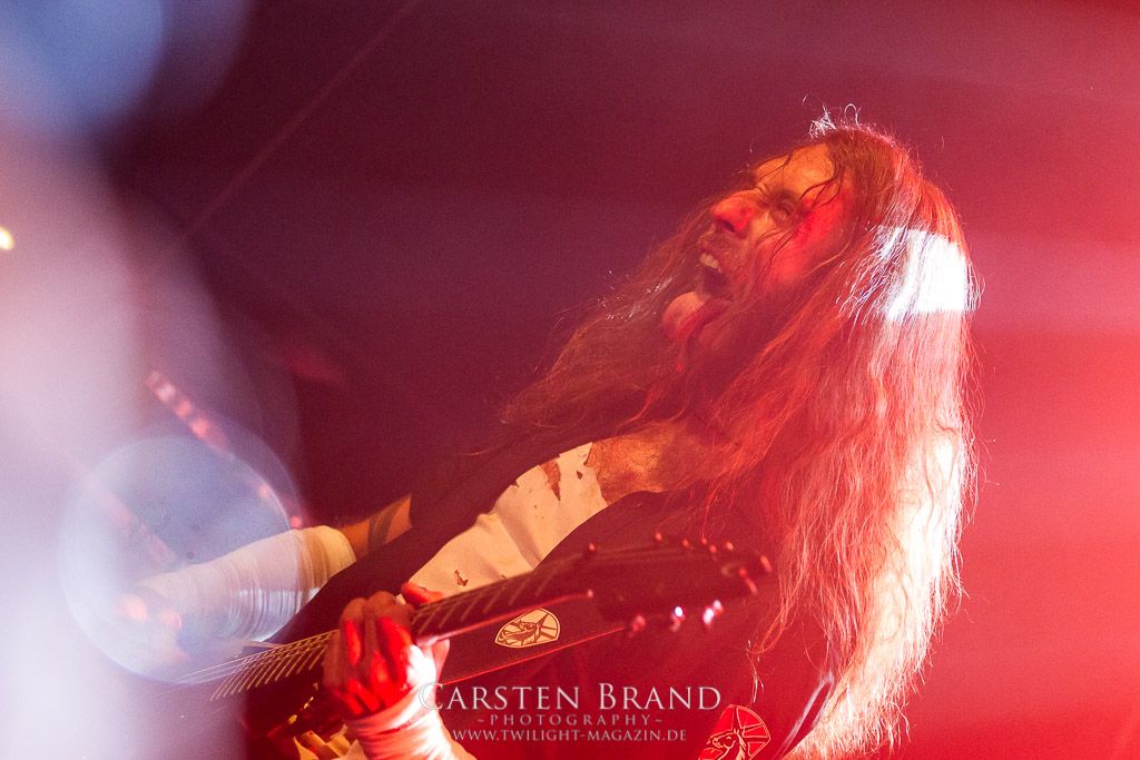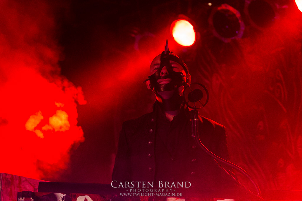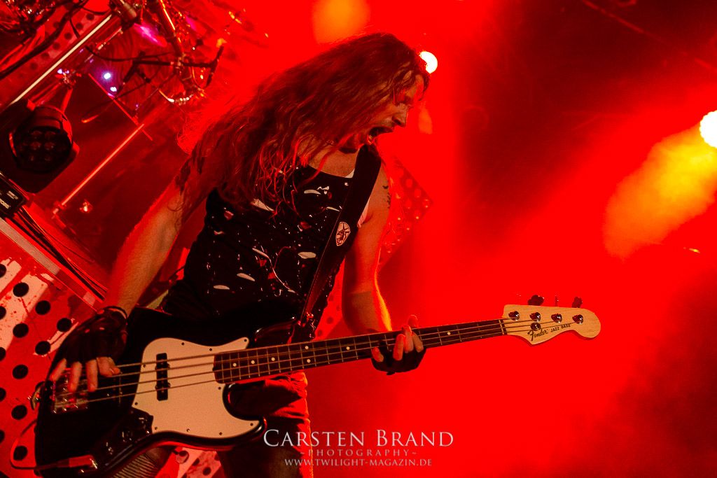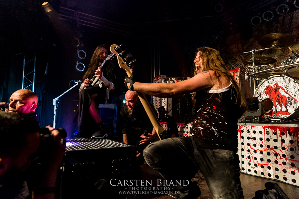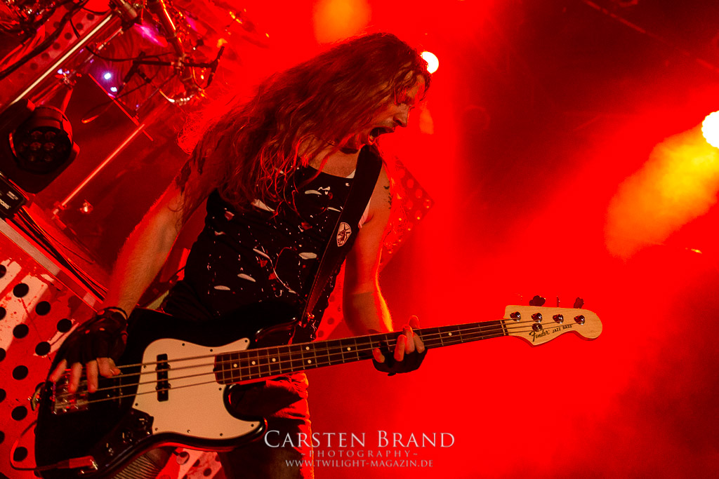 Nach etwas längerer Umbaupause geht es dann aber zu den Reitern. Neue Bühnendeko, neue Bühnenoutfits, alte Reiter. "Wir sind zurück" bildet den passenden Einstieg in eine wilde Setlist. Gepsielt werden alte und neue Songs, die Promotion für "Der rote Reiter" muss natürlich sein. Die Thüringer schaffen es aber sehr gelungen, eine Mischung aus dem gesamten Repertoire hervorzuzaubern. Auffällig ist auch die unheimlich gute Zusammenarbeit der Band. An diesem Abend passt einfach alles. Von Sänger Fuchs bis zu Dr. Pest verrichten alle Musiker einen hervorragenden Job. Mit "Der Seemann" trumpfen die Reiter mit einem Klassiker früherer Touren auf. Ein warm-spielen für das, was noch kommt. "Auf und nieder" vom neuen Album wird als erstes neueres Werk gespielt.  Alsbald geht es mit "Geopfert" wieder in ältere Zeiten zurück. Die Wucht, mit der die Band den Song runterschmettert, ist atemberaubend. Das hohe Niveau der Show spiegelt sich auch im Publikum wieder: Headbanger, Moshpit und teils eine Wall of Death zeigen eine überwältigende Aktivität. Die Stimmung sackt zu keiner Sekunde ab. So muss ein Konzert verlaufen. Das breite Repertoire und der Mix aus alten und neuen Sachen bieten für jeden angereisten Fan die passende Prise Reiter an diesem Abend. Mit "We will never die" bringen die Jungs ihre Quasi Hymne und holen kurz Luft, um dann mit "Smell of death" wieder volle Fahrt nach vorne zu preschen. Die fulminante Stimmung im Musikzentrum scheint auch bei der Band bestens angekommen zu sein. Neben der geplanten Setlist gibt es noch ein "Die Sonne scheint" obendrauf. "The great experience" schließt das Set und das Outro entlässt das Publikum.