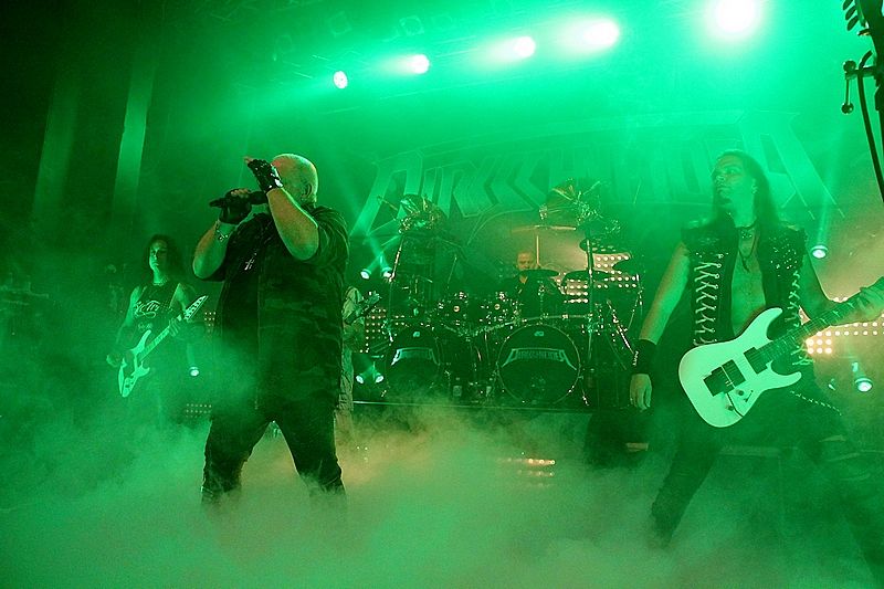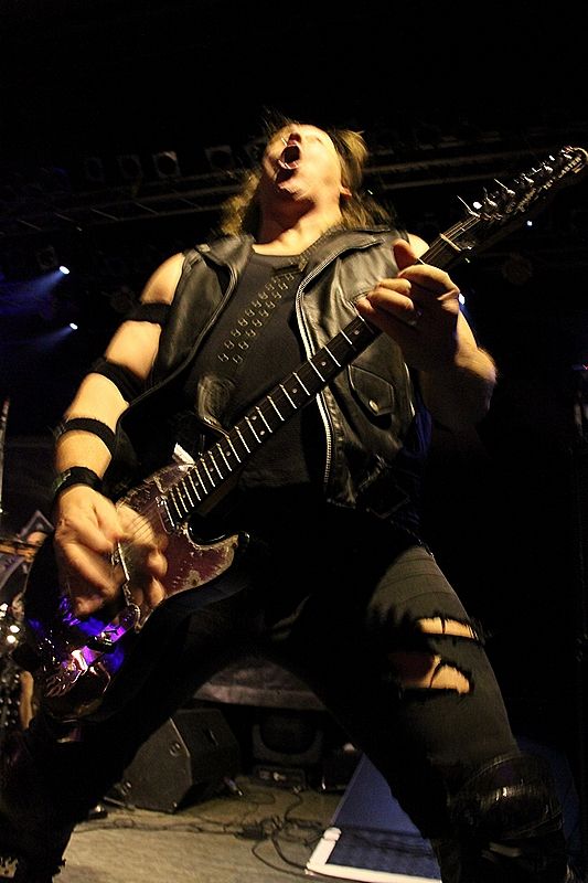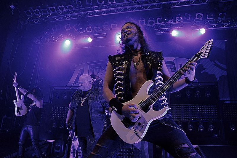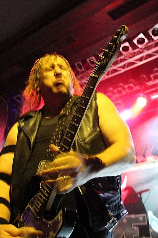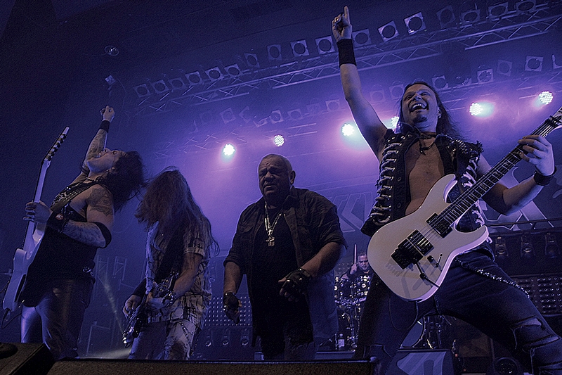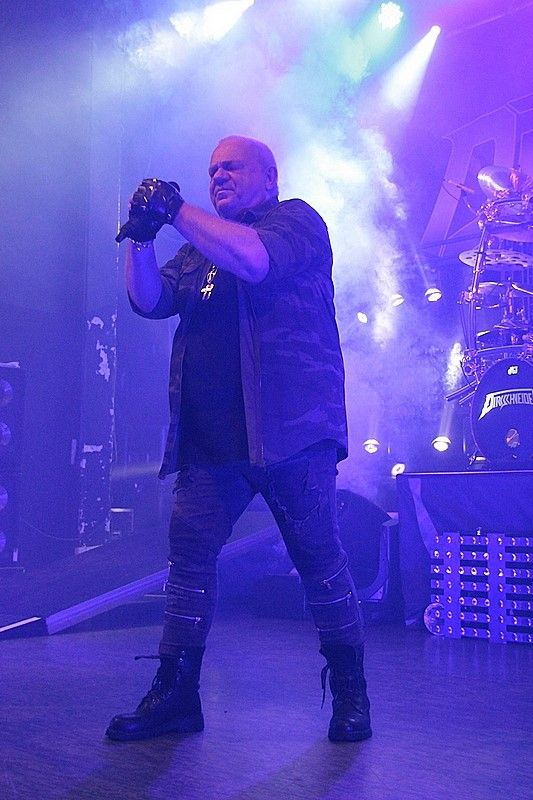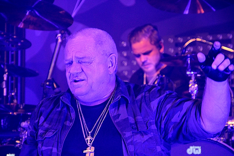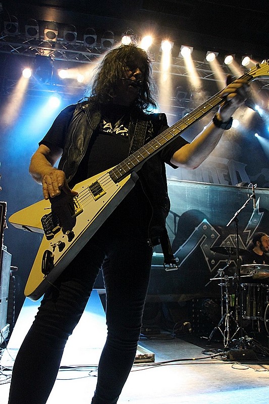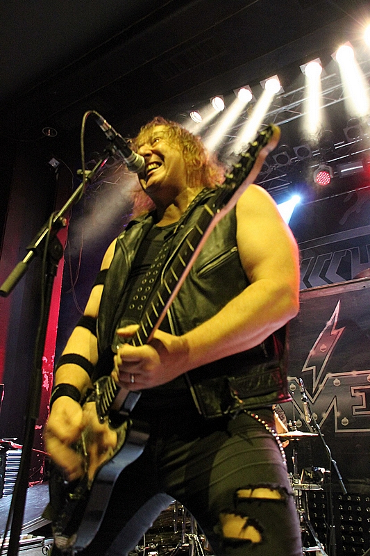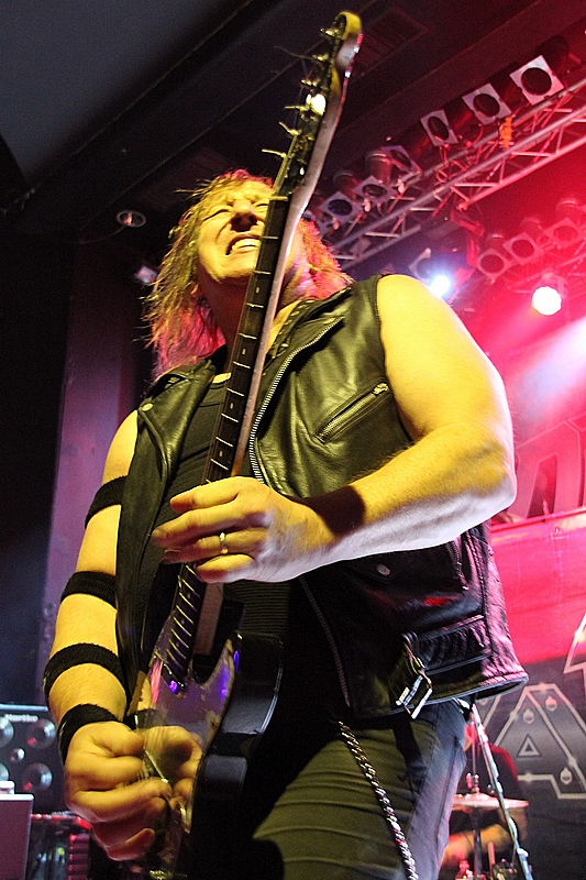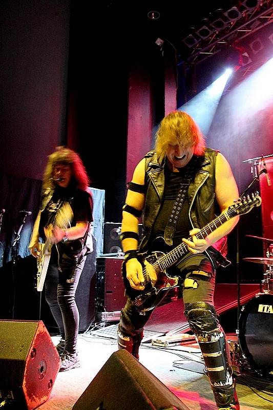 Trotz des verspäteten Einlasses begann die Show pünktlich um 20 Uhr mit der NWoBHM Legende RAVEN. Die Brüder Gallagher mussten auch am heutigen Abend ohne Drummer Joe Hasselvander auskommen, der bereits das ganze Jahr aus gesundheitlichen Gründen ausgefallen ist. Wer der junge Mann hinter den Kesseln war, weiß ich nicht – KILL RITUAL Trommler Dave Chedrick, der zuvor ausgeholfen hatte, war es jedenfalls nicht. Wie auch immer, optisch hätte vielleicht am besten der gute Gunter Gabriel in die Band gepasst, aber man sollte sich vom stolzen Alter der Herren nicht täuschen lassen, denn John (Bass, Gesang) und Mark (Gitarre) legten vom ersten Ton an richtig los. Vor allem Mark tobte über die Bühne wie ein Duracell-Hase an der Starkstromleitung. Und John war stimmlich erstaunlich gut erhalten und stieß während der Show den ein oder anderen spitzen Schrei aus, der einen Rob Halford in Verlegenheit gebracht hätte. Los ging es mit „Destroy all Monsters“ vom aktuellen „Extermination“ Album. Das 2015er Albumwurde zudem noch mit „Faster than the Speed of Light“, „Battle March Tank Treads“ und „Hard Ride“ gewürdigt. Ansonsten gab es einen wilden Ritt durch die Bandgeschichte und die anwesenden Fans bangten u.a. zu „All for One“, „Rock until you drop“ oder „Hung, Drawn & Quartered“, welches erstmals auf der Playlist stand. Neben dem obligatorischen Gitarrensolo gab es noch ein unfreiwilliges Basssolo, da Marks Gitarrentechnik nicht immer so wollte wie er. Gegen Ende der Show schob der Dreier noch eine Hommage an den jüngst verstorbenen Malcom Young (AC/DC) ein und zockte ein paar Takte von „It’s a long way to the top“. Dass der Song wahr ist, haben die Wahl-Amis von RAVEN am eigenen Leib erfahren. Vielen der Altrocker auf dem Balkon des Capitol schienen RAVEN überhaupt gar nicht bekannt zu sein, sie ließen sich aber dennoch zu wohlwollendem Kopfnicken hinreißen. Für mich zeigte sich live, was auch für die Alben der Band gilt: Neben einigen richtig guten Songs gibt es auch viel Füllmaterial. Trotzdem war ich positiv angetan vom Auftritt des Trios aus Newcastle.