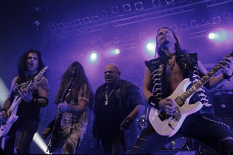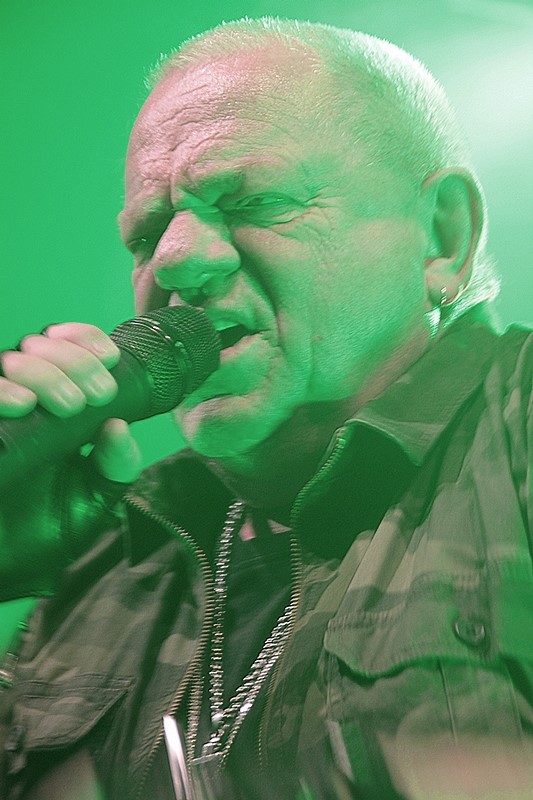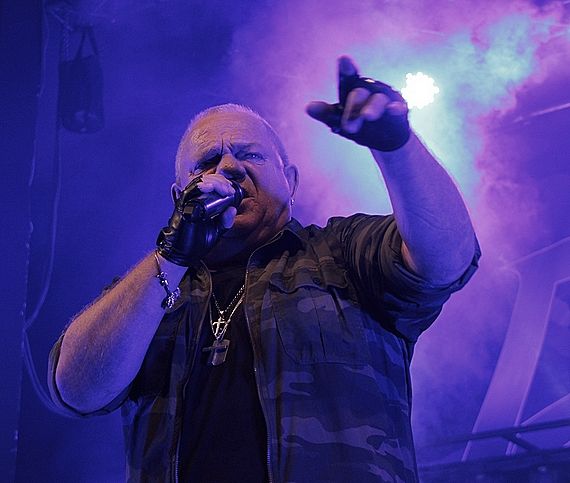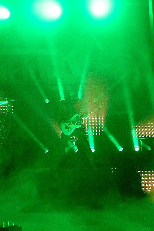 Nachdem die Bühne von der RAVEN Technik befreit worden war, hieß es zunächst einmal warten. Um 21.30 Uhr kündigte das Intro dann den bevorstehenden Auftritt von DIRKSCHNEIDER an. Warum man heutzutage immer komplette Songs über mehrere Minuten als Intro verwendet bleibt mir jedoch ein Rätsel. In grünes Licht gehüllt und mit mehr Nebeleinsatz als zu Beginn des Unternehmen Barbarossa enterten dann die Musiker die Bühne und eröffneten den ACCEPT-Gedächtnisabend mit „The Beast Inside“. Wie ein tropfender Wasserhahn animierte der stampfende Rhythmus des Songs zum mitschunkeln. Das Gitarrenduo Andrey Smirnov und Bill Hudson zeigte sich mal wieder perfekt aufeinander eingestimmt, während Basser Fitty zusammen mit Dirkschneider Sohn Sven für den richtigen Antrieb in der Rhythmus-Sektion sorgte. Altmeister UDO prustete und stampfte wie ein altes Dampfross auf dem Weg von Santa Clara nach Santa Fe auf der Bühne hin und her und quakte seine Lyrics in bekannter Manier in die Flüstertüte. Die ersten Highlights kamen für mich mit „Bullet Proof“ und „Midnight Mover“, welches es aus der alten Playlist ins neue Programm geschafft hatte. Wer entschieden hat, dass statt „I don’t wanna be like you“ lieber „Protectors of Terror“ ins Programm genommen werden sollte, weiß ich nicht, es war aber die falsche Entscheidung. Immerhin überzeugte die „Objection Overruled“ Ballade „Amamos La Vida“ deutlich mehr als ich anfangs befürchtet hatte. Immerhin, die ersten elf Songs schafften DIRKSCHNEIDER in guten 45 Minuten. Na ja, UDO war ja nie ein Fan der vielen Worte und so hielt er sich auch am heutigen Abend nicht mit großen Reden auf und beschränkte sich im Wesentlichen darauf zu sagen, dass er auch nicht wisse, was er sagen soll. Ja, dann sagt man eben am besten nichts und spielt lieber noch ein paar Songs. Mit „Stone Evil“ und „Breaker“ ging es in die zweite Runde des Abends, die durch ein wenig Solorei der Saitenhexer in die Länge gezogen wurde. Erstaunlich war dann, dass mit „Hard Attack“ ein Song des letzten ACCEPT Albums mit Dirkschneiderischer Beteiligung auf der Playlist stand. Ich hätte ja gern noch „Crossroads“ gehört, aber dass Peter Baltes für das Gesangsduett gewonnen werden könnte, wäre wohl doch etwas zu viel verlangt gewesen. Andererseits hat die Band mit „X-T-C“ ja auch einen Song vom „Eat The Heat“ Album gespielt, auf dem DIRKSCHNEIDER gar nicht mitgemacht hatte.