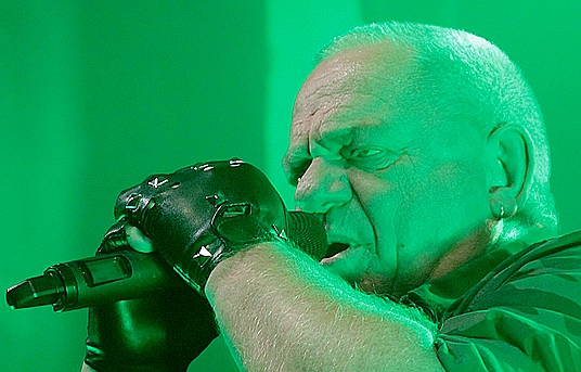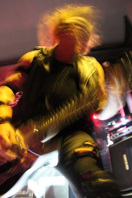 Den Fans um uns herum schien es trotzdem zu gefallen: Der eine schaute sich die Band zur Sicherheit lieber gleich durch eine Spacesonnenbrille an, die mir bisher nur von „Amboß“ aus „Otto – der neue Film“ bekannt war. Andere schüttelten und malträtierten den Nacken und Rücken ihres Begleiters dermaßen, dass ich vorsorglich schon mal die Halskrause rausholen wollte und mich sorgte, ob die Dame wohl versehentlich auf einer ungesicherten Stromleitung Platz genommen hatte. Zwischendurch wurde man um Leergut angeschnorrt, dessen Erlös dann in ein Tourshirt investiert werden sollte. Das ist mir, wenn ich mich nicht irre, zuletzt im Frühjahr 2000 im Göttinger JUZ beim LEATHERFACE Konzert passiert. Damals drängte sich ein ranziger Punk mit aufgeschnittener Cola-Dose durch die Reihen und versuchte, sich die Eintrittskarte zu refinanzieren. Eigentlich fehlte heute nur, dass der bekennende ACCEPT Jünger J.K. aus S. vom Balkon des Capitols in die Menge strullte. Aber wenigstens hatte es beim Kollegen neben uns mittags in der Kantine wohl Texanischen Bohneneintopf gegeben, so dass er jeden Song des Abends freudig auf der Analtrompete mitspielte. Genießen mit allen Sinnen eben.