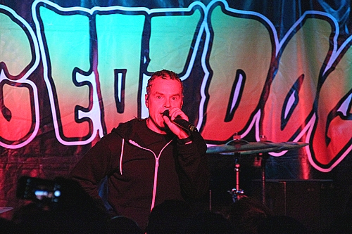 Es folgte eine gefühlt endlose Umbaupause plus Soundcheck und bevor es dann mit dem Headliner losging war es deutlich nach 22 Uhr. Doch endlich kamen die Jungs aus New Jersey doch auf die Bühne und Frontmann John Connor drohte erstmal allen Kippenknechten mit Extermination durch seine Wasserpistole wenn sie sich im Raum ne Kippe anzünden sollten. Warum die Band bereits die großen Bühnen der Welt gerockt hat, zeigte sich dann vor allem an den großen Hits. Der erste aus der Serie war sicherlich „Who’s The King“ bei dem der Raum überzukochen drohte. DOG EAT DOG Fans sind nun ja wahrlich nicht mit regelmäßigen Studioalben gesegnet, so konnte Connor vollkommen zur recht vom aktuellen Album sprechen, als er „Walk With Me“ ankündigte. Liegt aber auch schon 12 Jahre zurück die Scheibe. Jüngst ist mit „Brand New Breed“ immerhin mal wieder eine EP erschienen und diese wurde auf jeden Fall mit „XXV“ gewürdigt und auch „Vibe Cartel“ tauchte bereits früh in der Setlist auf. Mit „ISMS“ wurde die zweite Hitrakete aus dem Arsenal der Band gezündet – und der Song verfehlte sein Ziel nicht. Ausnahmezustand. Während an diesem Abend bereits viel Zeit vertrödelt worden war, hatte es die Band mit „Rocky“, vom „Play Games“ Album offenbar sehr eilig. Die Instrumental-Sektion ließ Connor kaum Zeit für ganze Sätze und der Song wurde im ICE-Tempo durch die Boxen gejagt und fast zu Unkenntlichkeit verzerrt. Schade. Da wir noch eine gute Stunde Autofahrt vor uns hatten und am Donnerstag um 5 Uhr aus dem Bett mussten, sind wir nach dem Song gegangen. Ich bin mir aber sicher, dass die Band nicht ohne „No Fronts“ von der Bühne gegangen ist.