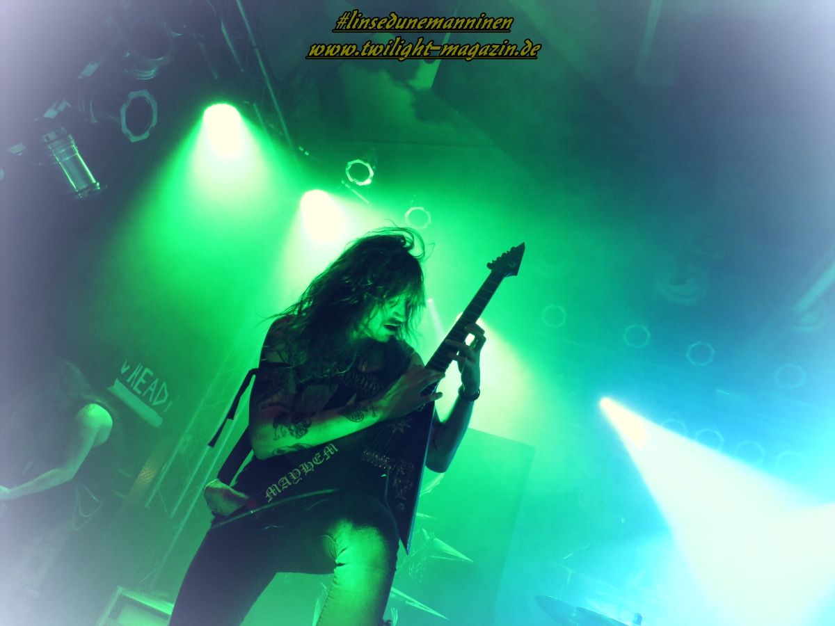 Als Brustlöser fungieren die Australier von ELM STREET, die - ohne dies abwertend zu meinen - wie eine räudige Sentenced-Version ohne Gothic, stattdessen mit klassischen Achtziger - Heavy und Thrash Metal - Einflüssen daher kommt. Das ist stilistisch nicht sonderlich spektakulär aber handwerklich mehr als solide. Trotz den klischeebeladenen Coverbildern auf den Bannern und Aufstellern ist es allerdings äußerst unterhaltsam und spaßig. Hannover taut im Laufe des Sets mehr und mehr auf und weiß die Jungs, die sich performancemäßig auf begrenzter Bühne und mit wenig Licht noch nicht ganz so souverän in Szene zu setzen wissen, nicht erst mit dem, Altmeister Dio gewidmeten, Rausschmeißer "Metal Is The Way" angemessen zu huldigen. EVIL INVADERS wissen den begrenzten Raum und das Licht da schon viel effektiver einzusetzen und legen gleich mal zwei Schippen drauf. Auch die Belgier sind bisher unter meinem Radar hindurch geflogen.