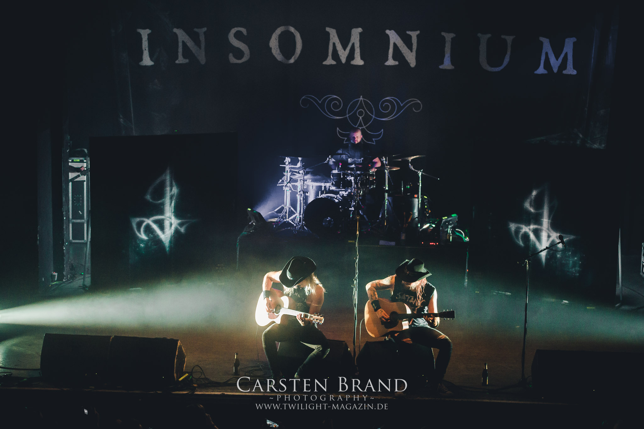Grave" hintereinander abzufrühstücken. Gefolgt von einem Rückblick auf alte Zeiten mit "Into the Woods" vom Across The Dark-Album.und "Through the Shadows" vom One for Sorrow-Album. Es wäre ja auch langweilig, die Songs in chronologischer Reihenfolge zu spielen, sodass es nun wieder mit "Pale morning Star" in aktuelle Gefilde ging um dann die Zeit ganz weit nach hinten zu drehen, was selbst den eingefleischten Insomnium-Fan verwundert haben dürfte: Vom 2006er Album "Above the Weeping World" gab es mit "Change of Heart" und "In the Groves of Death" zwei Kostproben. Mit "And Bells they toll", "Mute is my Sorrow" und "Ephemeral" endete der offizielle und gefühlt viel zu kurze Teil des Sets. Aber zum Glück kann man sich ja immer noch auf die Zugaben freuen. Und die hatten es insich! Als das Intor zu "The Primeval Dark" erklang, war die Meute aus dem Häuschen! Was für eine Wand als dann die Gitarren einsetzten und Sänger Niilo mit den ersten Worten loslegte. Wie auf der 2014er "Shadows"-Tour folgte danach "While we Sleep". Ein schöner Rückblick auf ein fantastisches Album und eine fantastische Tour.Dass die Finnen immer für einen Spass zu haben sind, sollte sich nun mit einem Akkustik-Medley zeigen. Markus Vanhalla und Jani Liimatainen kamen mit Cowboy-Hüten und ihren Akkustik-Gitarren auf die Bühne, setzten sich auf die Monitorboxen und begannen Interpretationen von "One for Sorrow / Revelation / Heart like a Grave" zu spielen. Immer einen Schluck aus der Bierflasche dazwischen und ein Grinsen
