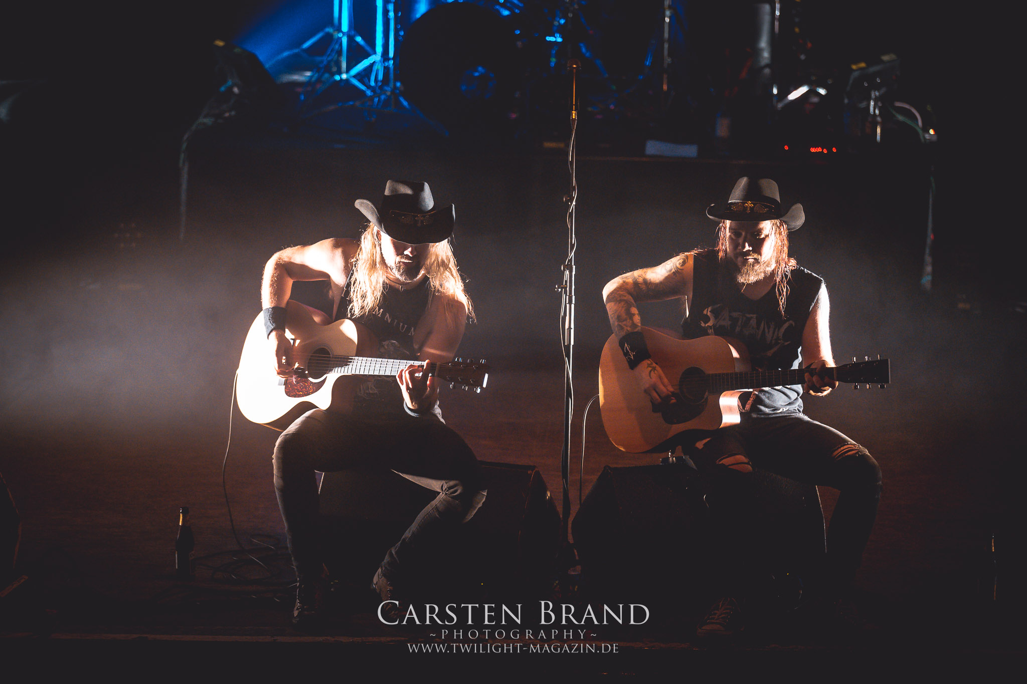Dass die Finnen immer für einen Spass zu haben sind, sollte sich nun mit einem Akkustik-Medley zeigen. Markus Vanhalla und Jani Liimatainen kamen mit Cowboy-Hüten und ihren Akkustik-Gitarren auf die Bühne, setzten sich auf die Monitorboxen und begannen Interpretationen von "One for Sorrow / Revelation / Heart like a Grave" zu spielen. Immer einen Schluck aus der Bierflasche dazwischen und ein Grinsen