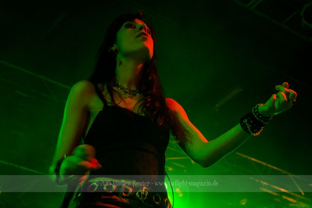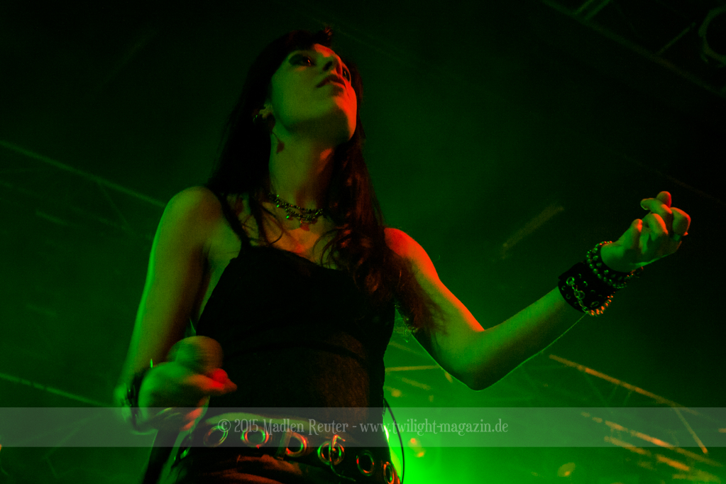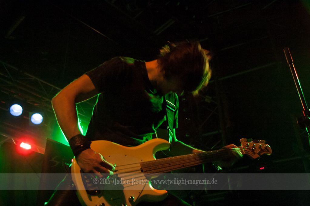 Den Anfang machten die Italiener von SINHERESY. Leider konnten sie mit keinem guten Sound aufwarten. Die Drums waren viel zu übersteuert und darunter hatte der Gesang gelitten. Hier war dies besonders fatal, da die Sängerin auch so schon eine relativ gebrechliche Stimme zu haben scheint. Und wären da nicht diese vielen, seltsamen Tempowechsel innerhalb der Songs, könnte die Band eigentlich ganz nett sein. Aber in jedem Fall schien die Band Spaß gehabt zu haben und sie bemühten sich sehr um Interaktion mit dem Publikum. Aber irgendwie wollte der Funke nicht so recht überspringen. Auch das Licht während ihrem Auftritt war nicht wirklich berauschend – alles ziemlich dunkel und nicht gerade fotografenfreundlich. Insgesamt machte die Band einen noch recht unerfahrenen Eindruck, was die, eher mittelmäßige, Performance erklären würde. Ganz warm wurde ich mit dieser Truppe einfach nicht, auch dem Rest des Publikums schien es ähnlich zu gehen.