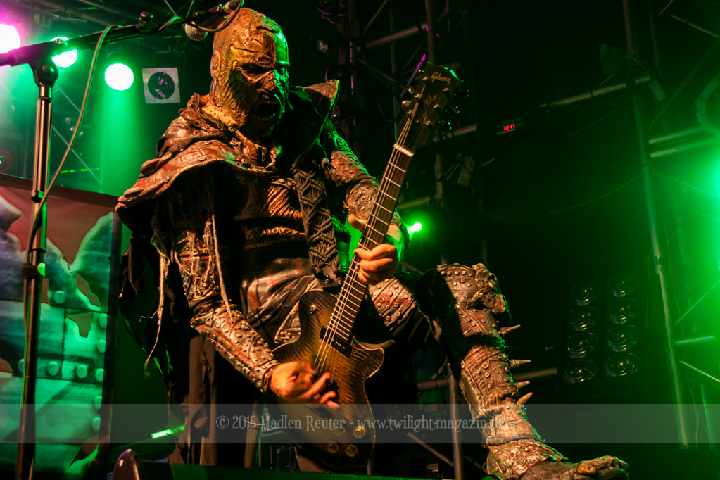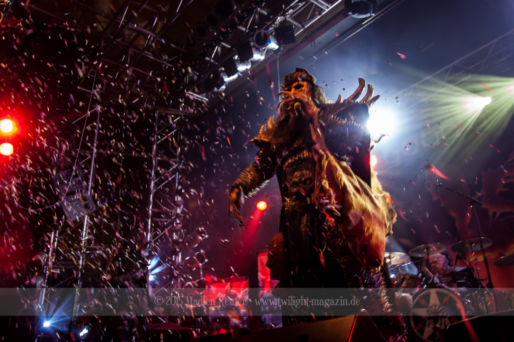 Dann wurde es auch schon Zeit für LORDI. Das Licht ging aus und „God Of Thunder“ hallte aus den Boxen. Kurz darauf betrat das freundliche Kabinenpersonal die Bühne, angeführt von einer Stewardess, die auf der Bühne eine kurze Sicherheitseinweisung gab. Mit „Nailed By The Hammer Of Frankenstein“ legte die Monstertruppe dann direkt mit einem genialen Stimmungsmacher los. Nicht nur die Band nutzte die Power dieses Songs aus, sondern auch das Publikum lässt sich in dessen Bann ziehen. Den Eurovision-Hit „Hard Rock Hallelujah“ brachten sie bereits als Drittes. Aber bei einer derart starken Setlist sei ihnen das erlaubt. Über den gesamten Abend war der Sound absolut spitzenmäßig, lediglich das Keyboard war etwas zu leise. Nebst wuchtigem Sound durften sich die Besucher auch über eine geniale Lichtshow freuen, die eine bombastische Stimmung erzeugte. Allerdings wurde die Setlist ein wenig gekürzt, und so flogen „Man Skin Boots“ und „Sir, Mr. Presideath, Sir!“ aus dem Programm. Schade um Letzteren, da dieser einfach auf die Bühne gehört hätte. Während „It Snows In Hell“ hat es dann kurzzeitig wirklich geschneit und bei „Hell Sent In The Clowns“ wurden die ersten Reihen von monströsen Clowns mit Kunstblut übergossen.