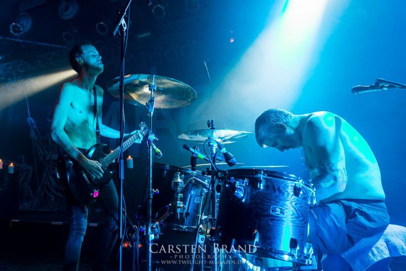 MANTAR hingegen stehen als Headliner nicht nur stilistisch komplett für sich selbst. Hanno und Erinc haben mit ihrem dritten Album "The Modern Art Of Setting Ablaze" noch einmal einen gewaltigen Schritt nach vorn machen können und den ohnehin schon einzigartigen Stil aus (Black)Metal, Stoner Rock, Punk/Crust und Noise weiter verfeinert. Und das zieht an. Zwar ist das Musikzentrum nicht ausverkauft aber rappelvoll und das an einem Montag Abend. Vor der Bühne ist kaum noch ein Durchkommen, als Mantar loslegen. Die selbsternannten Langzeitarbeitslosen haben es eigentlich nicht nötig, ihr Publikum mit Whisky zu bestechen. Trotzdem nimmt Hannover die Verkostung dankend an, während das Duo, das sich auf der Bühne wie gewohnt gegenüber steht, mit "Age Of The Absurd", "Seek + Forget", "Dynasty Of Nails", "Teeth Of The Sea" oder "Midgard Serpent" u. a. die eigentlichen Argumente liefert, die Halle in Schutt und Asche zu legen. Natürlich liegt auch hier der Schwerpunkt auf dem Material vom aktuellen Album obwohl natürlich auch die Gassenhauer der ersten beiden Scheiben nicht zu kurz kommen und sogar erfreulich viel vom Debut gespielt wird. Es dauert nicht lang bis die ersten Diver über das Publikum schweben, wobei Hanno die Crowd explizit dazu animiert, den Surfern das Erlebnis so nachhaltig wie möglich zu machen. "Era Borealis" leutet das Finale ein, das von "White Nights" und "Beserkers Path" gekrönt wird. Zugaben gibt´s nicht bei einem starken Gig, obwohl ich auch Mantar schon wesentlich intensiver gesehen oder erlebt habe.