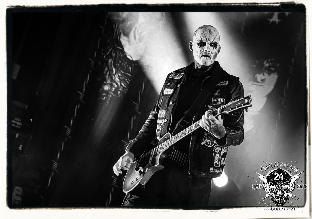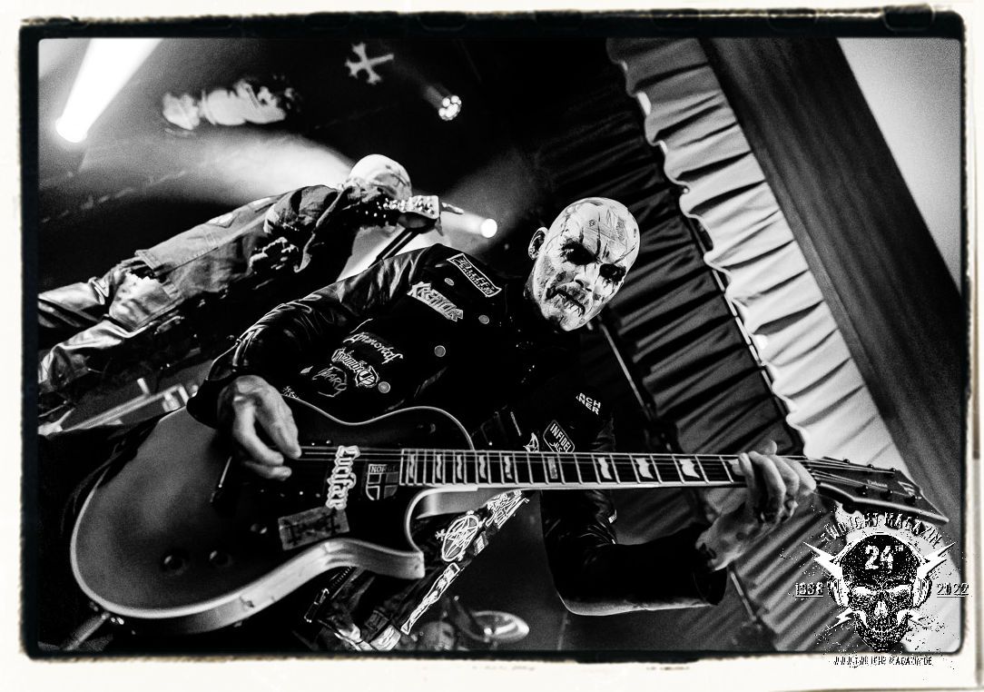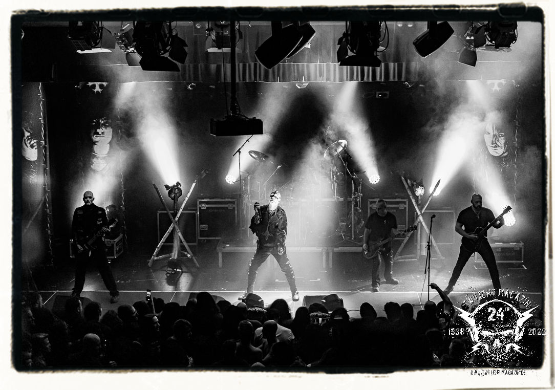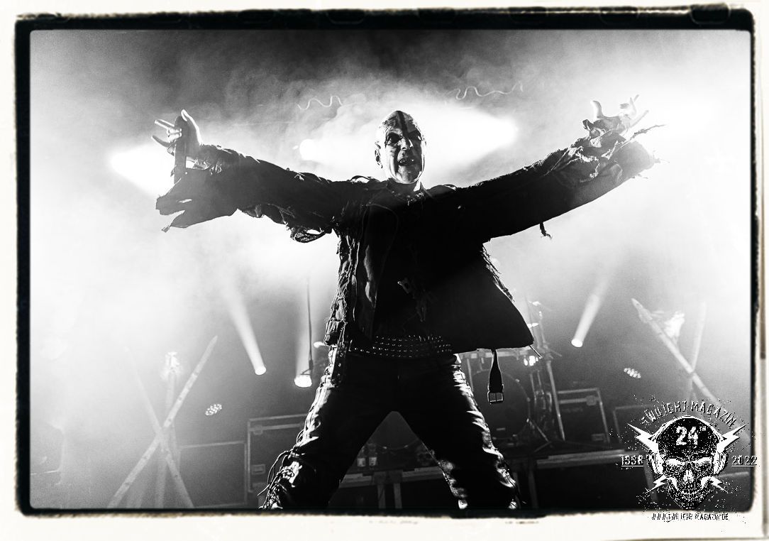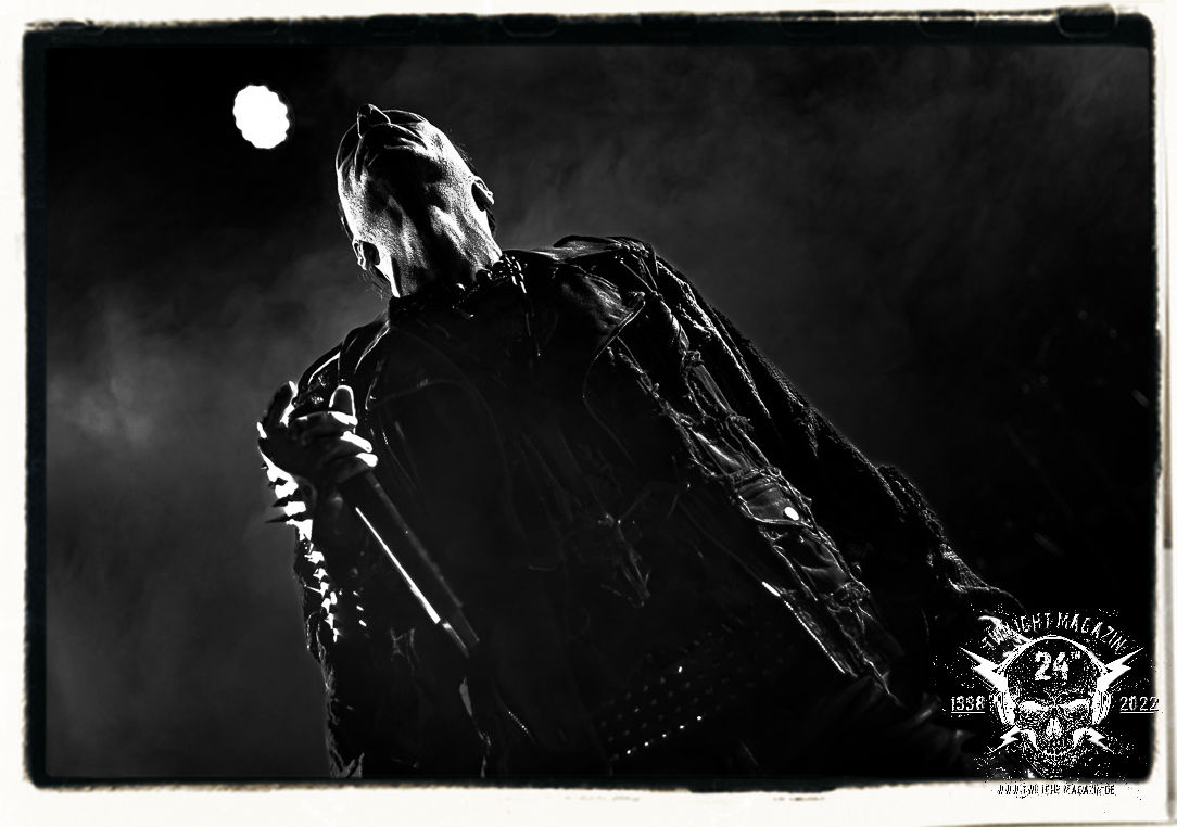 Die einstimmenden Klangkollagen gipfeln schließlich im Percussion-Intro "Silvester Anfang", welches nicht nur die "Deathcrush"-EP von 1987, sondern auch den Beginn des Konzertes einleitet. Endlich betreten Hellhammer, Necrobutcher, die beiden Gitarristen Teloch und Ghul sowie schließlich Sänger Attila Csihar die Bühne. Die Frage nach der Setlist stellt sich zunächst nicht. "Deathcrush", "Necrolust", "Funeral Fog", "Freezing Moon", bei dem die ursprüngliche "When it´s cold, when it´s dark..."-Ansage von Dead eingespielt wird, "Carnage", "Buried By Time And Dust", "Pagan Fears", "Chainsaw Gutsfuck" und schließlich das finale "Pure Fucking Armageddon" entsprechen den Songs, die MAYHEM im November 1990 mit Øystein Aarseth und Per Yngwe Ohlin alias Euronymous und Dead im Eiskeller zu Leipzig spielten. Bassist Necrobutcher lässt es sich nicht nehmen, seine ebenfalls auf dem Live-Album konservierte und seinerzeit der Irritation über die verhaltenen Publikums-Reaktionen geschuldete "Are you dead?"-Ansage noch einmal zu zelebrieren, um danach "Carnage" anzukündigen. Darüber hinaus verzichten MAYHEM glücklicherweise auf überflüssigen Firlefanz, sondern lassen die Musik sprechen. Und so zeichnen sie ein historisches Konzert und den Weg einer Band nach, die in den späten Achtzigern aus dem Death Metal - Underground kam und in der Entwicklung der Protagonisten und Musik schließlich im Black Metal Maßstäbe setzte. "Live in Leipzig" ist aus meiner Sicht auch gerade deshalb so bedeutend, weil es MAYHEM ungefiltert an der Schwelle zwischen den noch deutlich vom extremen Metal der Achtziger geprägten Frühphase in der Entwicklung zu dem Ausdruck zeigt, der schließlich mit dem 1994 veröffentlichten Meilenstein "De Mysteriis Dom Sathanas" nach dem Tod von Euronymous 1993 gipfelte und eine Ära der Band beendete. Natürlich ist das Format 2022 ein anderes und die Band um die verbliebene Rythmus-Sektion Hellhammber/Necrobutcher gewisserweise eine andere. Doch MAYHEM zelebrieren ihr Erbe tatsächlich würdevoll. Die Show ist nicht so chaotisch und abgefuckt, wie auf dem Party.San, was jedoch einer Doku zum Gig geschuldet sein könnte, die zum Revival parallel gedreht wird, und ich würde auch nicht ausschließen wollen dass auch dieser Abend in Leipzig seinen Weg auf einen Tonträger finden wird. Hellhammer ist wie meistens in der Dunkelheit bzw. im dezenten Licht hinter seinem Schlagzeug kaum zu sehen, dafür ist seine Präsenz in beeindruckender Weise zu hören. Attila, seit "De Mysteriis Dom Sathanas" über "Ordo ad Chao" (2007) bis heute wie sein Vorgänger Dead und Nachfolger Maniac untrennbar mit MAYHEM verbunden, beschränkt sich auf sein Organ und seine Fähigkeiten als Hohepriester blasphemischer Gesten und Symbolik. Die beiden Gitarristen Teloch und Ghul sind mittlerweile schon rund zehn Jahre dabei und verkörpern die Fähigkeit der Band, sich immer wieder neu zu erfinden. Sie sorgen für einen dichten Gitarrenteppich. Dabei treten sie nach außen ziemlich gegensätzlich in Erscheinung, der Norweger Teloch mit Corpsepaint wirkt extrem grimmig, die Les Paul-Adaption lässig tief hängend, der Brite Ghul ungeschminkt, durchtrainiert, die Gitarre dabei unter der Brust. Posieren können sie jedoch beide. Und Necrobutcher ist Necrobutcher, zuständig für Bass, Wein und "Kommunikation" mit dem Publikum.