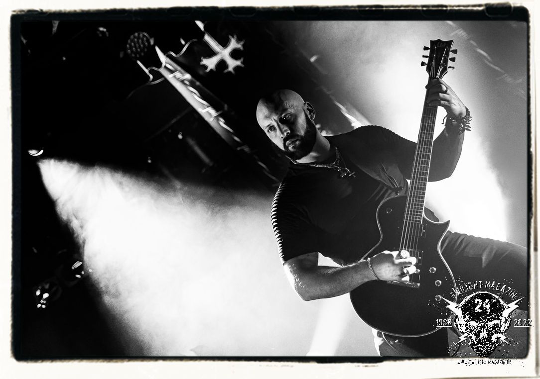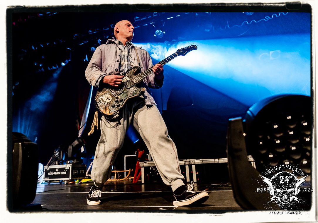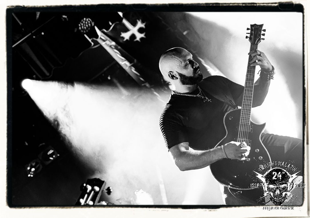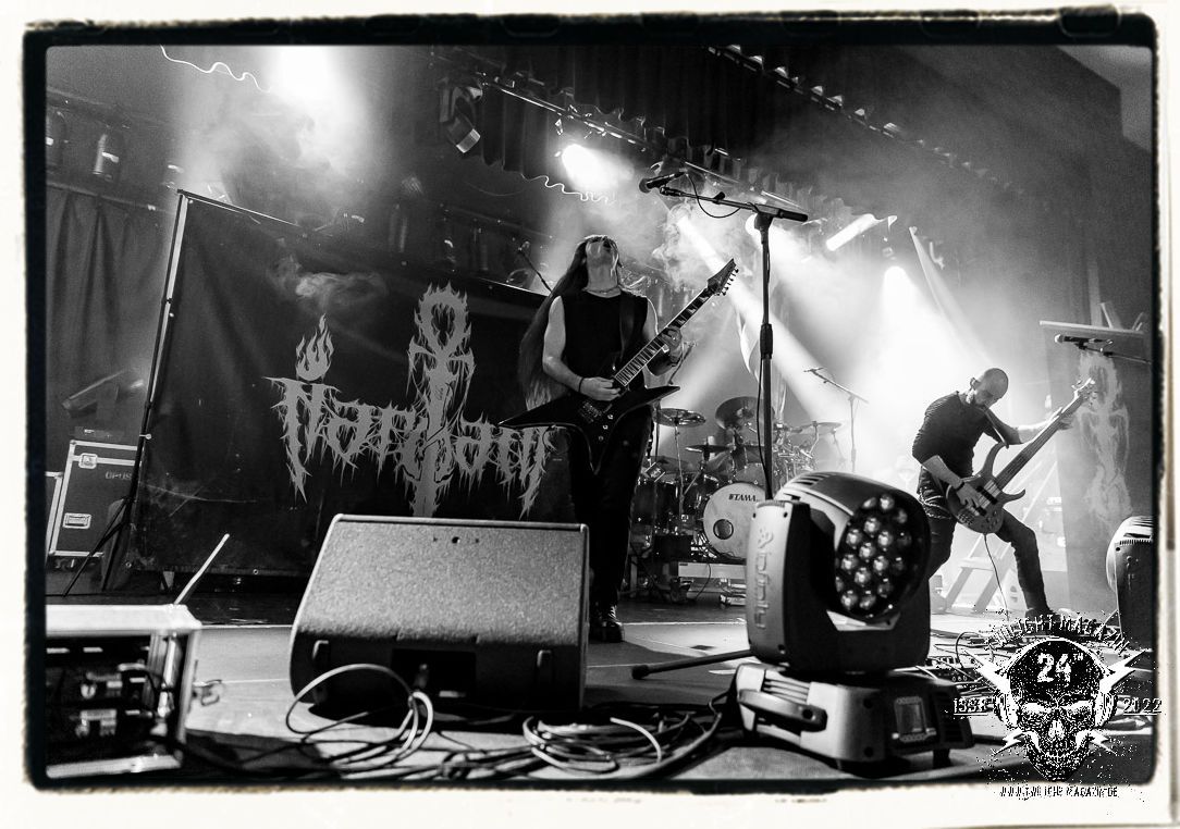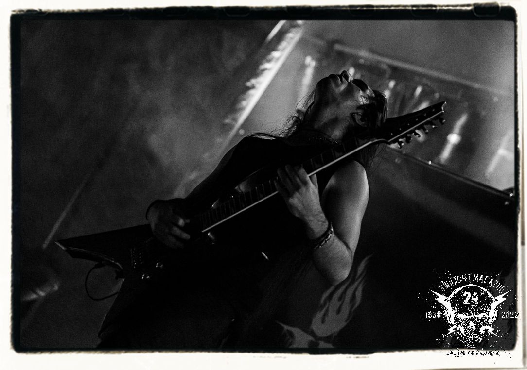 Die einstimmenden Klangkollagen gipfeln schließlich im Percussion-Intro "Silvester Anfang", welches nicht nur die "Deathcrush"-EP von 1987, sondern auch den Beginn des Konzertes einleitet. Endlich betreten Hellhammer, Necrobutcher, die beiden Gitarristen Teloch und Ghul sowie schließlich Sänger Attila Csihar die Bühne. Die Frage nach der Setlist stellt sich zunächst nicht. "Deathcrush", "Necrolust", "Funeral Fog", "Freezing Moon", bei dem die ursprüngliche "When it´s cold, when it´s dark..."-Ansage von Dead eingespielt wird, "Carnage", "Buried By Time And Dust", "Pagan Fears", "Chainsaw Gutsfuck" und schließlich das finale "Pure Fucking Armageddon" entsprechen den Songs, die MAYHEM im November 1990 mit Øystein Aarseth und Per Yngwe Ohlin alias Euronymous und Dead im Eiskeller zu Leipzig spielten. Bassist Necrobutcher lässt es sich nicht nehmen, seine ebenfalls auf dem Live-Album konservierte und seinerzeit der Irritation über die verhaltenen Publikums-Reaktionen geschuldete "Are you dead?"-Ansage noch einmal zu zelebrieren, um danach "Carnage" anzukündigen. Darüber hinaus verzichten MAYHEM glücklicherweise auf überflüssigen Firlefanz, sondern lassen die Musik sprechen. Und so zeichnen sie ein historisches Konzert und den Weg einer Band nach, die in den späten Achtzigern aus dem Death Metal - Underground kam und in der Entwicklung der Protagonisten und Musik schließlich im Black Metal Maßstäbe setzte. "Live in Leipzig" ist aus meiner Sicht auch gerade deshalb so bedeutend, weil es MAYHEM ungefiltert an der Schwelle zwischen den noch deutlich vom extremen Metal der Achtziger geprägten Frühphase in der Entwicklung zu dem Ausdruck zeigt, der schließlich mit dem 1994 veröffentlichten Meilenstein "De Mysteriis Dom Sathanas" nach dem Tod von Euronymous 1993 gipfelte und eine Ära der Band beendete. Natürlich ist das Format 2022 ein anderes und die Band um die verbliebene Rythmus-Sektion Hellhammber/Necrobutcher gewisserweise eine andere. Doch MAYHEM zelebrieren ihr Erbe tatsächlich würdevoll. Die Show ist nicht so chaotisch und abgefuckt, wie auf dem Party.San, was jedoch einer Doku zum Gig geschuldet sein könnte, die zum Revival parallel gedreht wird, und ich würde auch nicht ausschließen wollen dass auch dieser Abend in Leipzig seinen Weg auf einen Tonträger finden wird. Hellhammer ist wie meistens in der Dunkelheit bzw. im dezenten Licht hinter seinem Schlagzeug kaum zu sehen, dafür ist seine Präsenz in beeindruckender Weise zu hören. Attila, seit "De Mysteriis Dom Sathanas" über "Ordo ad Chao" (2007) bis heute wie sein Vorgänger Dead und Nachfolger Maniac untrennbar mit MAYHEM verbunden, beschränkt sich auf sein Organ und seine Fähigkeiten als Hohepriester blasphemischer Gesten und Symbolik. Die beiden Gitarristen Teloch und Ghul sind mittlerweile schon rund zehn Jahre dabei und verkörpern die Fähigkeit der Band, sich immer wieder neu zu erfinden. Sie sorgen für einen dichten Gitarrenteppich. Dabei treten sie nach außen ziemlich gegensätzlich in Erscheinung, der Norweger Teloch mit Corpsepaint wirkt extrem grimmig, die Les Paul-Adaption lässig tief hängend, der Brite Ghul ungeschminkt, durchtrainiert, die Gitarre dabei unter der Brust. Posieren können sie jedoch beide. Und Necrobutcher ist Necrobutcher, zuständig für Bass, Wein und "Kommunikation" mit dem Publikum.