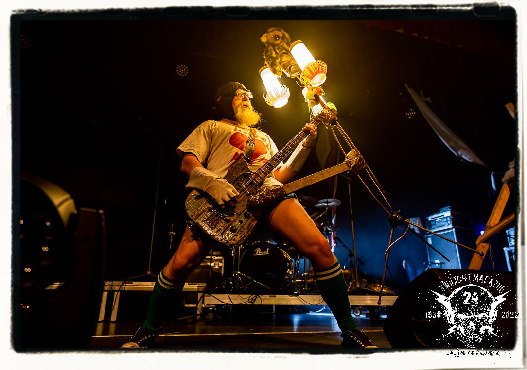 Die Urgesteine von MANOS waren schon am 26.11.1990 Vorband im Eiskeller. Damals normal, würde heute wohl kaum ein Veranstalter auf die Idee kommen, MAYHEM mit MANOS auf einen Einzelgig zu buchen. Allerdings verbindet MANOS mit den Schwarzmetallern MAYHEM ungeachtet vom kommerziellen Erfolg heute nach wie vor Die Anti-Haltung. Während sich diese bei MAYHEM in Form einer musikalischen Breitwand-Inszenierung zeigt, stehen MANOS für eine metallische Grind- und Hardcore-Persiflage, die Klischees einer testosterondominierten Szene ad absurdum führt. Das Ritual von Basser Eule, Gitarrist/Sänger Andrew und Drummer Ratze ist bunt, farbenfroh und lebensbejahend. Konzerte von MANOS dürfen und sollen Freude machen. Das Trio aus Querfurt in Sachsen-Anhalt ist nicht nur, vor allem aber im Osten Deutschlands absoluter Kult, weil sie es schaffen, brutalen Death Metal mit Hardcore, Punk und Grindcore über ihren ureigenen Humor zu verbinden, der trotz des subtilen Slapstiks authentisch, weder gekünstelt, noch albern wirkt. Und MANOS haben es bei ihrem Heimspiel daher auch nicht nötig, sich im historischen Schatten der Norweger zu verbiegen, sondern ziehen ihren Stiefel einfach durch. Einzig auf einen weihnachtlichen Tannenbaum am Bass verzichtet Eule am heutigen Abend. Ansonsten gibt´s das volle Programm inkl. "Ulehule", der Querfurter Bockwurst, "Komm in den Garten", "Biene Maja" oder "Teacher´s Pants" etc. pp. Gerutscht werden darf natürlich auch, denn das Publikum ist ein integraler Bestandteil einer jeden MANOS-Show. Nach rund einer Stunde ist der seriöse Teil des Abends dann auch vorbei. "Wer hat an der Uhr gedreht?", die Querfurter müssen sogar nachsitzen, da sie noch für eine Spontanzugabe auf die Bühne zurückgebrüllt werden.