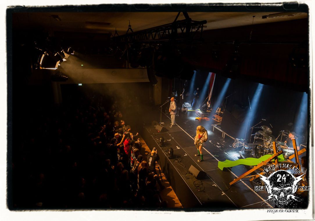 Danach ist Schluss mut lustig und es wird dunkel. Umbau und auch Soundcheck verlaufen zügiger als erwartet. Doch anschließend heißt es für alle in der mittlerweile gut gefüllten Location warten. Die Spannung steigt bei fahlem, düsteren Licht, das die Konterfeis der Protagonisten von 1990 - Dead, Hellhammer, Necrobutcher und Euronymus - in Szene setzt. Die vier übergroßen Banner hängen mit eben jenen schemenhaften Portraits, die einst das Originalplakat zierten, von der Decke und flankieren die Bühne auf beiden Seiten. Eine ganz eigene Geschichte könnte man über den Schweinekopf erzählen, der 1990 als Bühnendeko und Requisit zum Einsatz kam und sozusagen mit einem zweiten Leben beschenkt wurde. 2022 sind es vier Köpfe, aufgespießt auf Birkenholzpfähle, die am Bühnenrand präsentiert werden und das Schlagzeugpodest einrahmen.