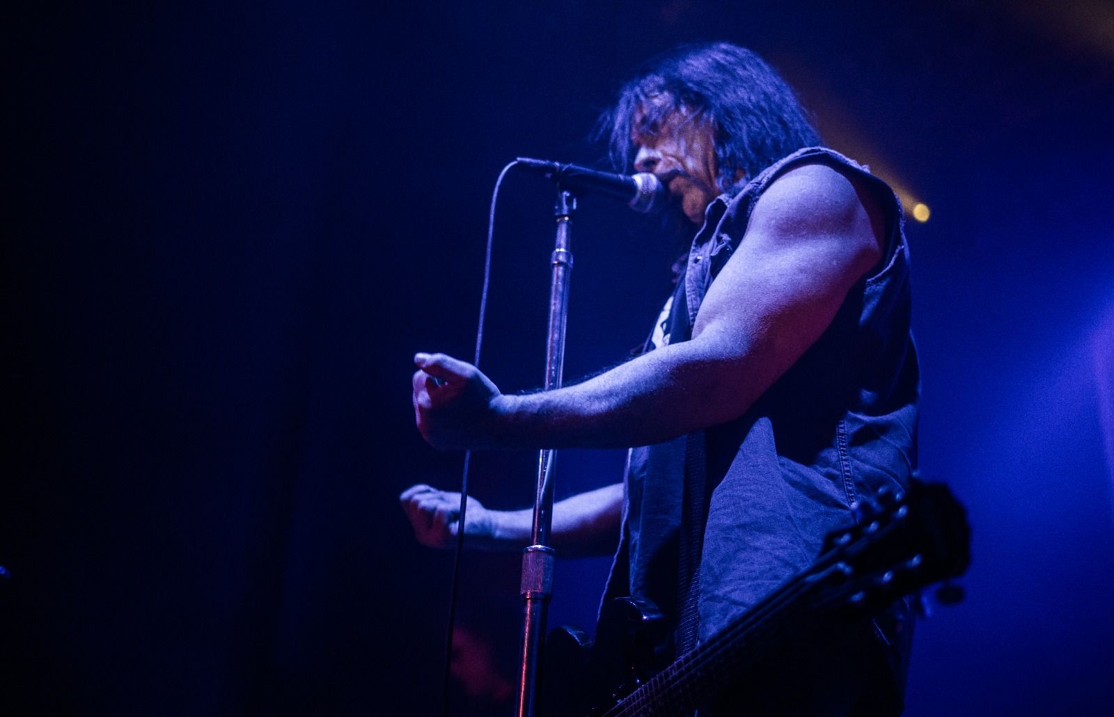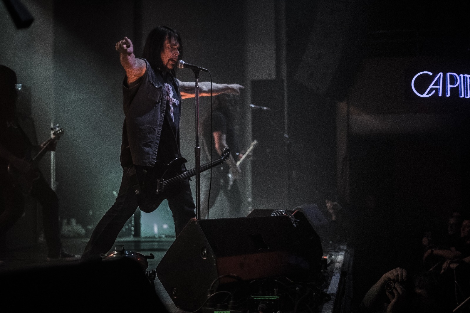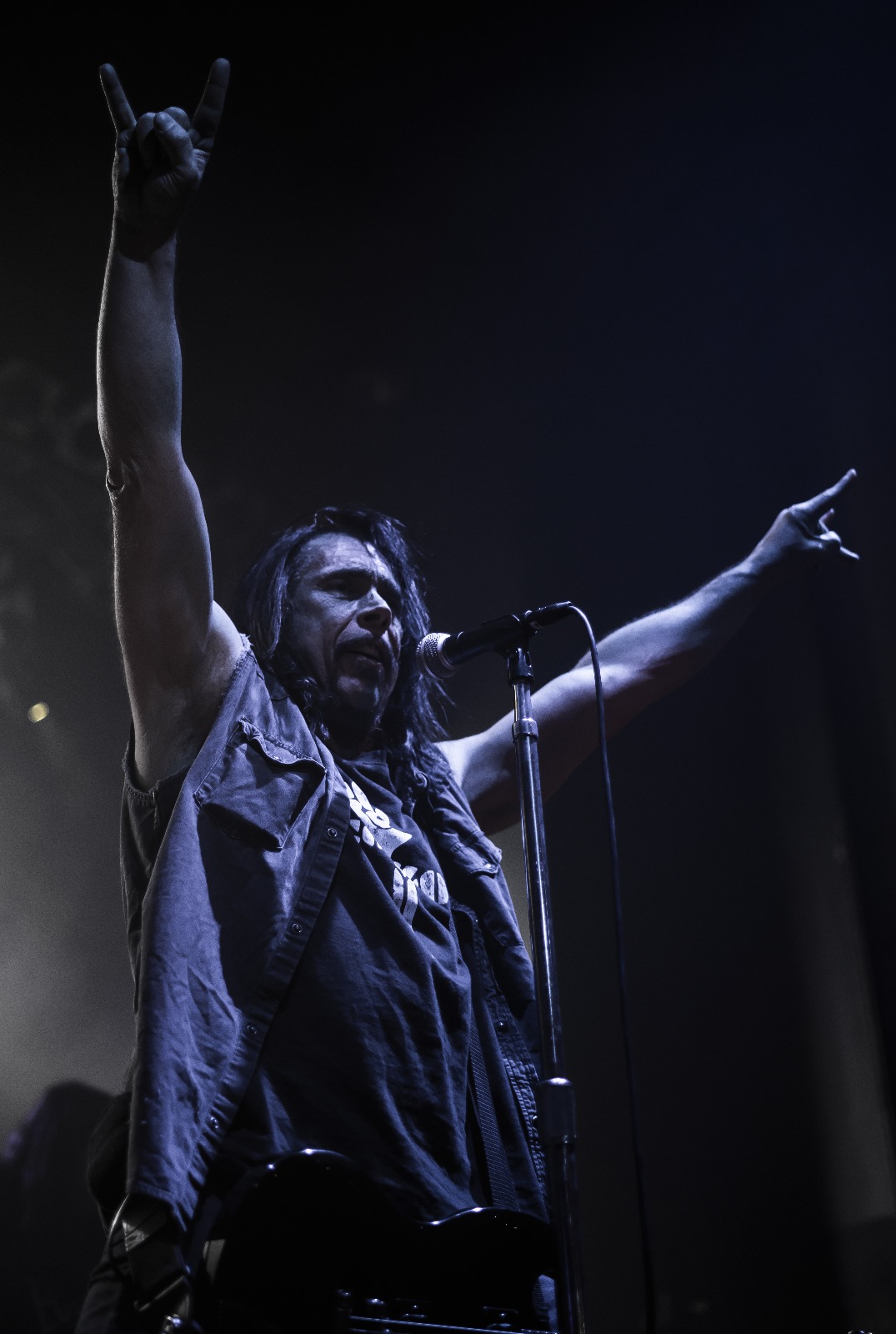 Punkt 21 Uhr war das Capitol dann gut voll und MONSTER MAGNET eröffneten ihre imposante Spracerock Show mit „Dopes To Infinity“. Der langsame, schleppende Groove baute langsam Spannung auf und schließlich eröffnete Dave Wyndorf den Gottesdienst zu Ehren ihrer Spacelordschaft, indem er voller Pathos sang und von der ersten Sekunde das Publikum fesselte. Es folgten im Laufe des Abends vor allem Klassiker der superaußerirdischen Spacelords. Der charismatische Wyndorf verbreitete durch Gestik und Gesang für seine amtlichen 61 Jahre unbeschreiblich viel Energie, Leben und Leidenschaft im Saal. Schnell stellte sich schnell ein gewisser Zustand der Trance ein, der durch eine psychodelische Licht -und Leinwandshow unterstützt wurde. Höhepunkt der Show war zugleich der letzte Song des regulären Sets „Space Lord“. Angestachelt durch den Hohepriester der psychodelischen Gitarrenkunst sang die gesamte Gemeinde den Refrain „Space Lord MOTHER FUCKER!“ voller Inbrunst. Doch dann: Licht aus und die dröhnenden Gitarren vor die Amps gestellt.