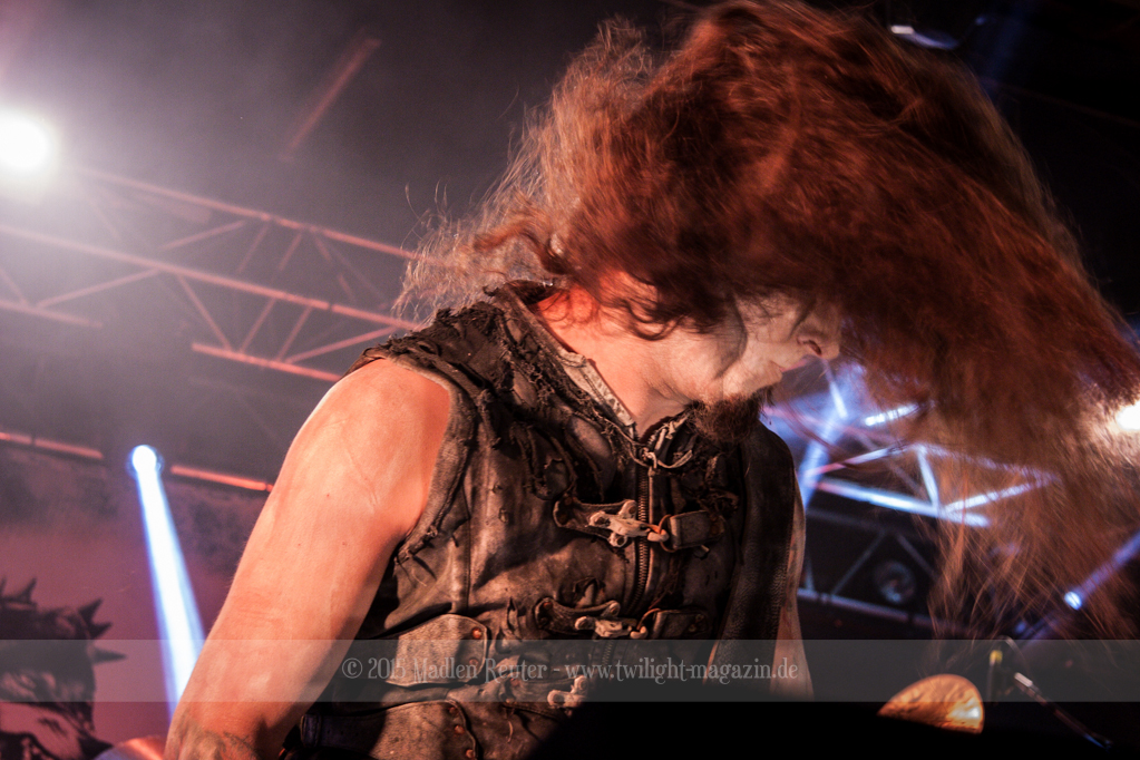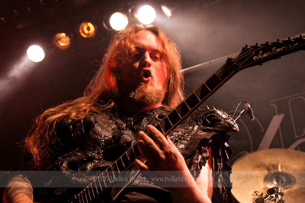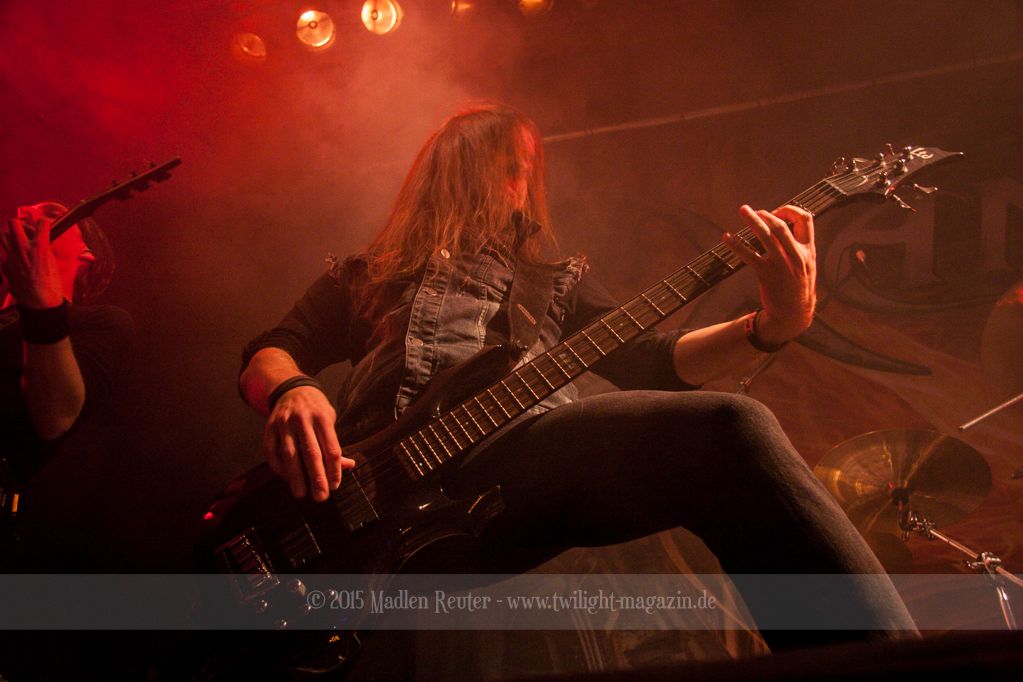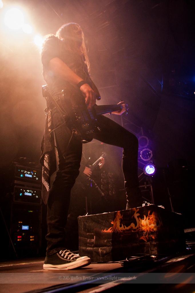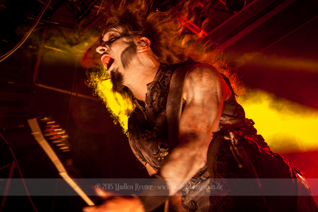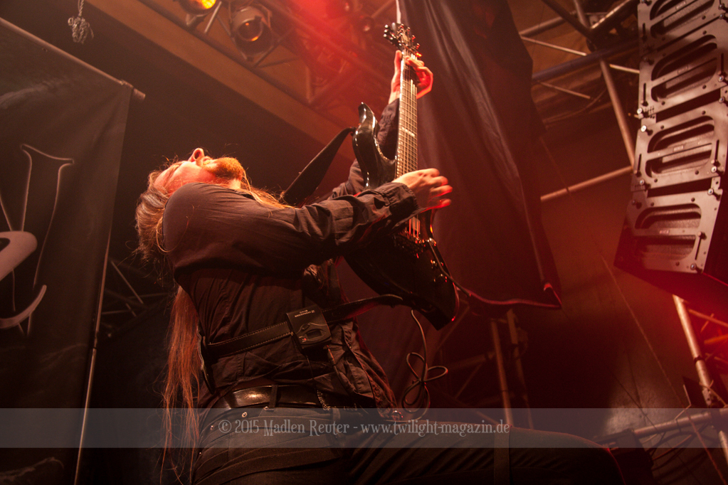 Nach kurzem Umbau wurde es dann Zeit für einen kurzen Ausflug nach Ravenhead. ORDEN OGAN übernahmen das Ruder und heizten den Anwesenden fleißig ein. Neben beeindruckenden Soli, fetten Riffs und brachialen Mitgröhlhymnen bestach die Band auch durch ihren Humor. Sänger Seeb erntet für seine lustigen Ansagen mehrfach Applaus. Auch sonst ist das Publikum fleißig dabei. Zwar brauchen die Besucher meist eine kurze Aufforderung, aber dann läuft es auch wie geschmiert. Die Setlist schien vor allem einen Schwerpunkt auf das neue Album („Ravenhead“, 2015) gesetzt zu haben. Grandios war es „Sorrow Is Your Tale“ live zu erleben, auch wenn mir „To New Shores Of Sadness“ eindeutig gefehlt hatte. Während vor der Bühne die Haare flogen, zockten Tobi und Seeb beeindruckende Soli auf ihren Gitarren. Dieses Teamspiel ist wirklich herrlich mit anzusehen. Und auch an diesem Abend fand sich wieder eine verirrte Seele, die mit lautstarken „Noch Ein Bier“-Rufen Aufmerksamkeit erhaschen wollte. Einzig richtige Reaktion vom Ordensoberhaupt: „Falsche Band man!“. Damit hatte sich die Geschichte für den restlichen Abend erledigt – Vielen Dank!
