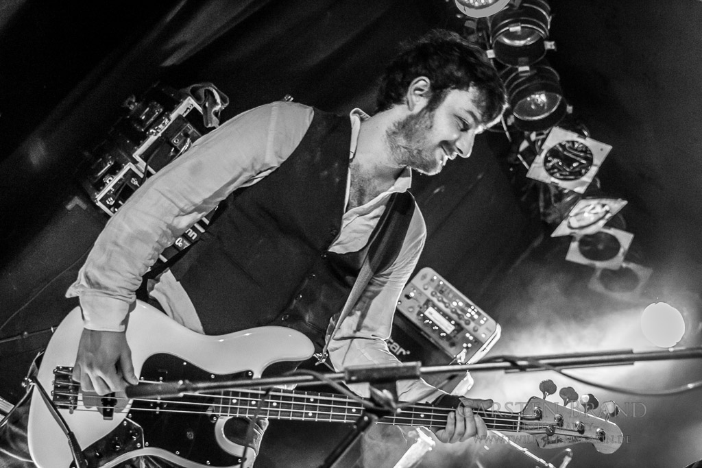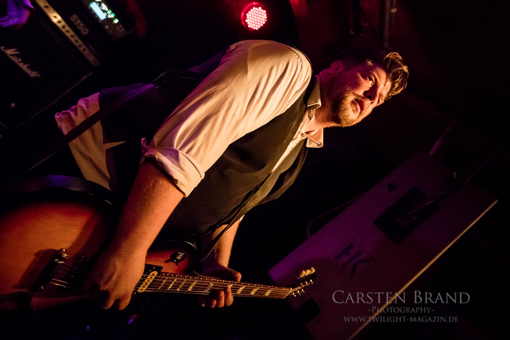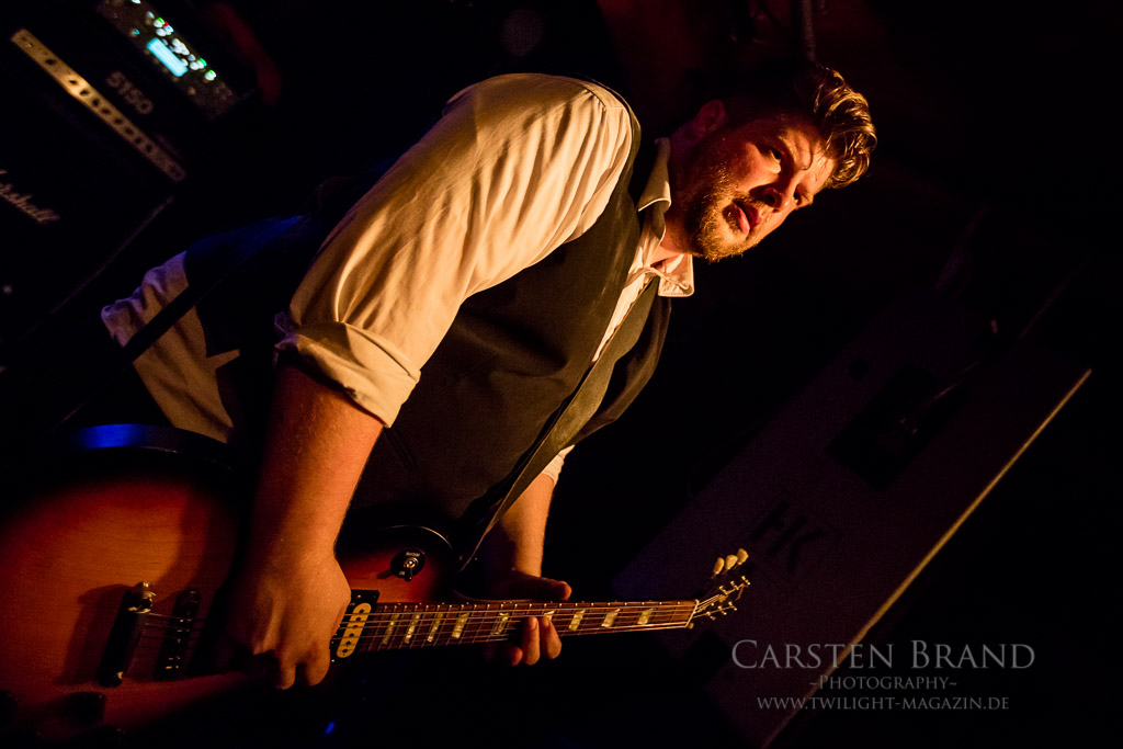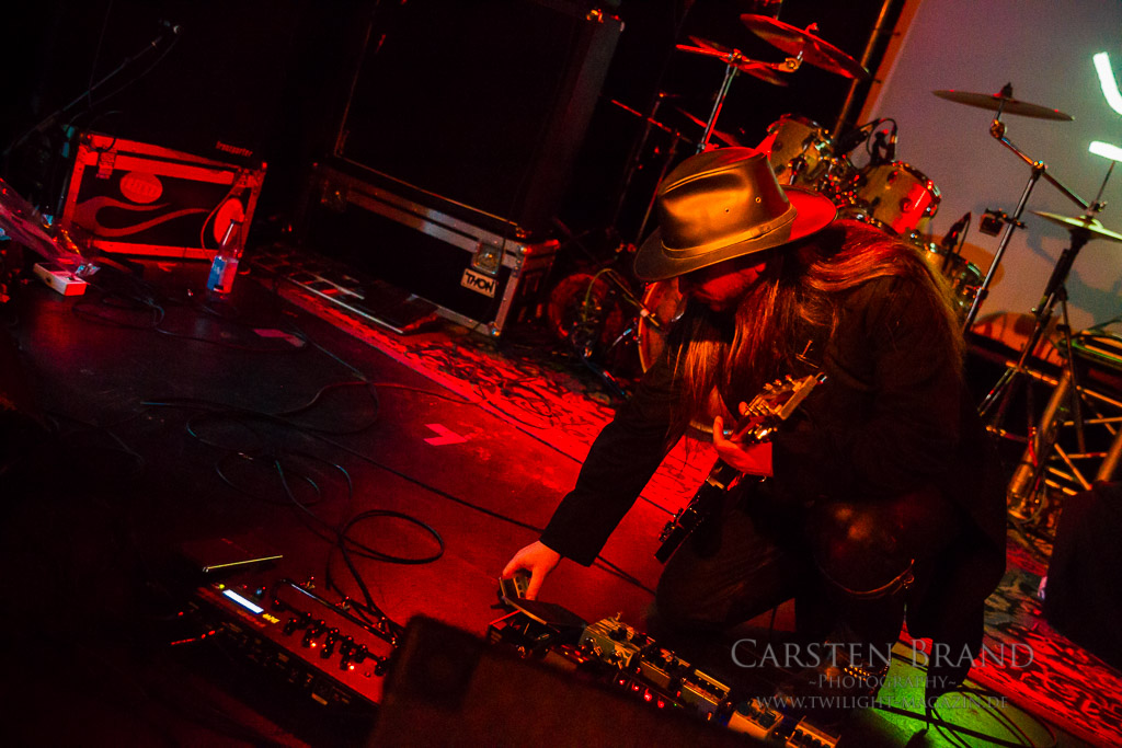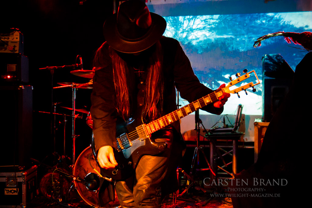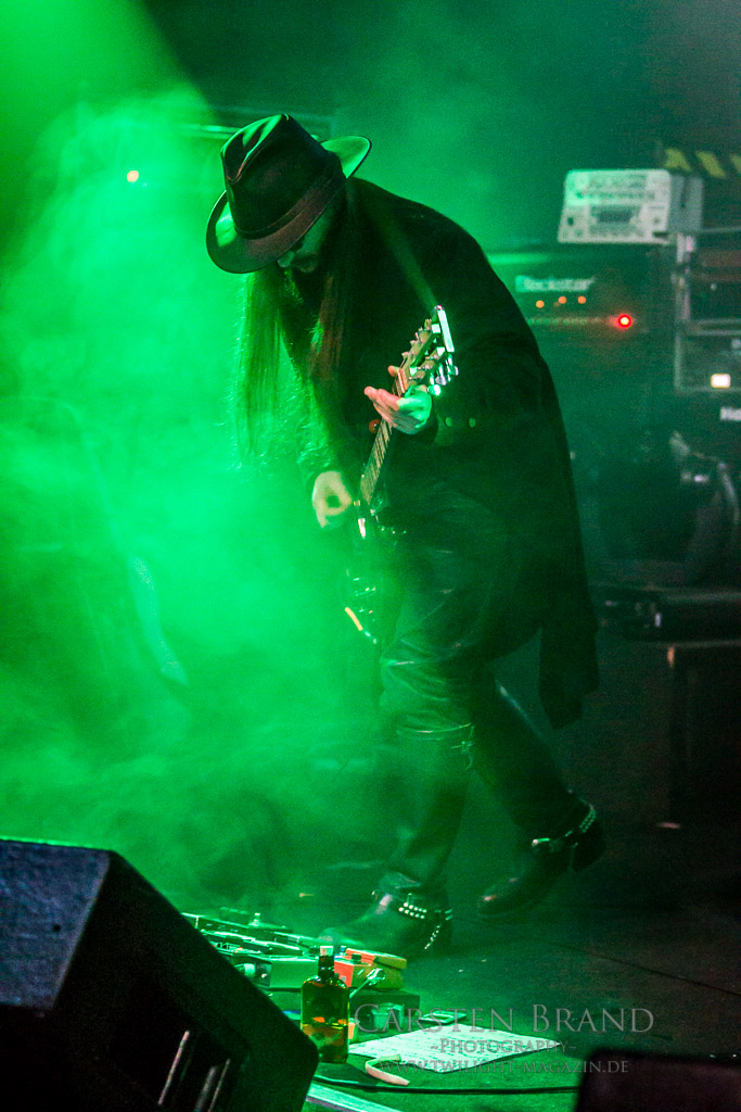 Also auf nach Hamburg. Das Konzert fiel auf einen Sonntag, nicht der beste Tag, um einen vollen Konzertsaal zu erwarten. Dennoch fanden viele Fans den Weg in das kleine Marx. Die erste Vorband war niemand geringerer als Aggalochs Mastermind JOHN HAUGHM. Als Solokünstler betrat er allein mit seiner Gitarre die Bühne. Eine extravagante und sehr spezielle Show. Auf seine experimentelle Gitarrenmusik muss man sich einlassen können. Hinzu kamen in Hamburg wohl technische Probleme, die den Auftritt erschwerten. Jedenfalls war es sehr schwer, dem kompletten Auftritt zu folgen.