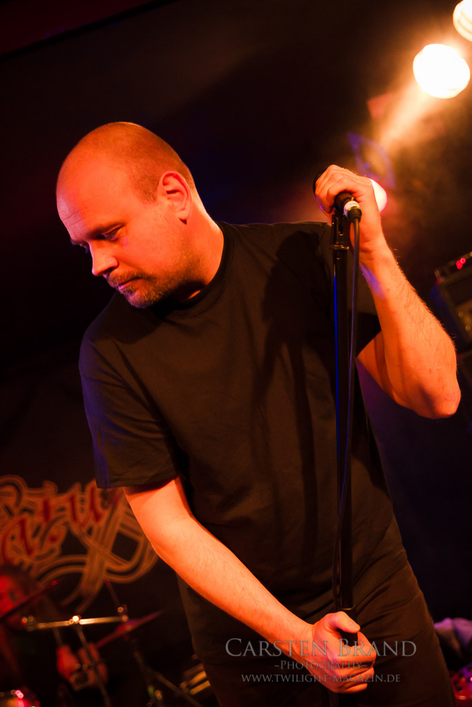Schon einfacher war da der Auftritt von SATURNUS. Zwar schwingt auch hier eine reichliche Portion Doom mit und die Musik ist vergleichsweise schwere Kost, doch kommt mit den Dänen auch das Publikum in Fahrt. „Rain wash Me“ als Opener führt hinein in ein schleppendes Meer aus tiefen Growls unterstützt von schweren Gitarren. Auf SATURNUS muss man sich einlassen können und das kleine Marx ist selbst an diesem Sonntag der ideale Ort dafür. Die niedrige Bühne schafft eine unheimliche Nähe zur Band. Augen zu und abtauchen in eine fantastische, tief düstere Welt. Zwischen den Reihen sieht man auch einige Leute Headbangen. „Wind Torn“ und „Empty Handed“ seien als herausragende Stücke des Abends zu erleben. Sänger Thomas zeigt keine große Bühnenshow, doch wäre eine solche auch reichlich fehl am Platz bei derart Musik.