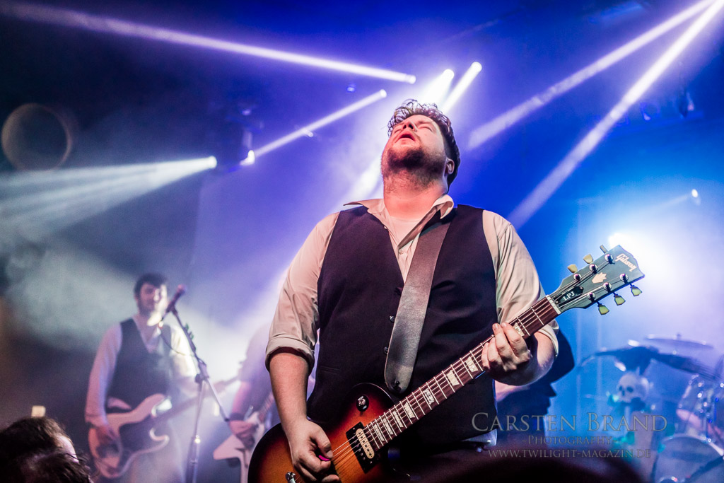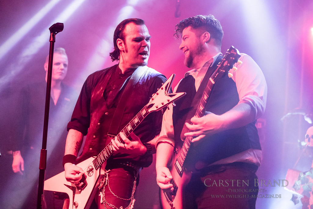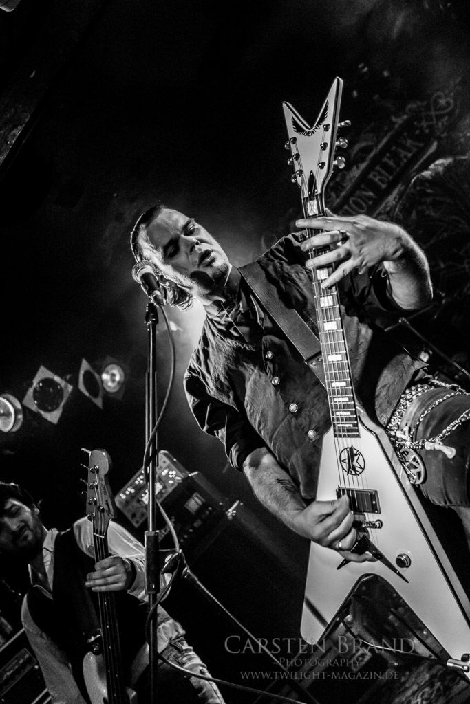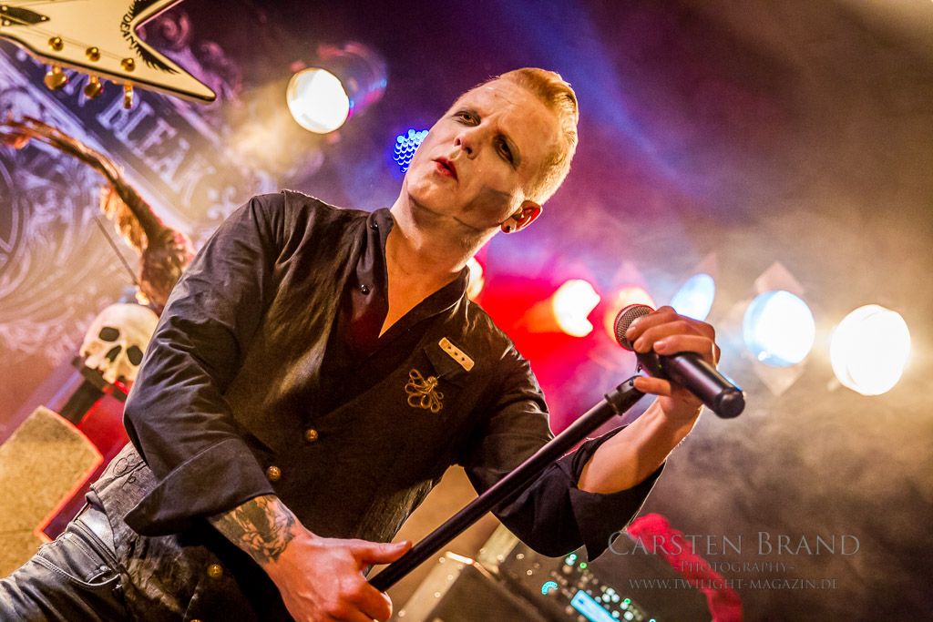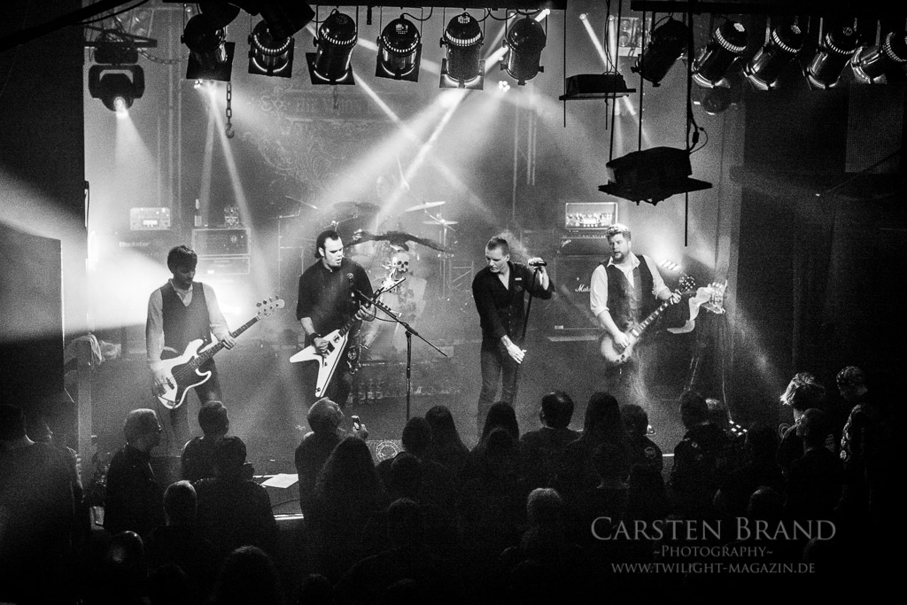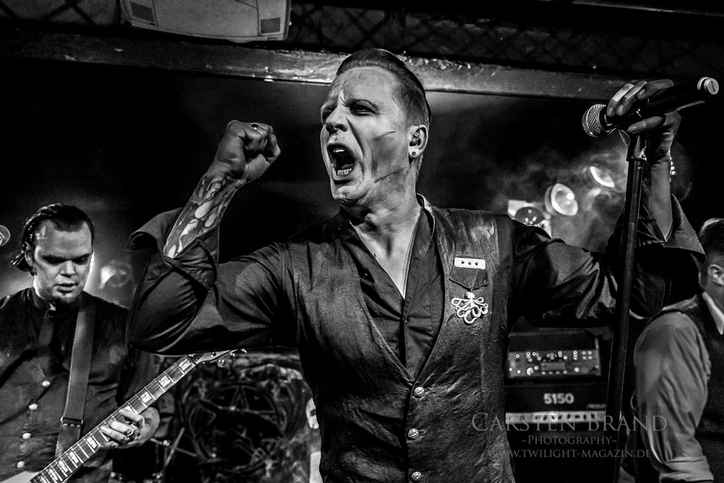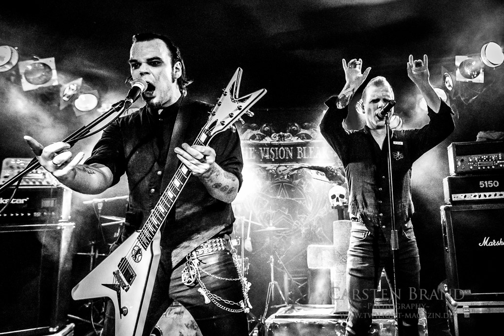 Nach kurzer Umbaupause wird es ein wenig voller im kleinen Marx und es ist Zeit für den Headliner. THE VISION BLEAK haben die Arbeiten zum neuen Album gerade abgeschlossen, eine EP gibt es bereits am Merch in Vinyl und CD Form zu ergattern. Passend dazu kommt die INTO THE UNKNOWN -Tour daher. Mit sichtlicher Spielfreude und einer gehörigen Portion Motivation betreten die Herren Schwadorf, Konstanz und Co die Bühne. Mit „Spirit oft he dead“ geht es hinein in eine schaurig schöne Setlist. „Night oft he living dead“ ist zwar eines der älteren Stück, funktioniert aber immer. Neben einer perfekt eingespielten Band, ist auch das Publikum nun mehr als warm und geht fleißig mit. „The Kindred of the sunset“ war bereits als Vorab Video im Netz zu bewundern und auch live überzeugt der Titel auf ganzer Linie. Weiter geht es quer durch den Vision Bleak´schen Gemüsegarten. Eine fantastische Zeitreise aus neuen und alten Stücken, was die Fans ordentlich in Stimmung bringt. Mit „The Lone Night Rider“ schließt eine großartige Setlist und die Band verabschiedet sich in den Feierabend, nicht ohne noch fleißig Autogramme am Merch Stand zu geben.