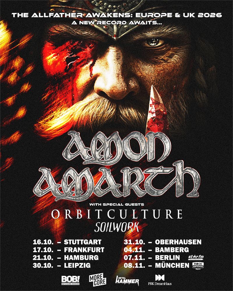 The Allfather Awakens Tour 2026 – Amon Amarth mit Orbit Culture und Soilwork:9.10. UK, Manchester, O2 Apollo10.10. UK, London, Eventim Apollo11.10. UK, Wolverhampton, Civic Hall13.10. Frankreich, Paris, Zenith14.10. Luxemburg, Esch sur Alzette, Rockhal16.10. Deutschland, Stuttgart, Schleyer Halle17.10. Deutschland, Frankfurt, Festhalle18.10. Belgien, Antwerpen, Lotto Arena20.10. Niederlande, Den Bosch, Mainstage21.10. Deutschland, Hamburg, Sporthalle23.10. Schweden, Göteborg, Scandinavium24.10. Schweden, Stockholm, Hovet26.10. Finnland, Helsinki, Ice Hall27.10. Estland, Tallinn, Unibet Arena29.10. Polen, Gliwice, PreZero Arena Gliwice30.10. Deutschland, Leipzig, Quarterback Immobilien Arena31.10. Deutschland, Oberhausen, Rudolf Weber Arena02.11. Ungarn, Budapest, Barba Negra03.11. Österreich, Wien, Gasometer04.11. Deutschland, Bamberg, Brose Arena06.11. Tschechien, Prag, O2 Universum07.11. Deutschland, Berlin, Velodrom08.11. Deutschland, München, Zenith10.11. Italien, Mailand, Alcatraz11.11. Schweiz, Zürich, The Hall13.11. Spanien, Barcelona, Sant Jordi Club14.11. Spanien, Madrid, Vistalegre15.11. Portugal, Lissabon, Sala Tejo
