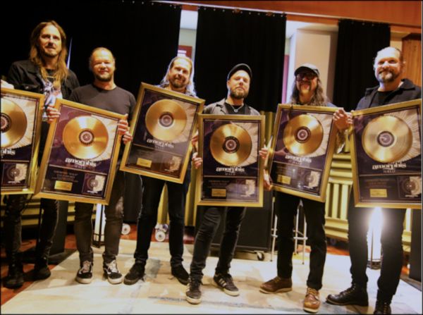 Unter einem Vorwand in die Sonic Pump Studios gelockt, sind die finnischen Metal-Ikonen AMORPHIS von ihrem Label Reigning Phoenix Music (RPM) aufgrund herausragender Verkäufe ihres 2022er Werks „Halo“ mit goldenen Schallplatten ausgezeichnet worden. Vor Ort traf die Band auf ihr Management sowie Vertriebspersonal und Medien, die der Verleihung in den legendären finnischen Tonstudios beiwohnten, in denen das Sextett über die Jahre neben einigen älteren Alben auch Teile von „Halo“ aufgenommen hat. Eine wohlverdiente Pause, in der AMORPHIS von dem Erhalt der glänzenden Platten angenehm überrascht wurden, da sie aktuell anlässlich ihres kommenden Albums „Borderland“ (VÖ: 26. September 2025) mit einer Vielzahl an Interviews sowie den Vorbereitungen für die sich anschließenden Liveaktivitäten beschäftigt sind.