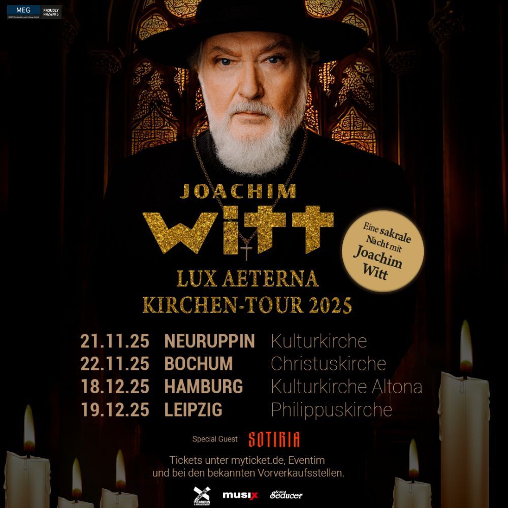 „Lux Aeterna Tour – Eine sakrale Nacht mit Joachim Witt“ entführt das Publikum in eine Welt, in der Klang und Licht auf mystische Weise verschmelzen. In ehrwürdigen Kirchen entfaltet sich eine besondere Stimmung: Hunderte Kerzen flackern sanft, während farbiges Licht durch die jahrhundertealten Fenster fällt.