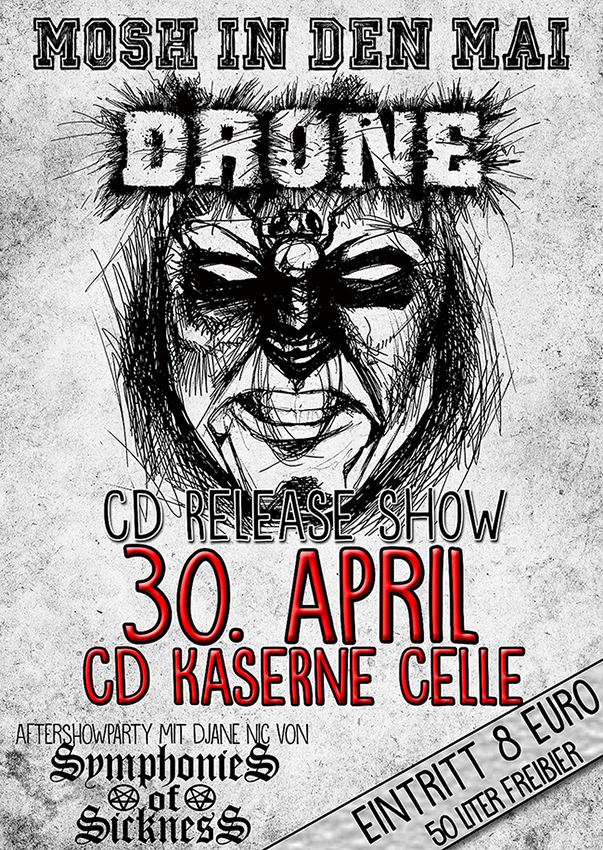 Heute erscheint das vierte, selbstbetitelte Werk der Celler DRONE im Handel. Wer der Jungs noch nicht live gesehen hat, sollte sich das am 30.04.14 nicht entgehen lassen. Im Anschluss der Show wir mit DJANE NIC von Symphonies of Sickness in den Mai gefeiert!