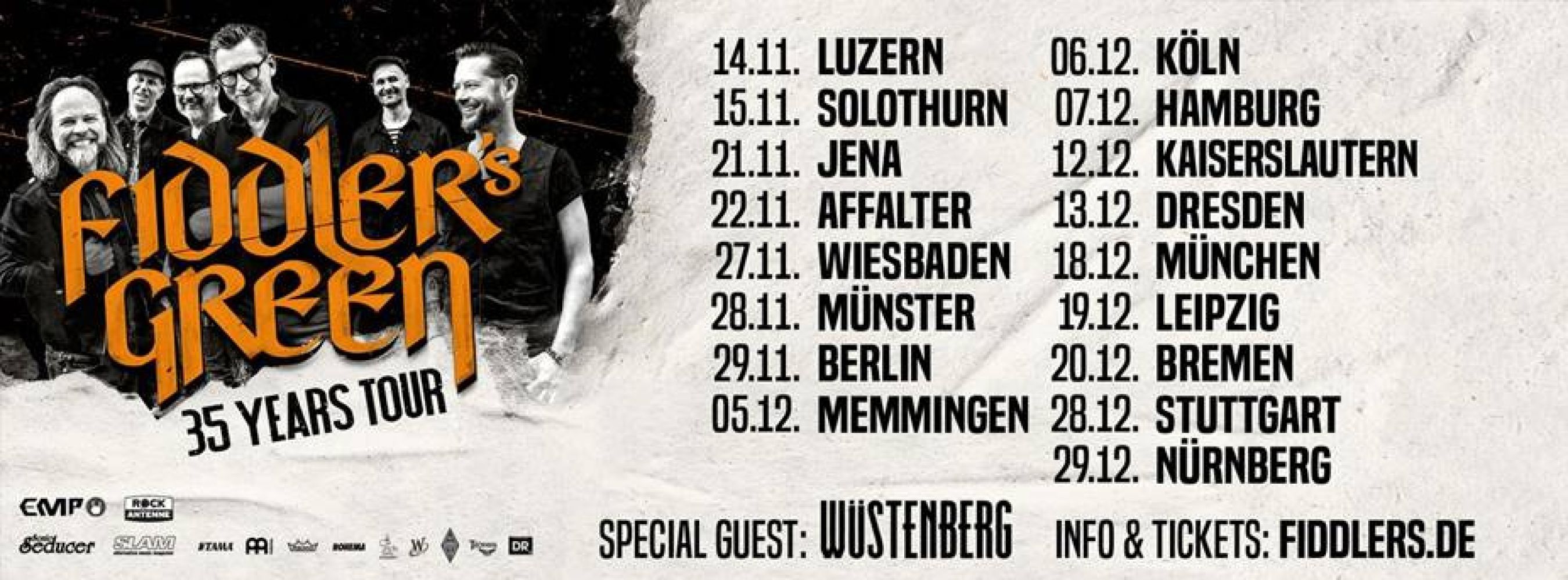 Zum Jubiläum gibt es eine exklusive Tour, die FIDDLER’s GREEN in die großen und kleinen Städte führt, wohin die Fans die Band all die Jahre begleitet hat. Es werden die größten Hits, die liebsten Klassiker und vielleicht auch der ein oder andere seltene Song aus der Vergangenheit auf die Bühne gebracht werden. Und als besonderes Highlight haben FIDDLER’s GREEN sogar einige brandneue Songs im Gepäck, die sie live auf der Jubiläumstour vorstellen werden!