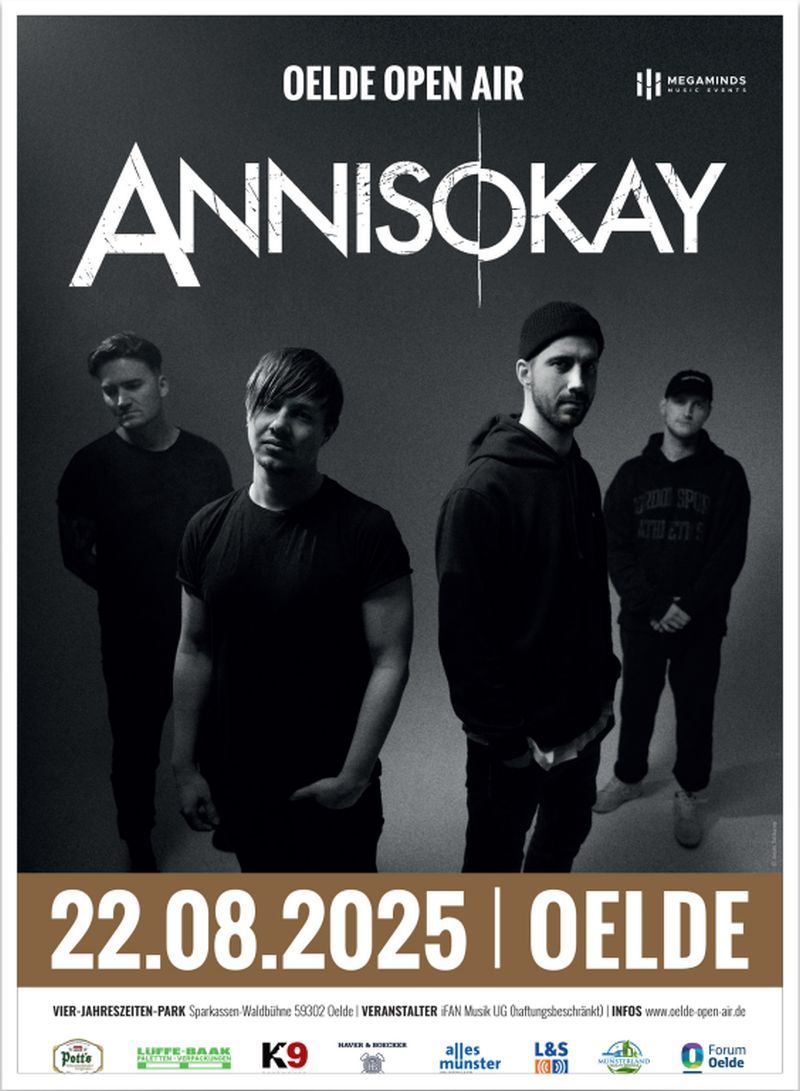 Am Freitag, den 22. August 2025, wird das Oelde Open Air zum Hotspot für erstklassigen Metalcore. Mit ANNISOKAY konnte einer der international erfolgreichsten deutschen Metalcore-Acts als Headliner gewonnen werden. Die Band blickt auf Millionen Streams, weltweite Tourneen und gefeierte Festivalauftritte zurück. Bekannt für ihre explosive Live-Energie, ihren starken Social-Media-Auftritt und ihre treue Fanbase in ganz Europa, liefern ANNISOKAY eine Show voller Power, Emotion und Eskalation auf höchstem Niveau. Mit ihrer aktuellen EP „Abyss Pt. II“, die Fans und Kritiker gleichermaßen begeistert, beweisen sie einmal mehr, warum sie zur Speerspitze des modernen Metalcore gehören.